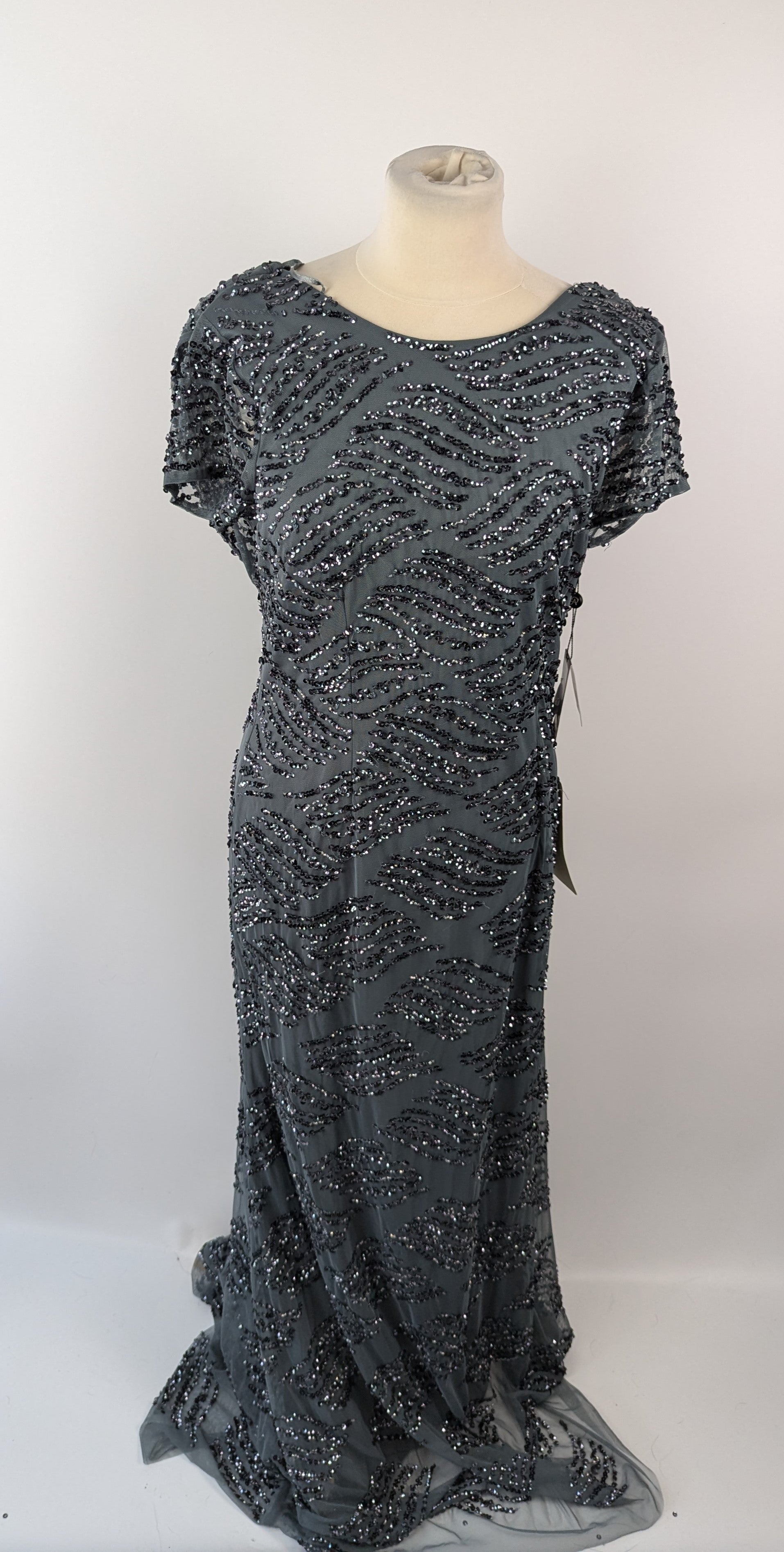 Made to celebrate our long gown boasts stunning allover handsewn beadwork that dance atop the soft mesh overlay. Sheer illusion short sleeves and no waist seam for a flattering fit. Designed to gently skim the bodice and eases to a floor-length mermaid skirt.