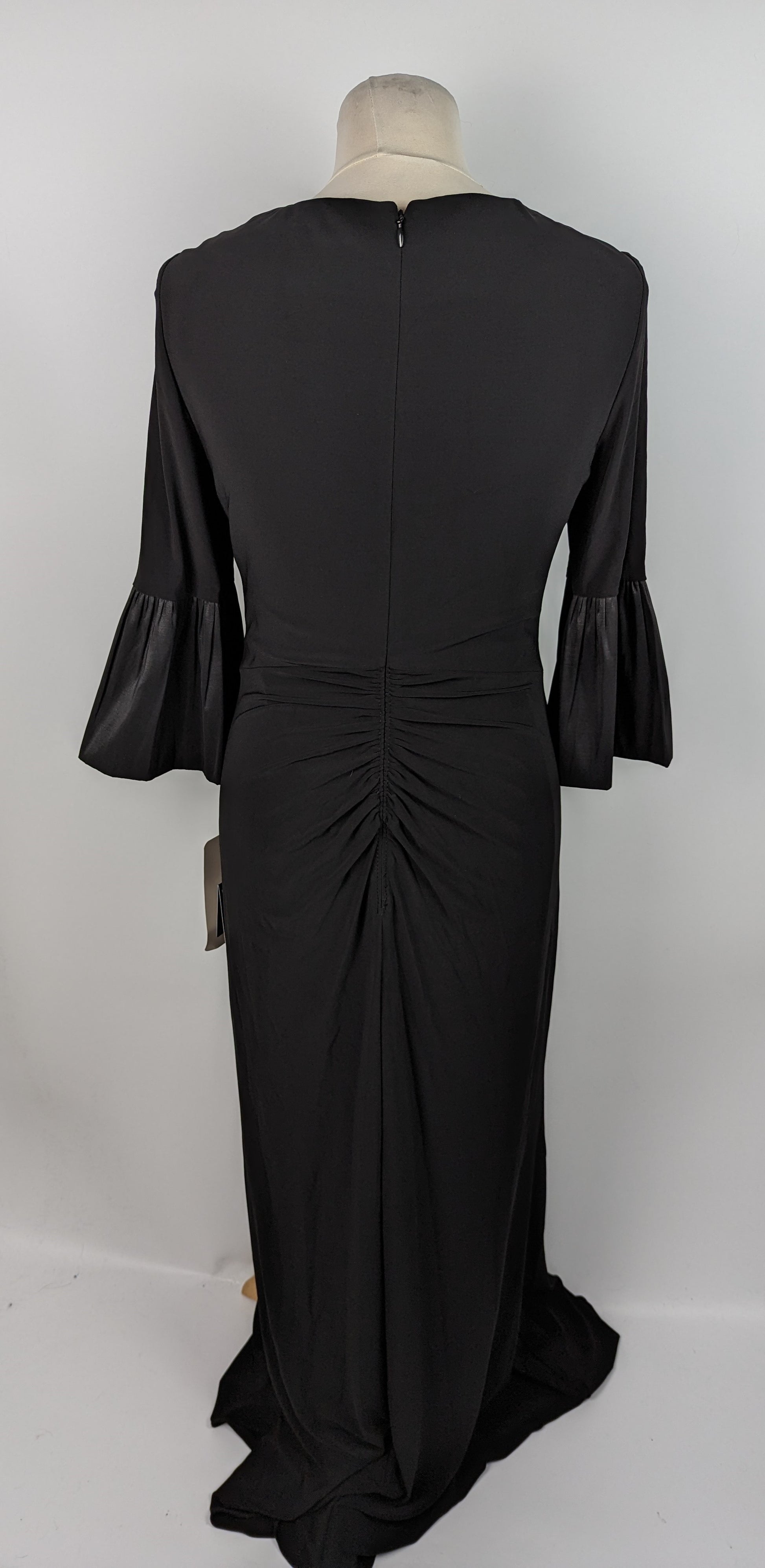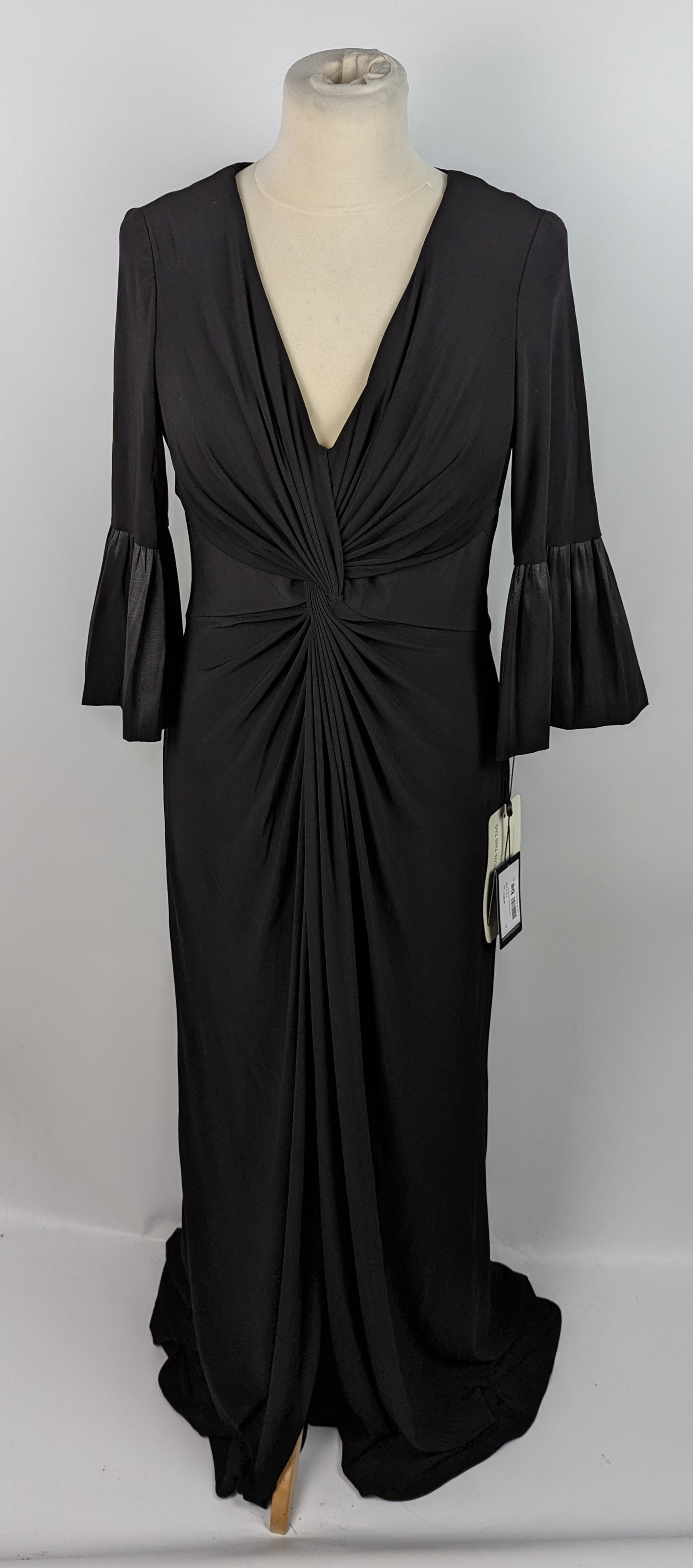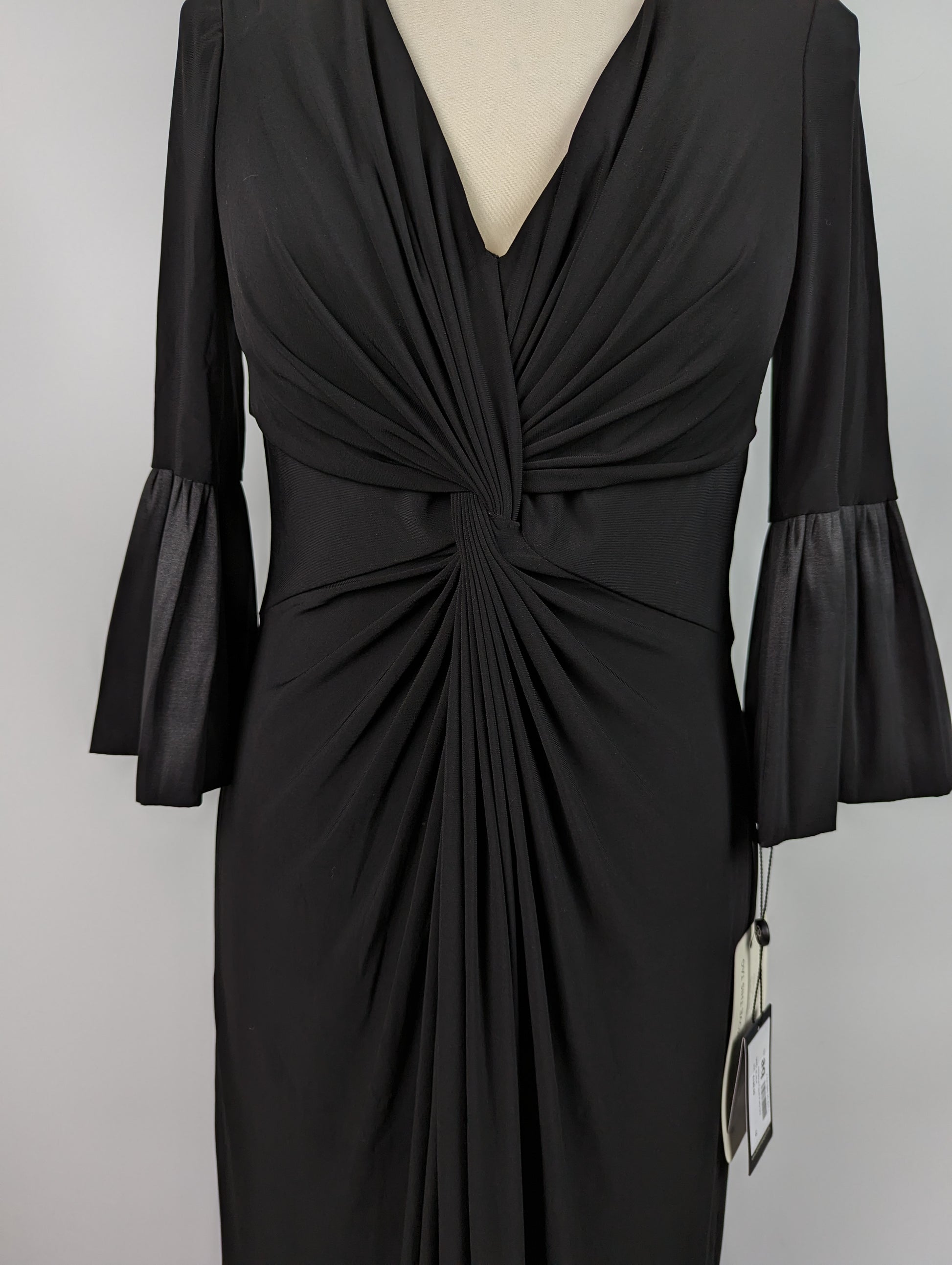 Timeless and glamorous, our floor-sweeping gown is crafted of a stretch jersey knit for a luxuriously soft look and feel. We love the figure-flatting twisted front and modern elbow sleeves with dramatic bell cuffs made of taffeta. All the details: flattering v-neckline and sleek back zip closure. Calling all mothers-of-the-bride, you’ll be a standout in your dress too.