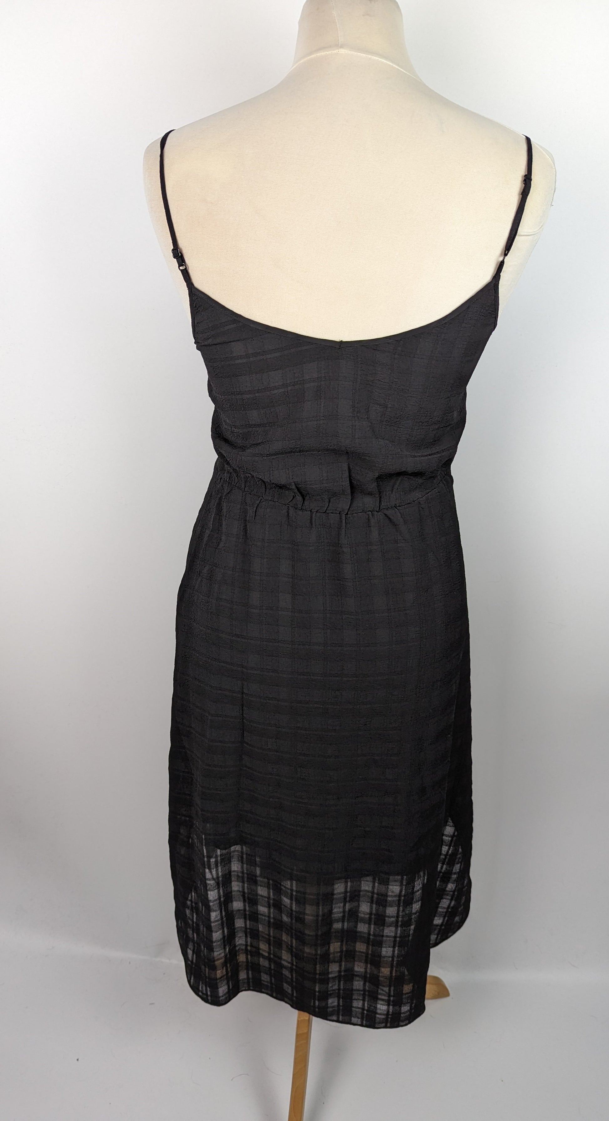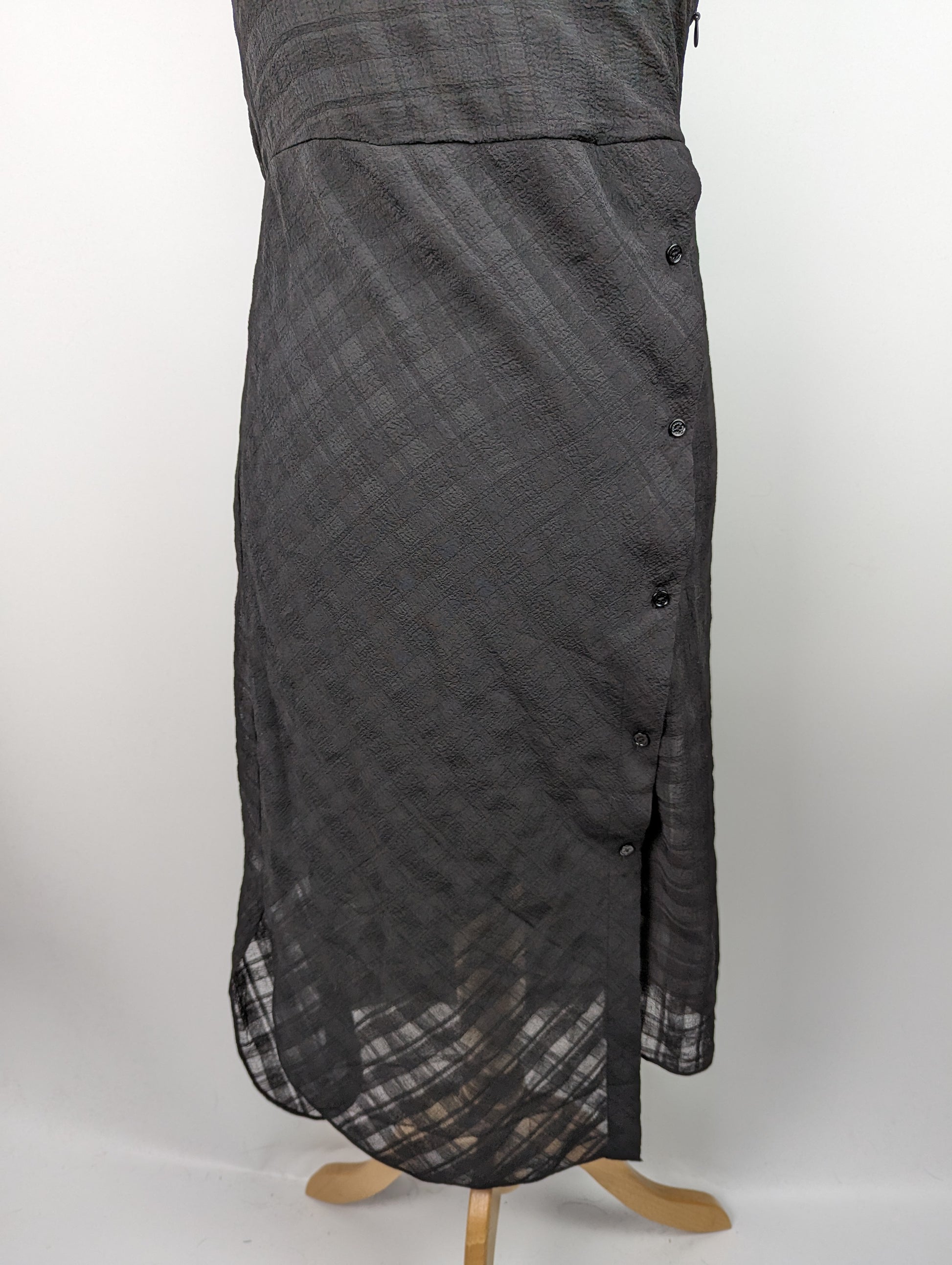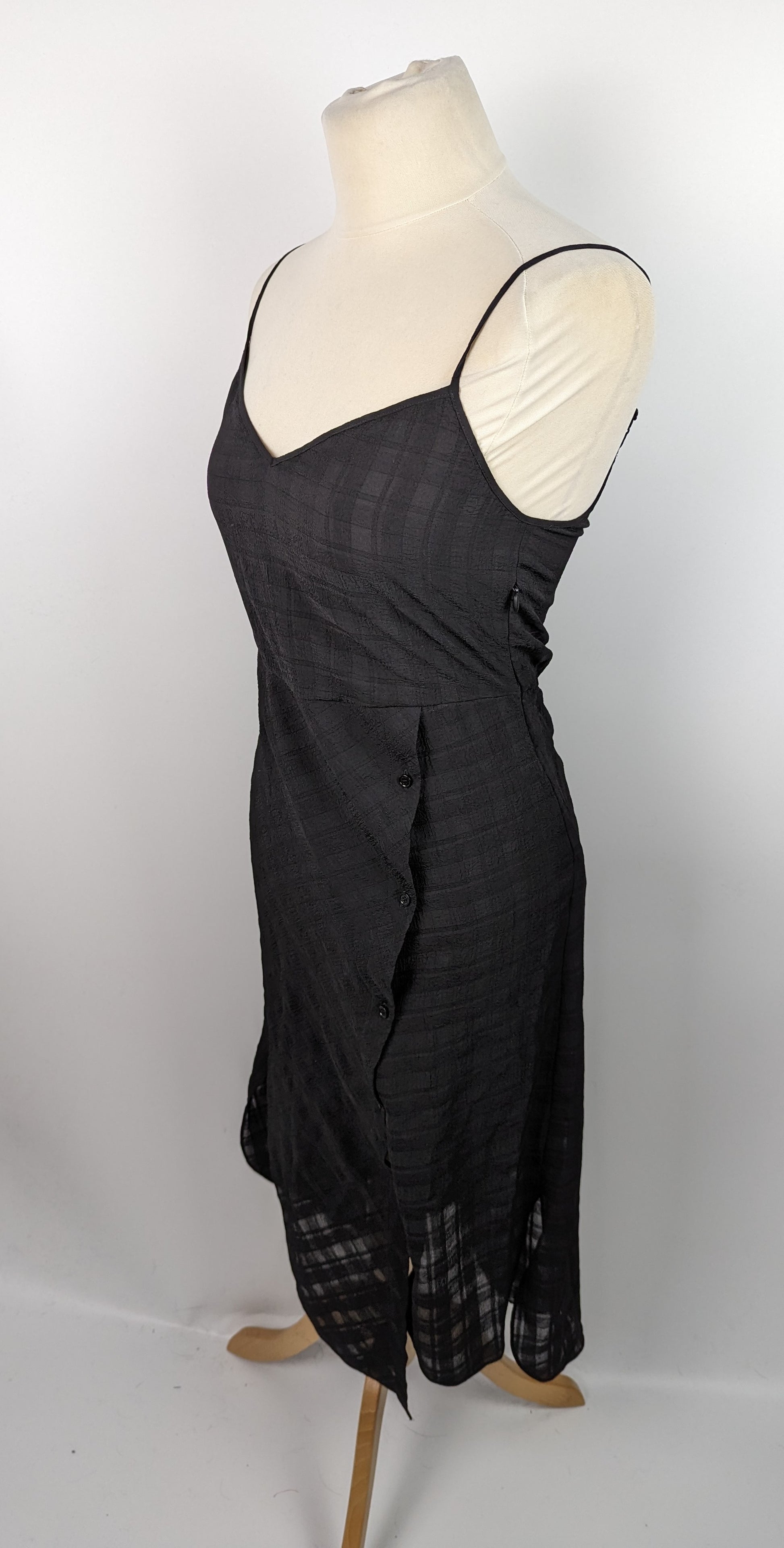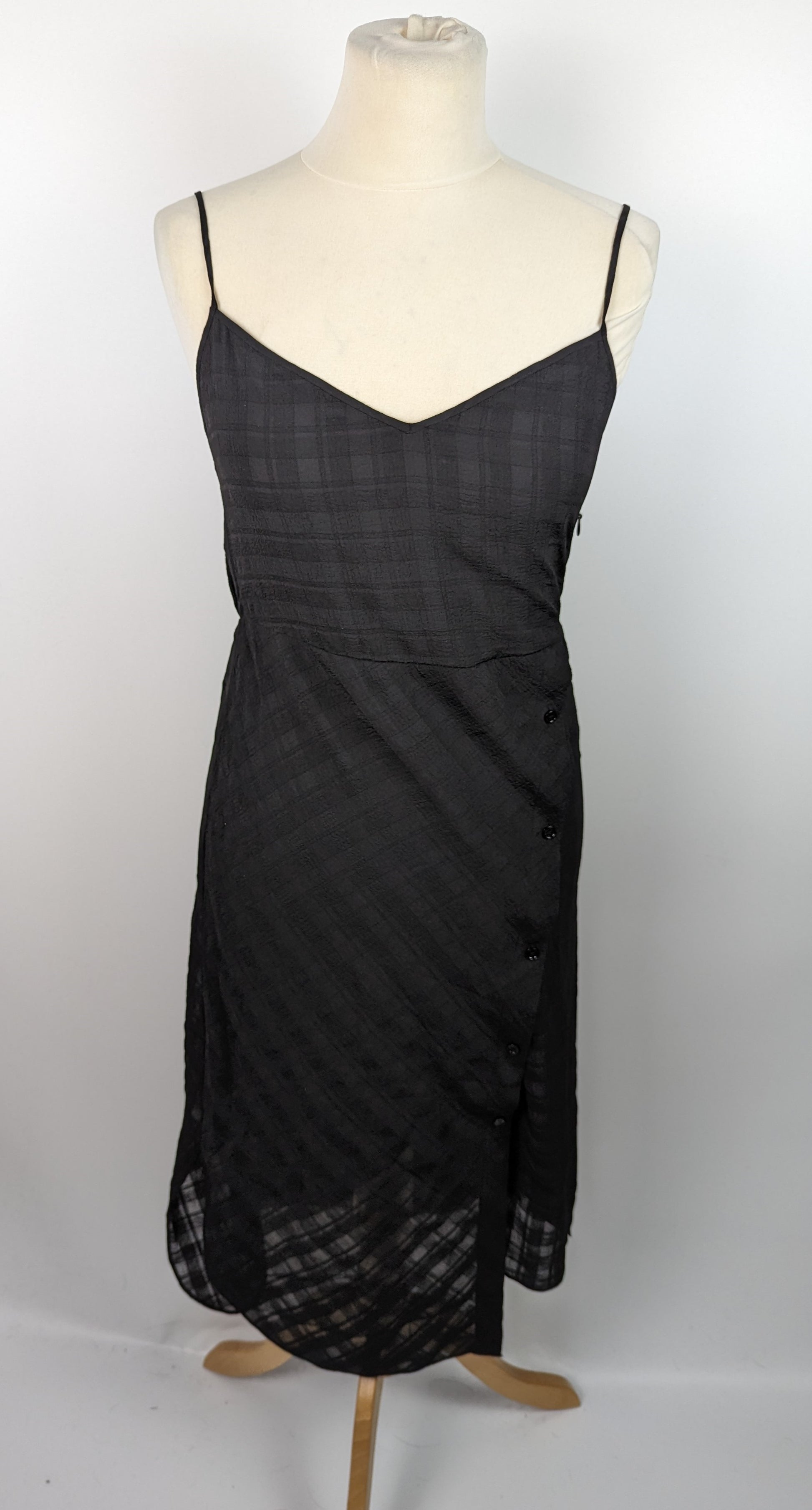The AllSaints Womens Agnes Black Slip Dress is a must-have piece. This dress features a black checked design, a unique stepped hem, and elegant buttons on the skirt. Comes with a zip at the side to fasten and adjustable straps.