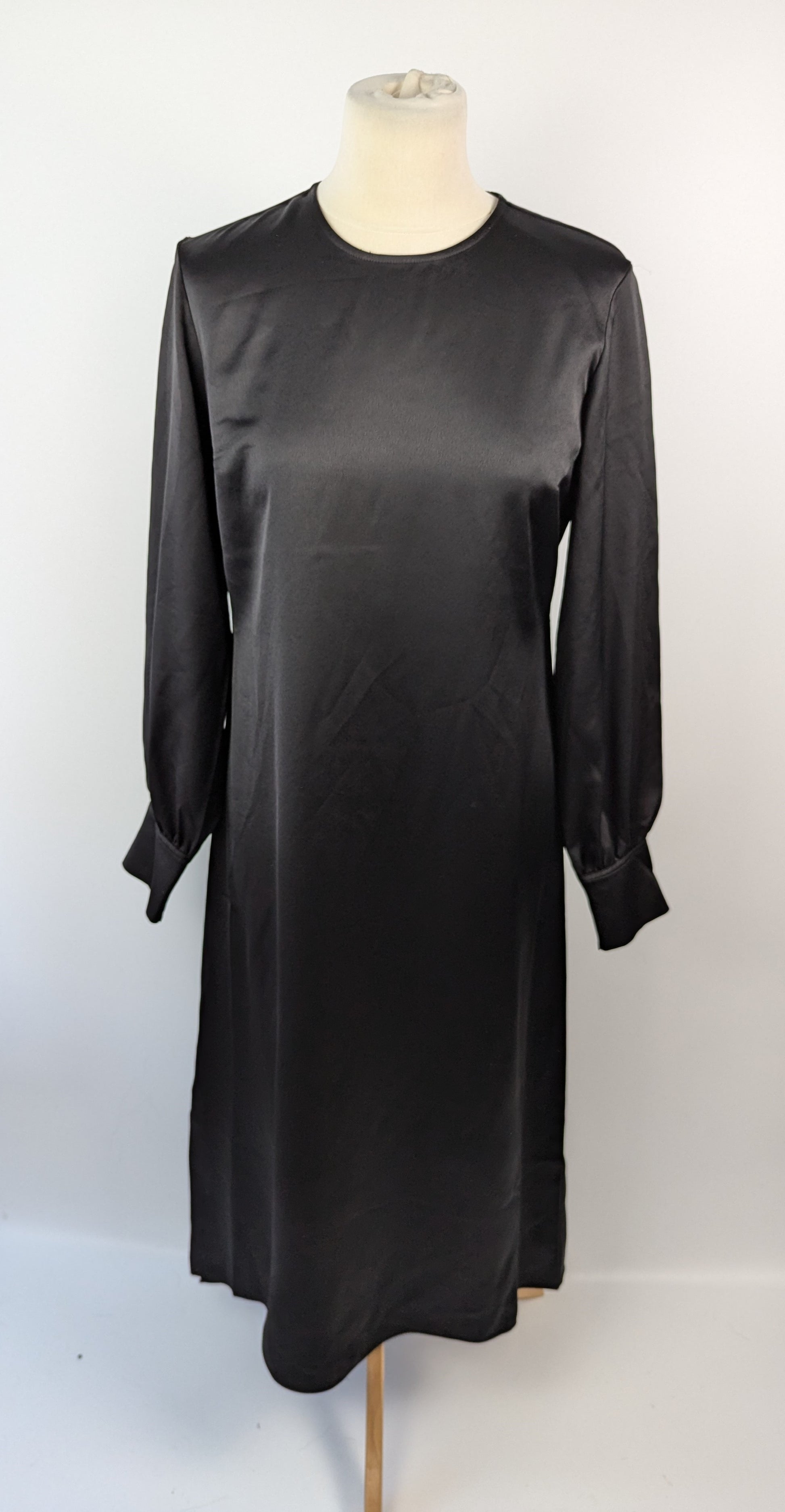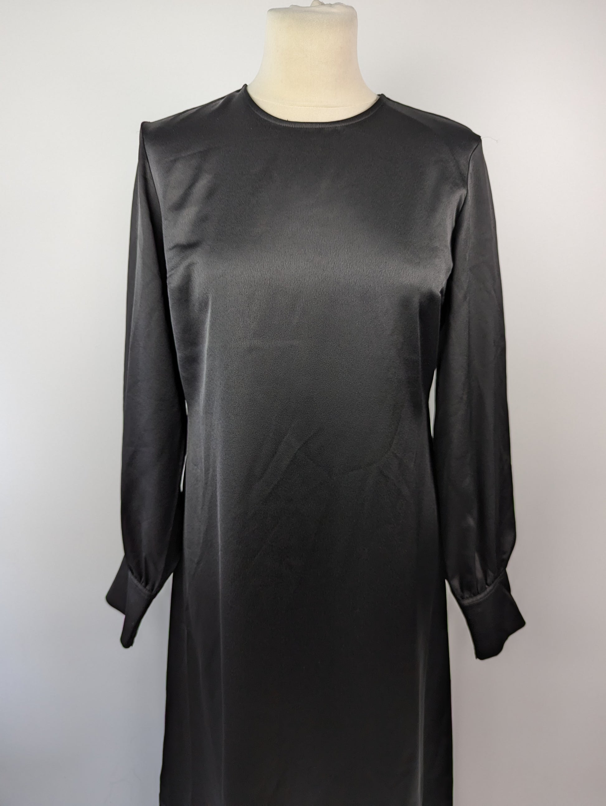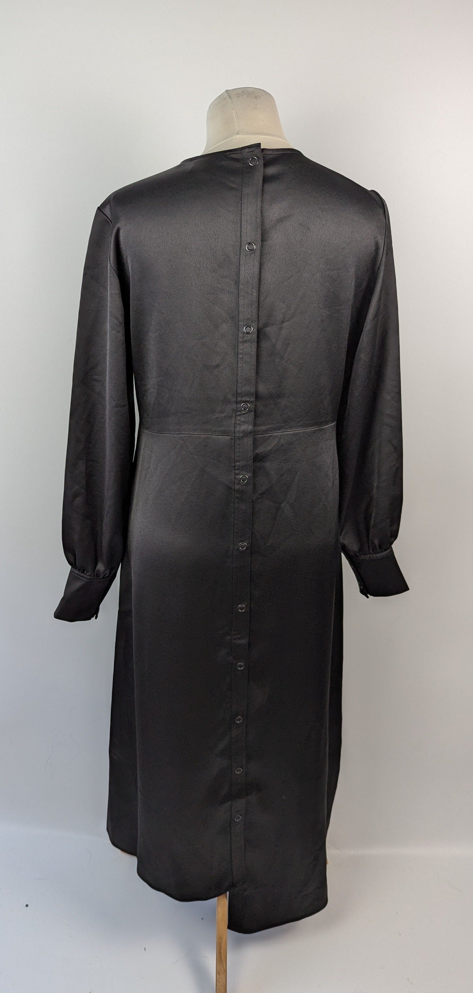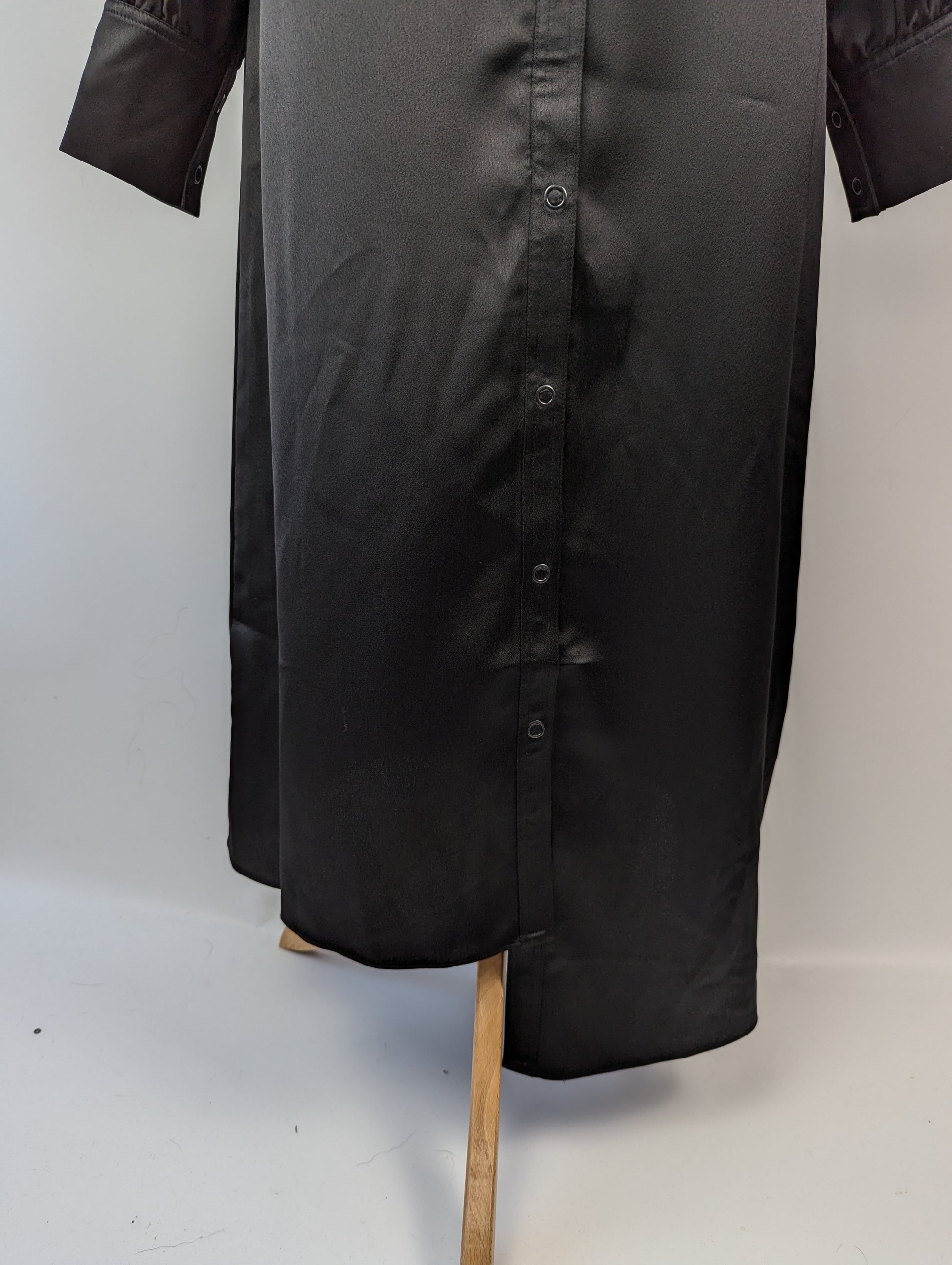 The ALLSAINTS All Zoey Midi Dress in Black features button fastenings and long sleeves with cuffs. Its unique design includes a longer trim on one side than the other.