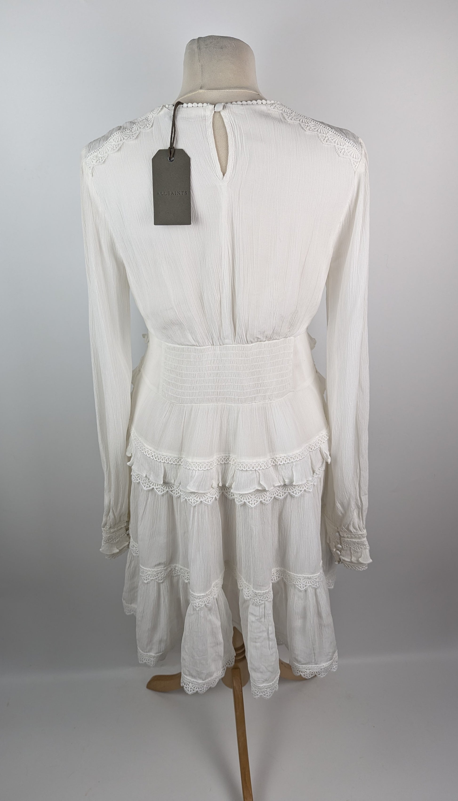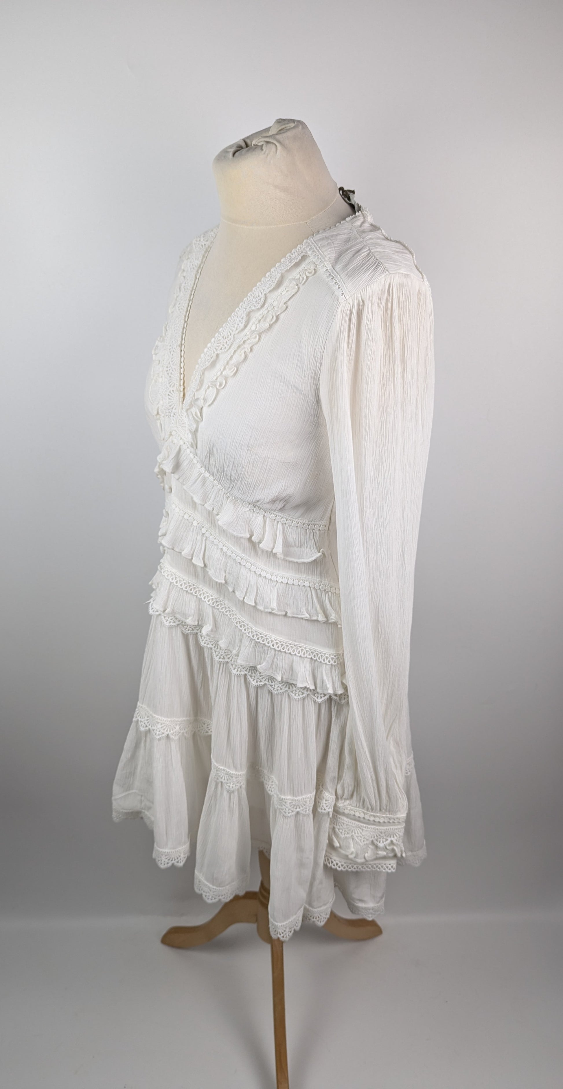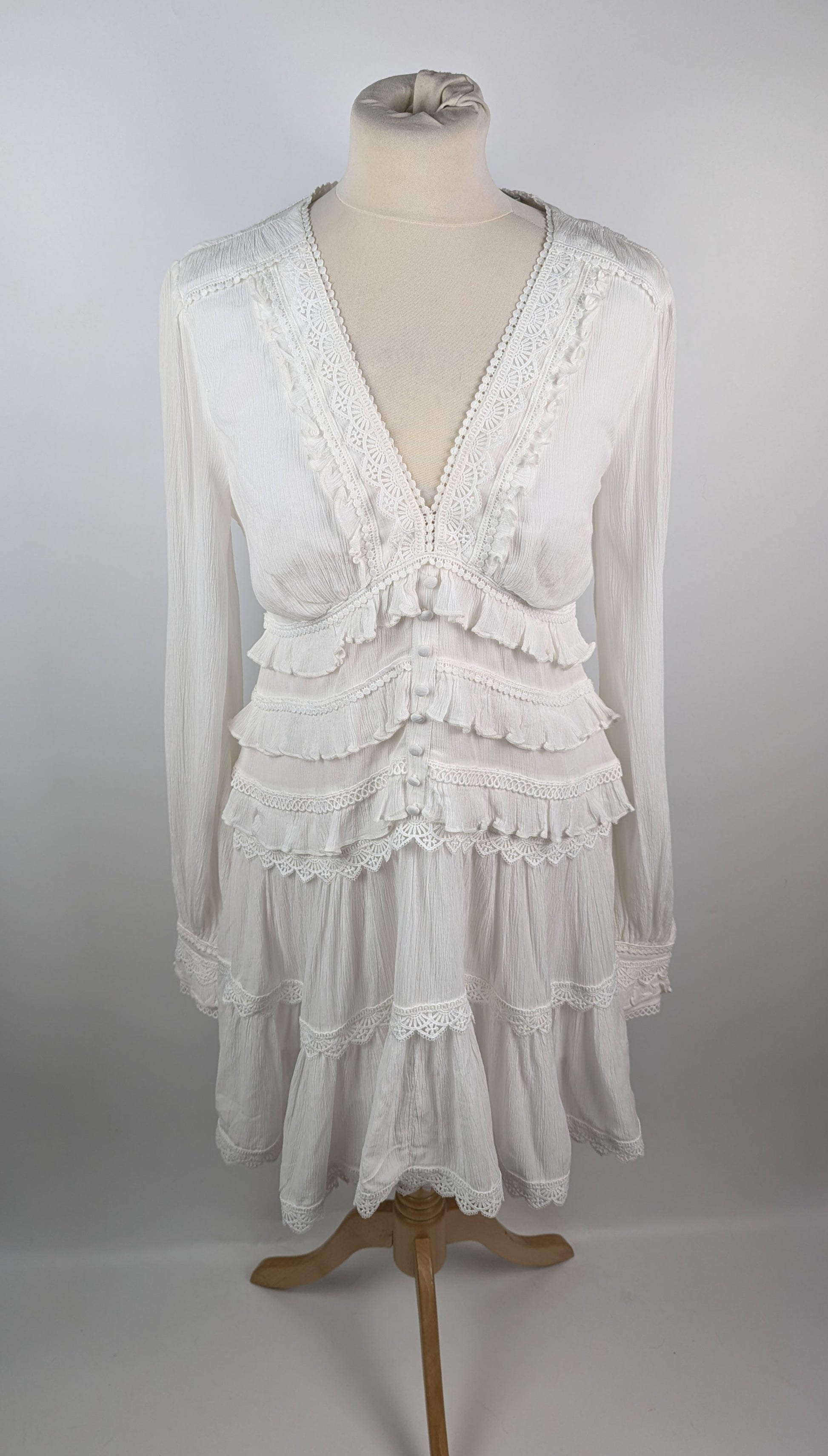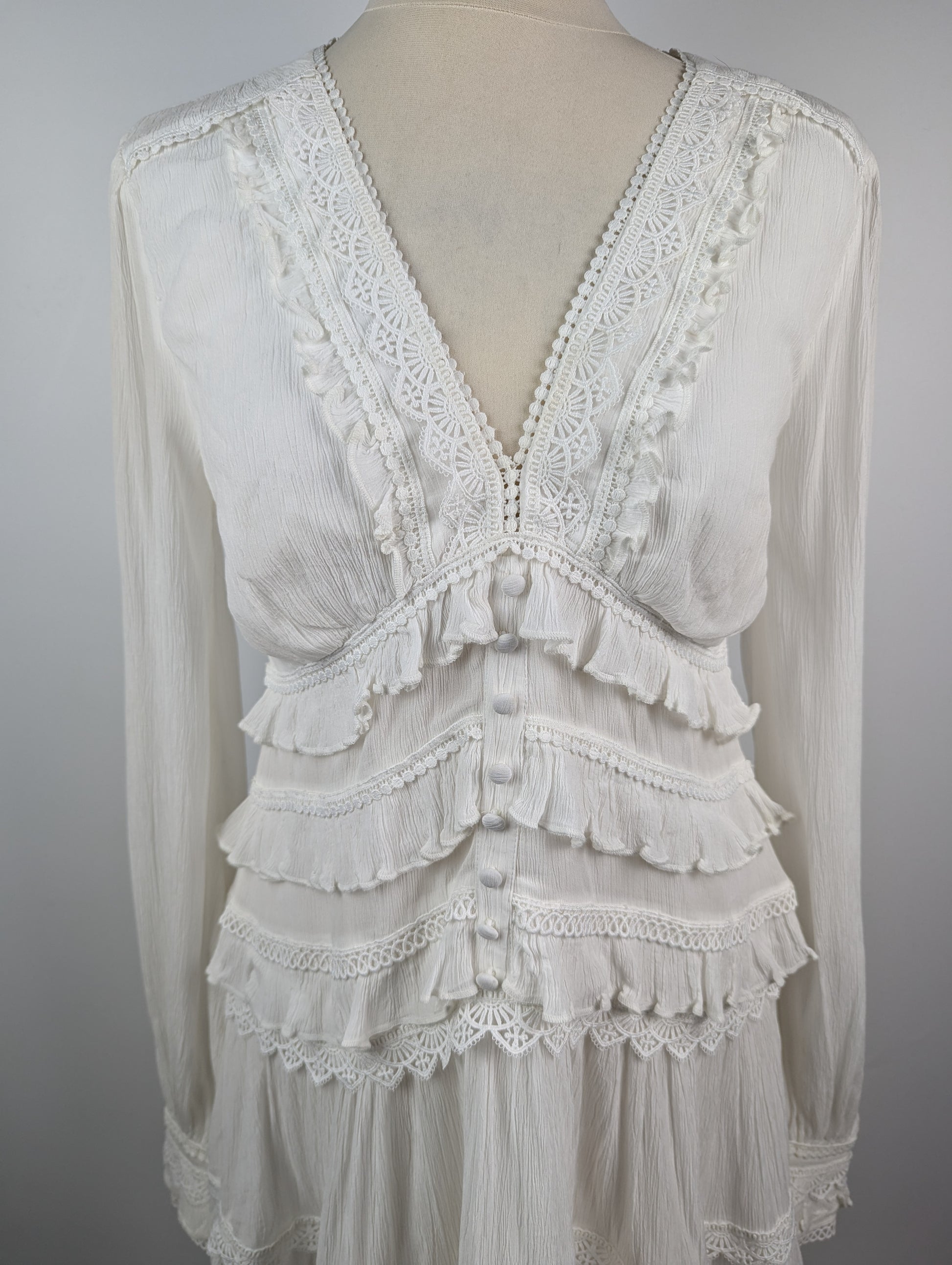The Zora is a mini-length style with ruffles. It's smocked for an easy fit with fabric covered buttons down the front. Lace trims really bring it all together. Team it with cowboy boots and leather jackets as the weather gets warmer.