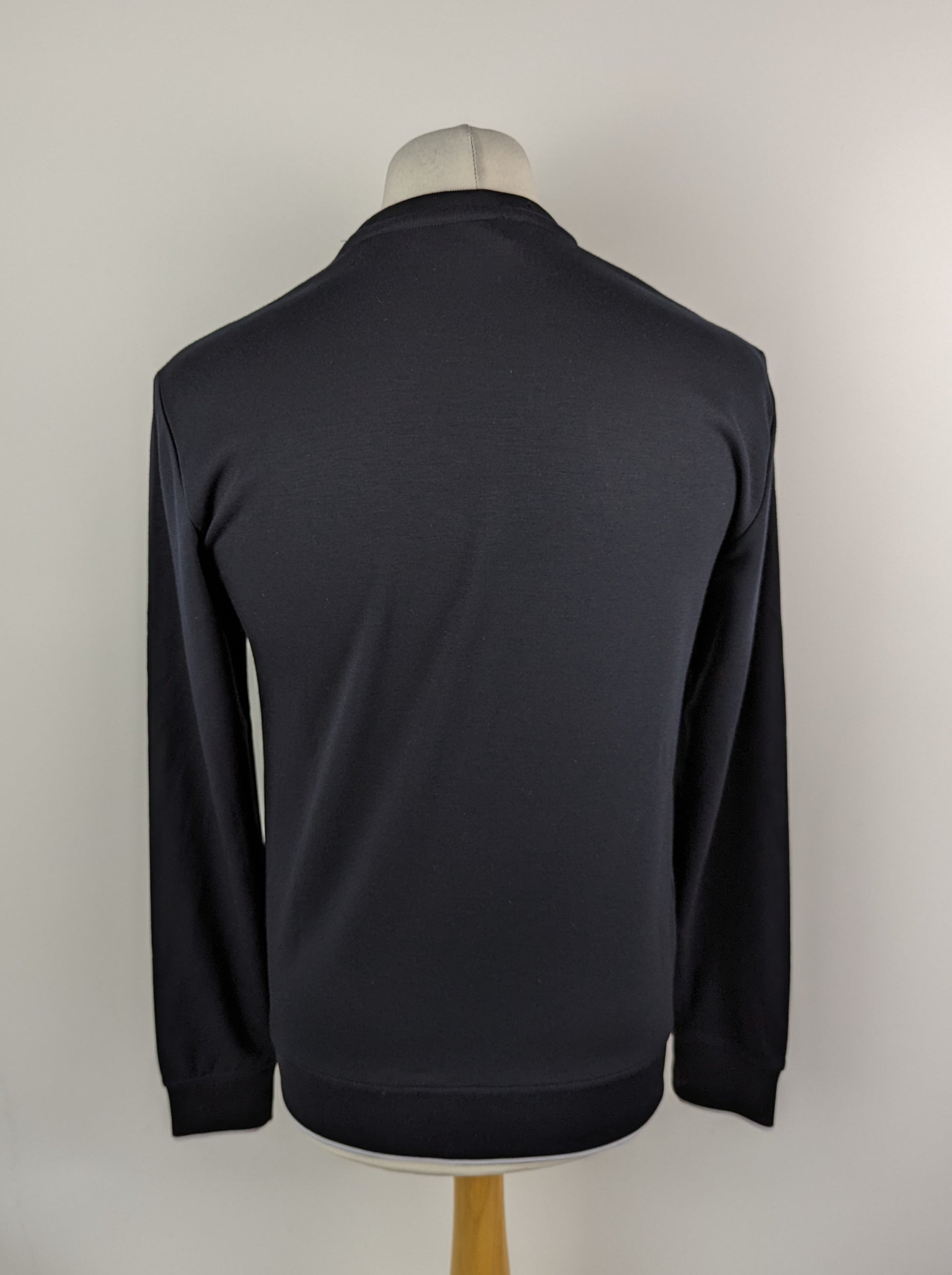 This navy Armani Exchange Men's Logo Circle Jumper offers a regular fit with a crew neckline, large circle logo, and ribbed cuffs and hem. Made of 68% polyester, 29% viscose, and 3% elastane, it provides both style and comfort.
