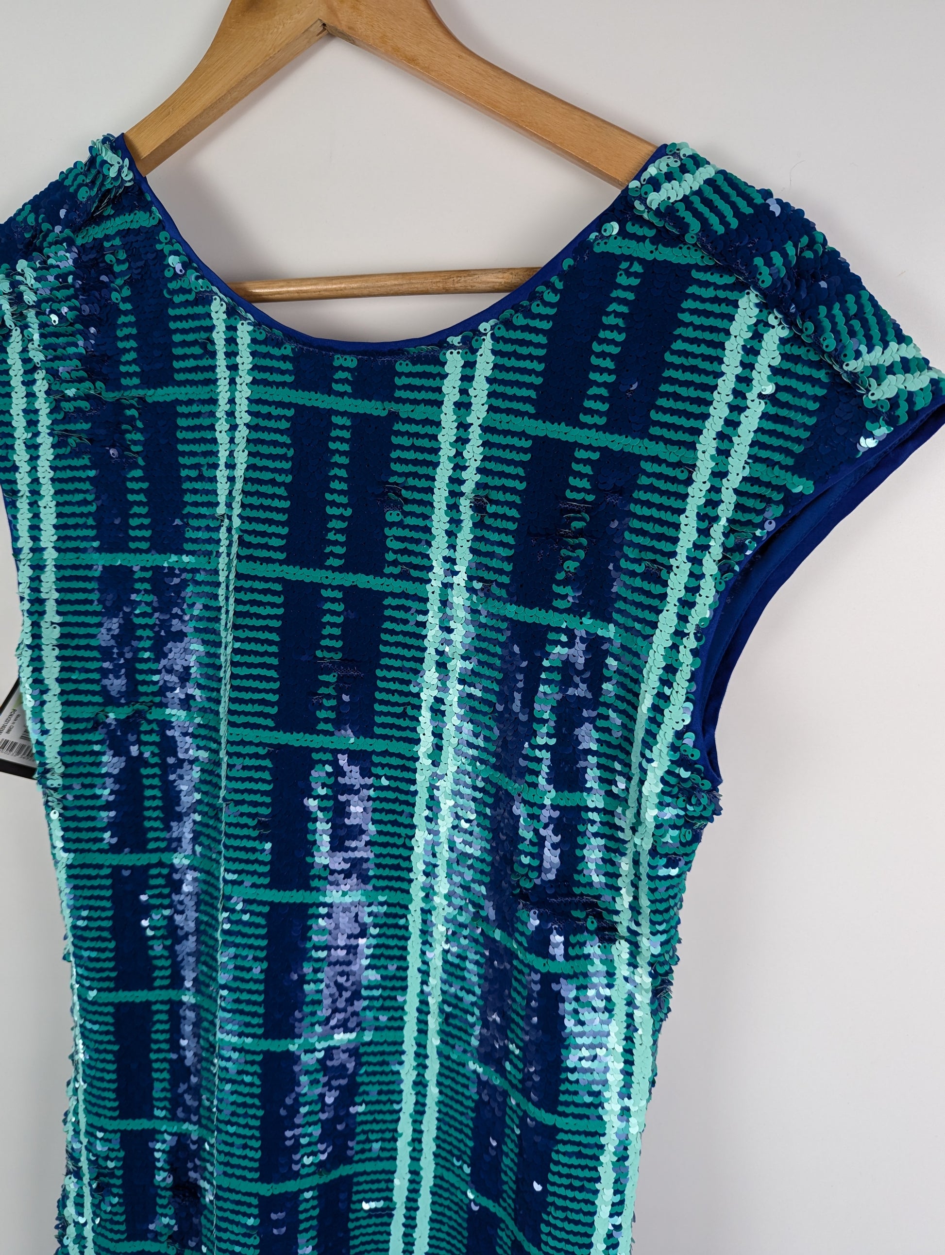 This short sequin dress, part of the ARMANI EXCHANGE collection, features a checked pattern made of sequins in shades of blue and green. The dress has a round collar and short sleeves, and is crafted from 100% polyester.