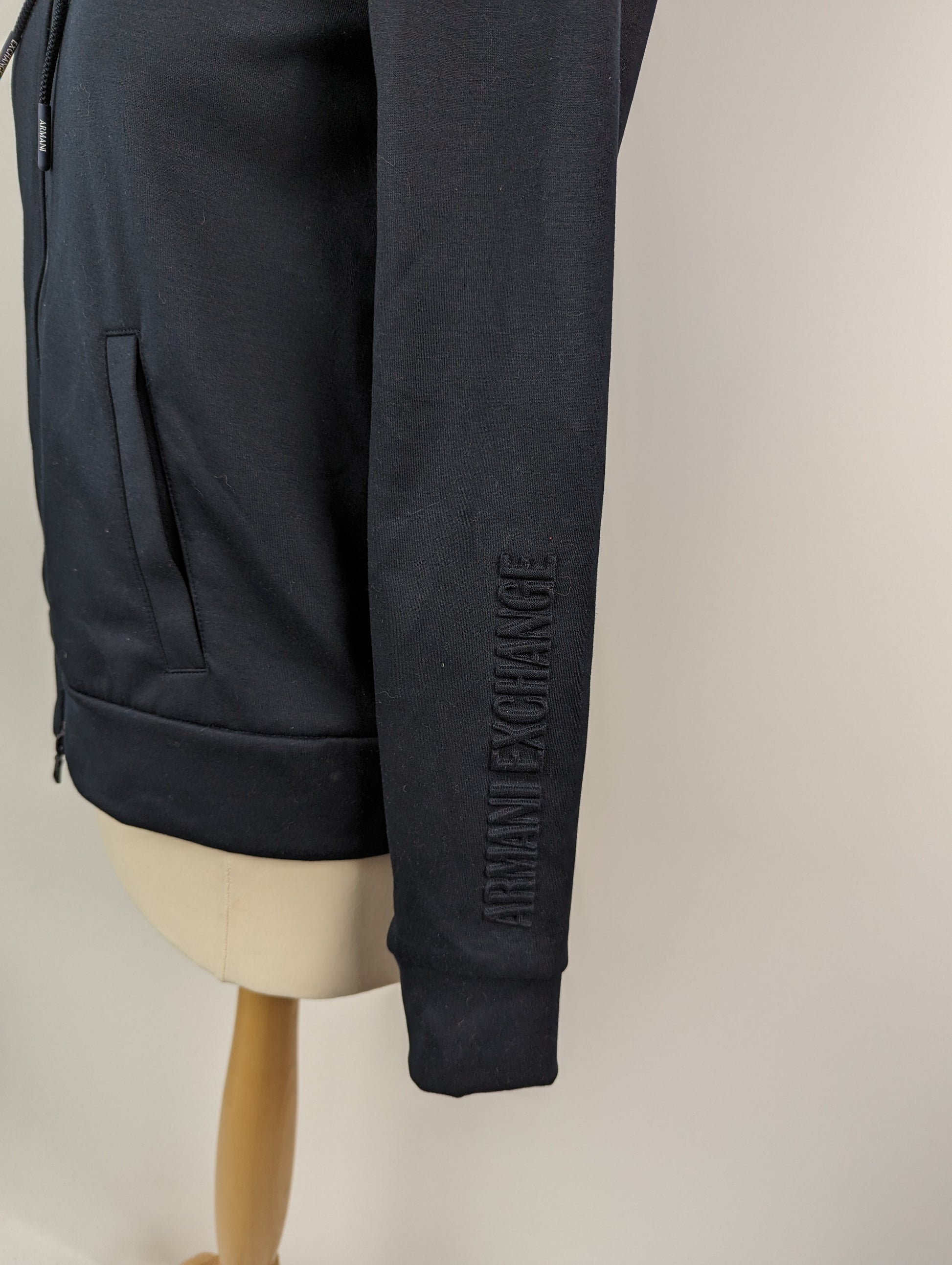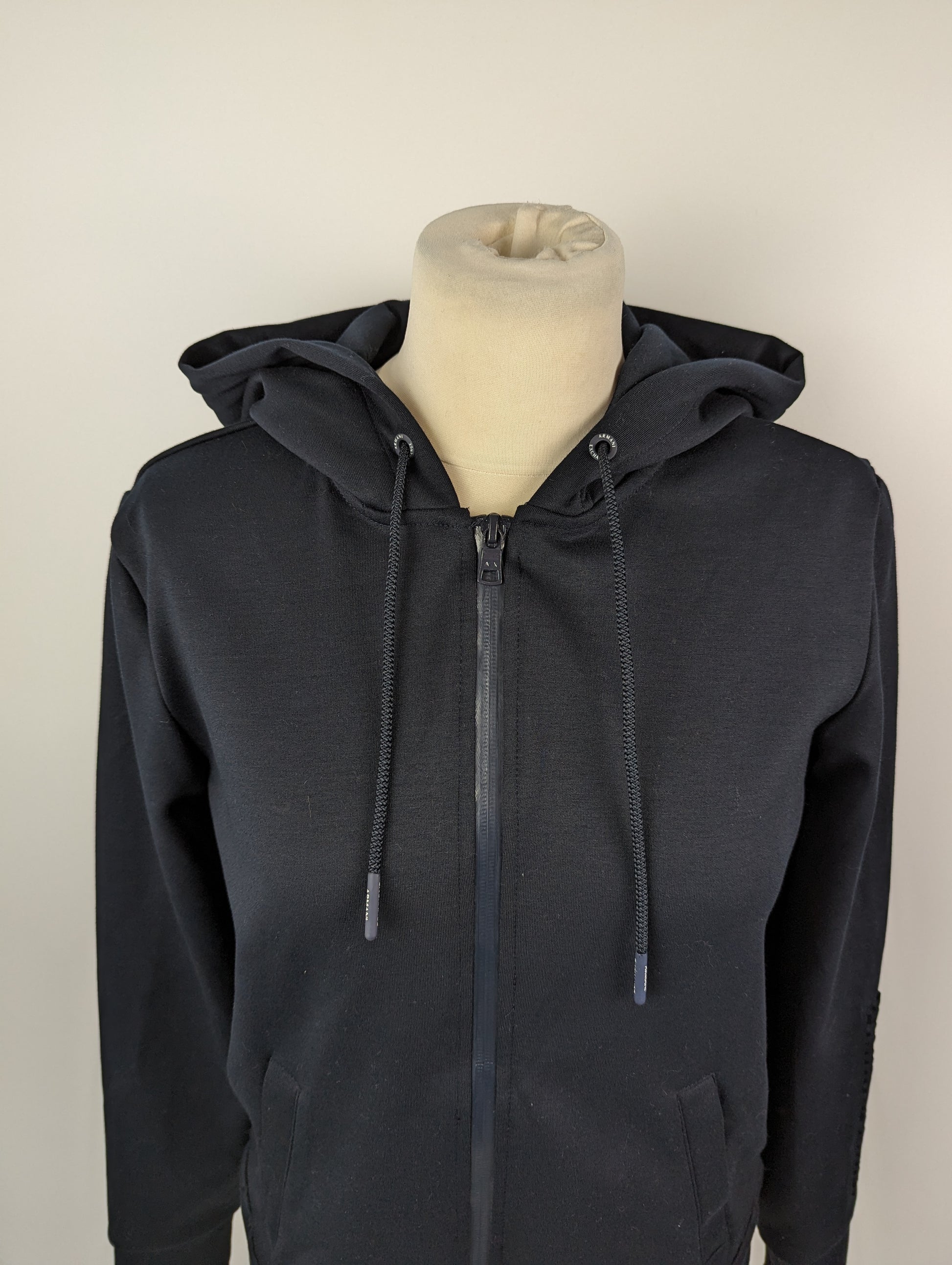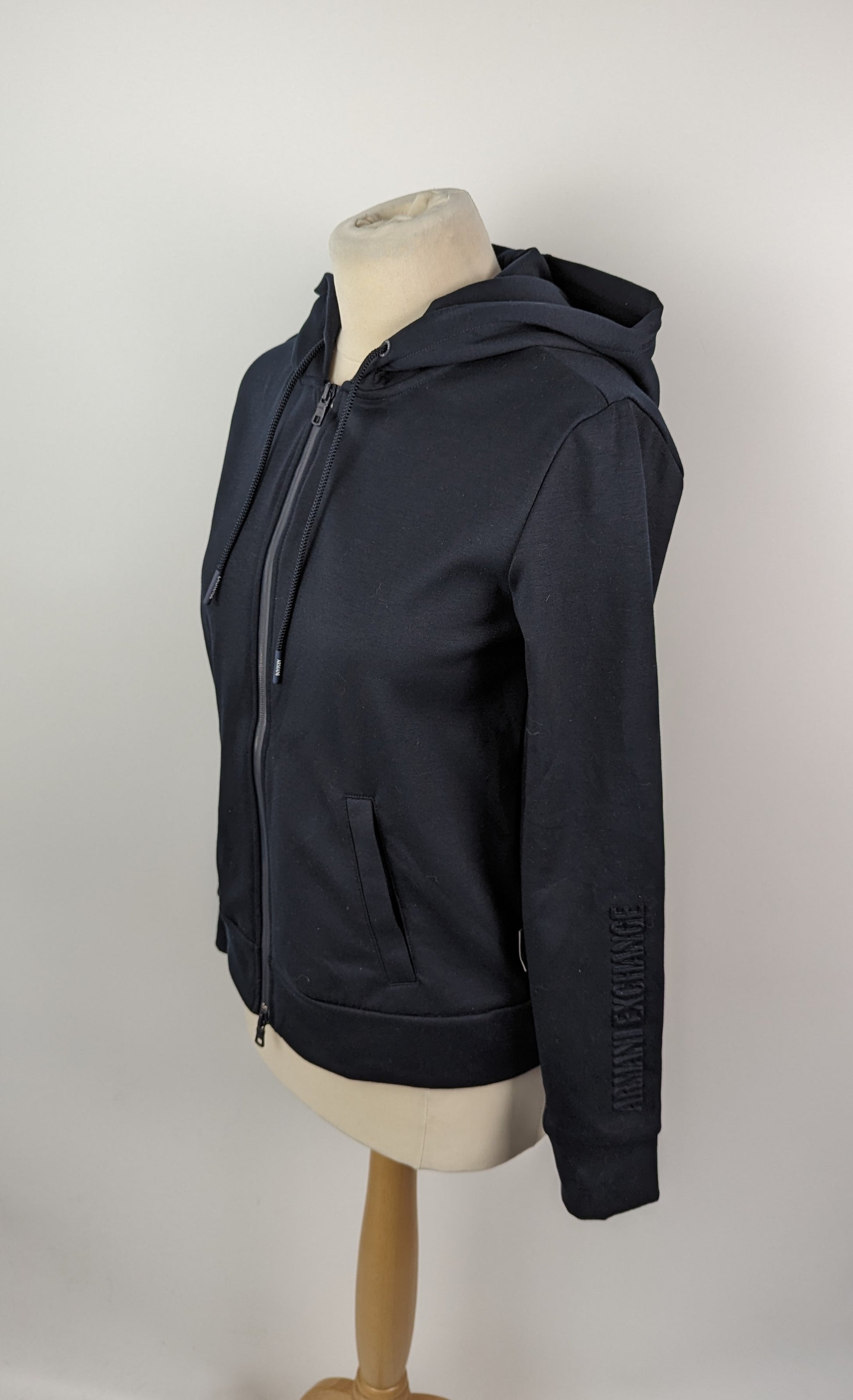 This navy Armani Exchange women's hoodie features a full zip closure with a drawstring hood, as well as two open pockets. The sleeve of one arm also includes a 3D logo.