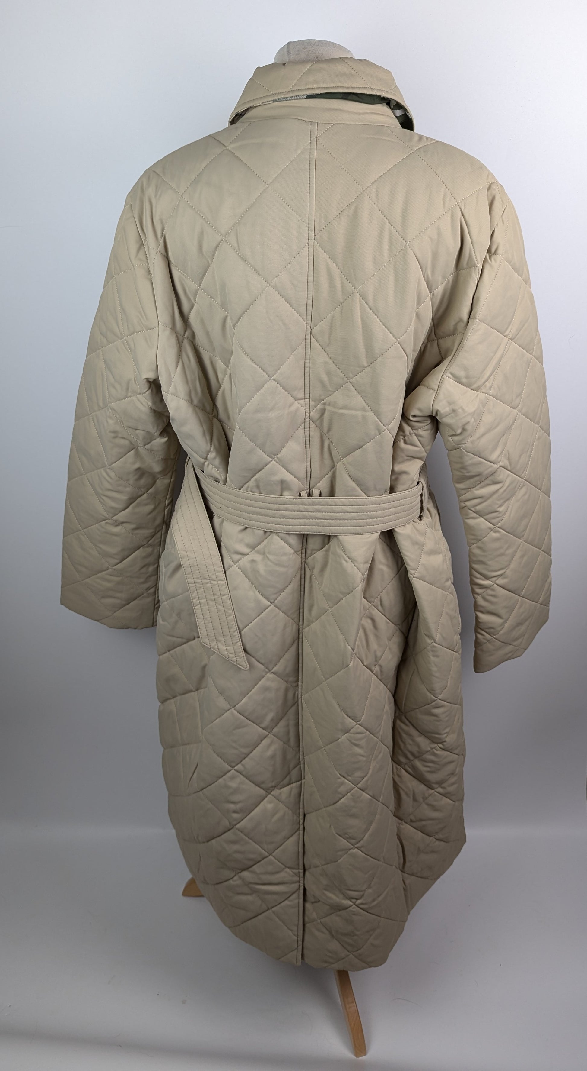 This Barbour Ladies Tan Cordelia Long Quilted Coat features a knee-length silhouette with a button closure. Made of polyester, it is suitable for travel, casual wear, and work. The coat is lined, belted, and has pockets, making it perfect for winter, autumn, and spring. With a classic quilted style and a beautiful green colour, this new with tags coat is a stylish addition to any wardrobe.