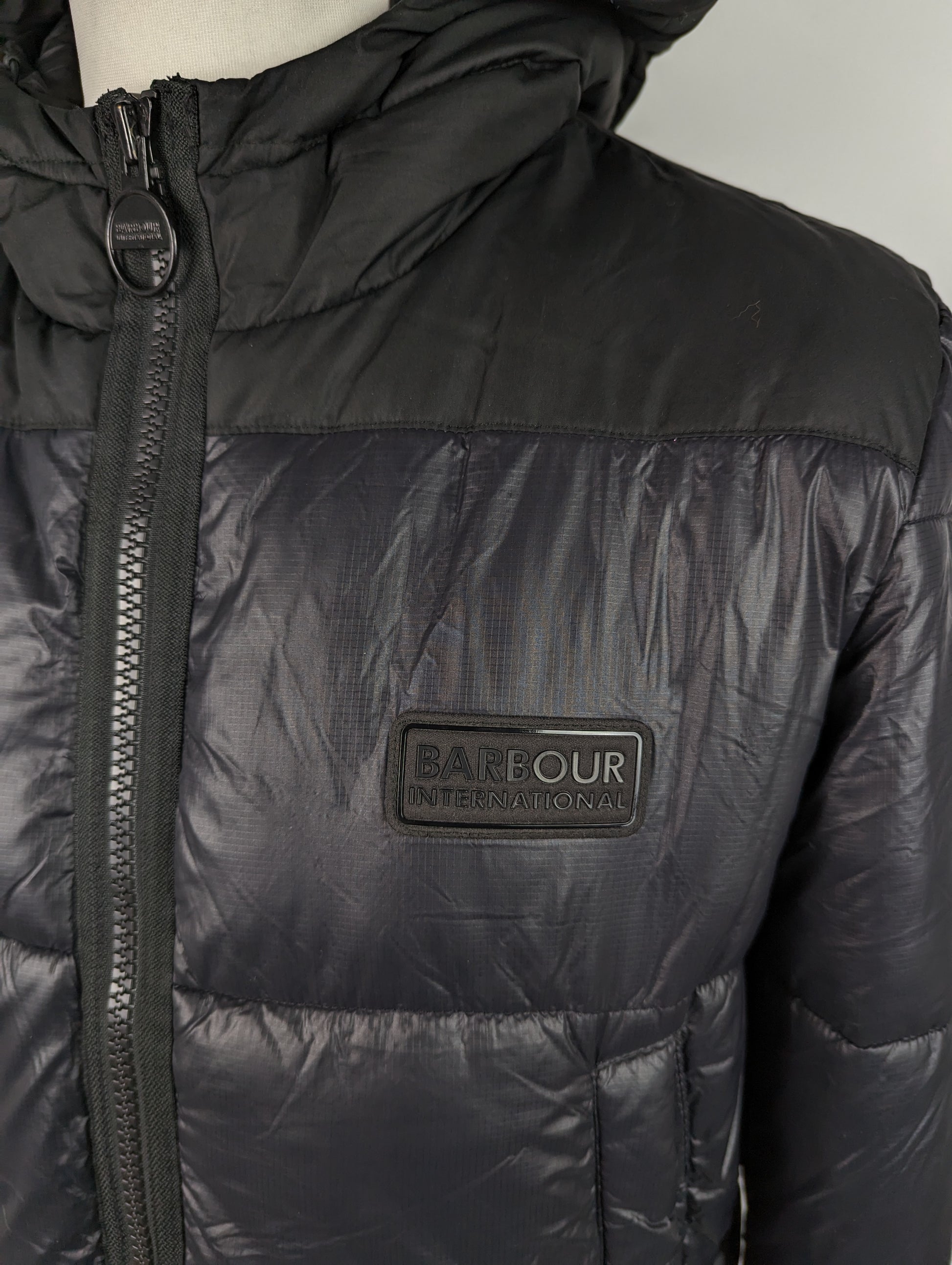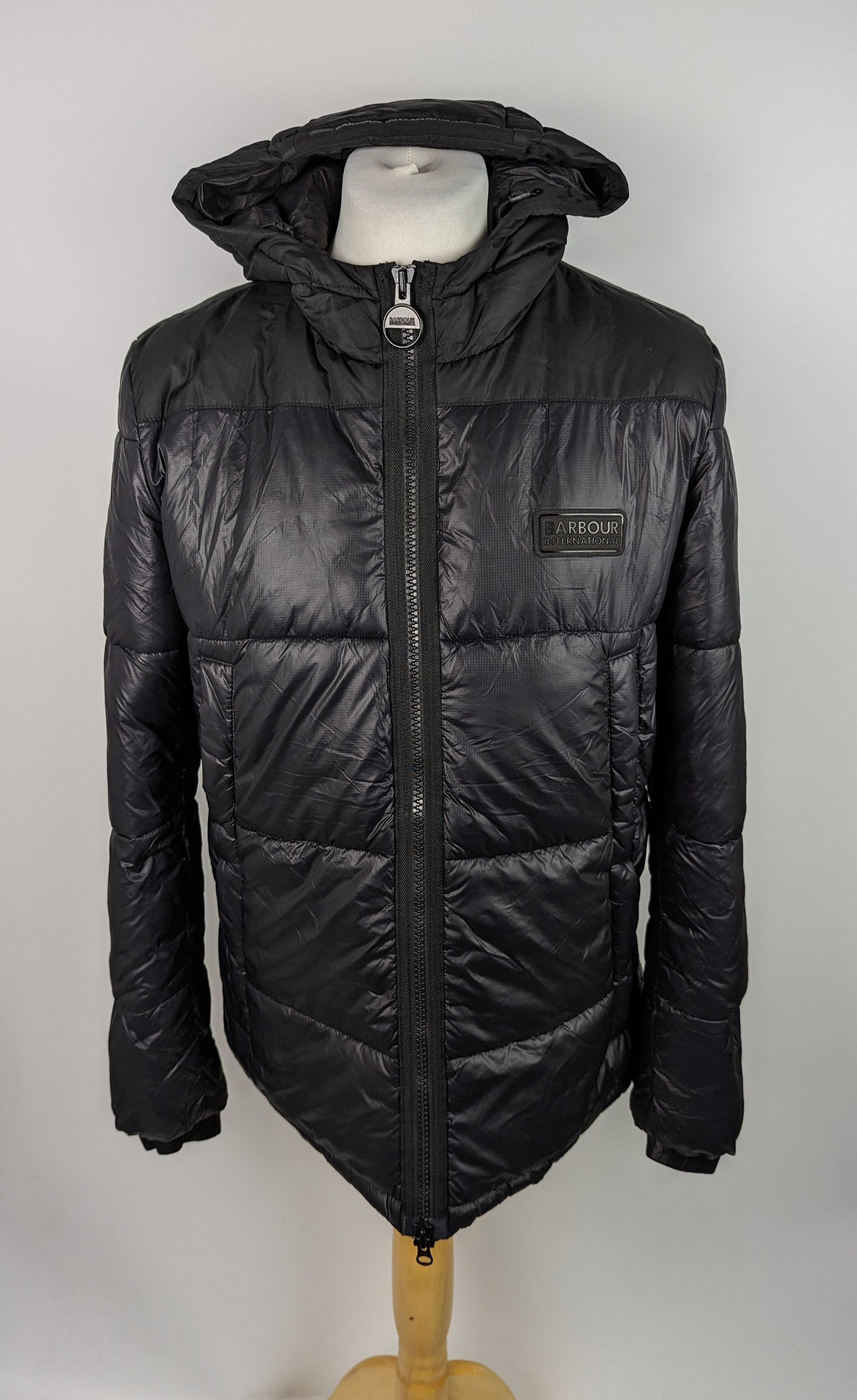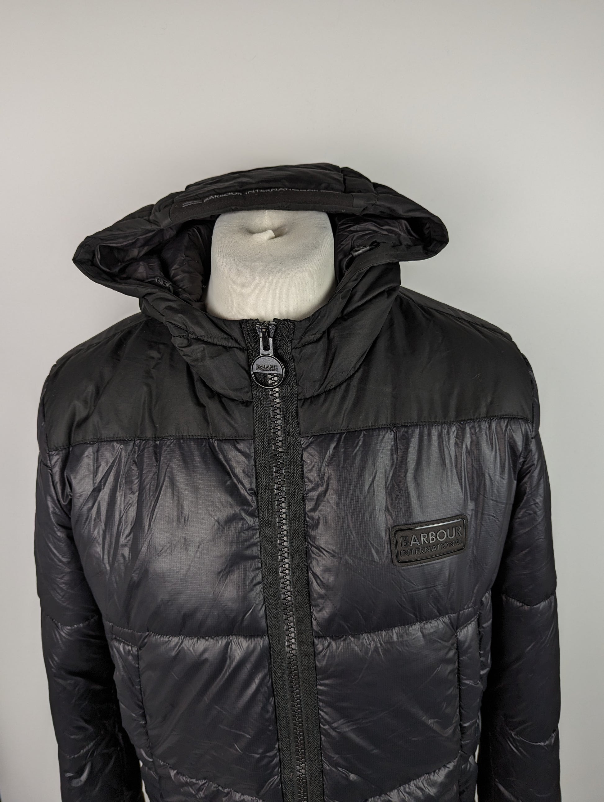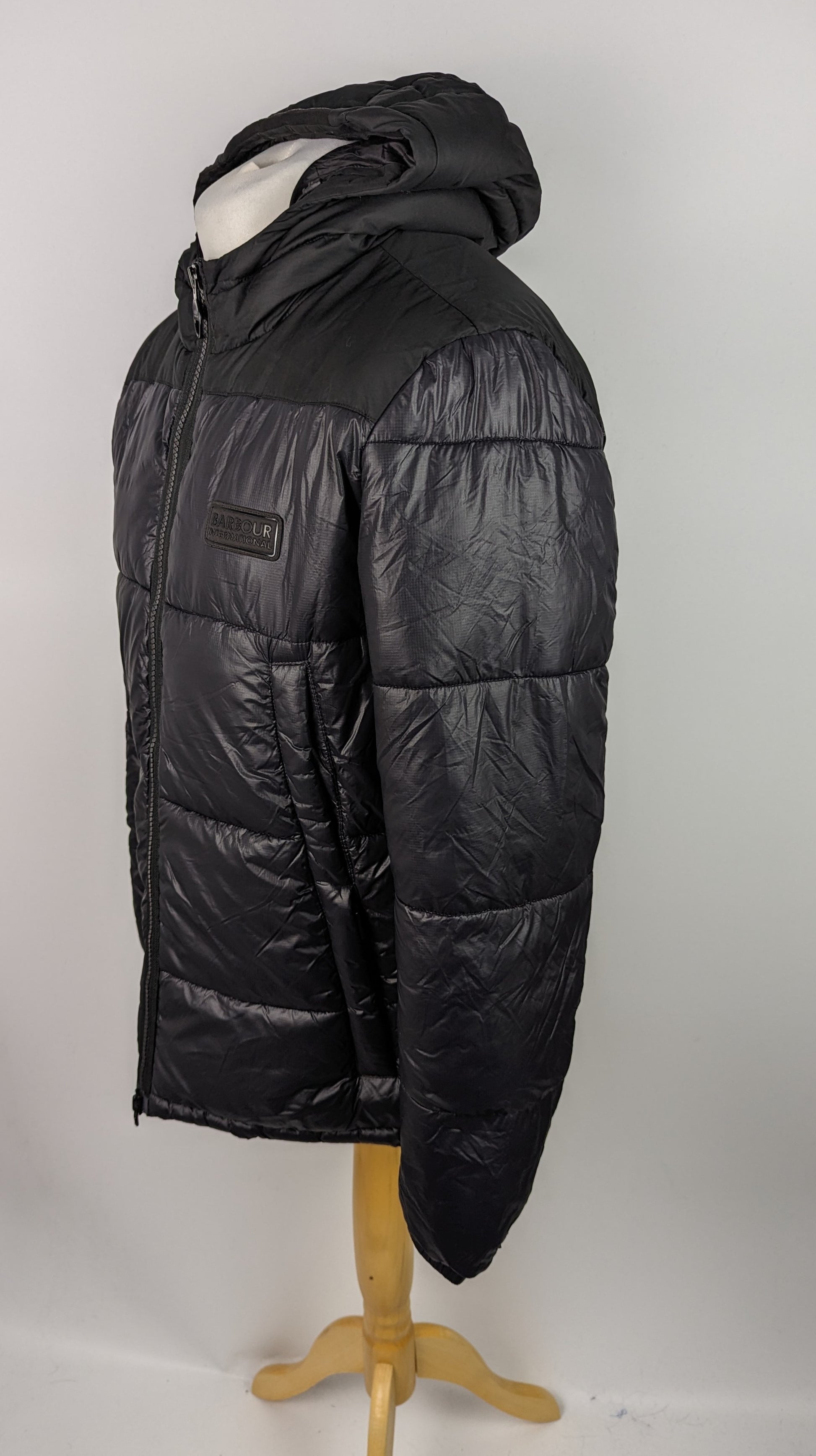 The Sprint Quilted Jacket by Barbour International is a regular fitting, quilted baffle jacket that will get you through the changing temperatures in style and comfort. Featuring a Barbour International lozenge gloss microfibre logo to the hood and a silicone Barbour International badge logo to left chest. The jacket is crafted in a shiny outer fabric, with matt hood and shoulder panels, full length zip fastener and ribbed cuffs to keep in the warmth.