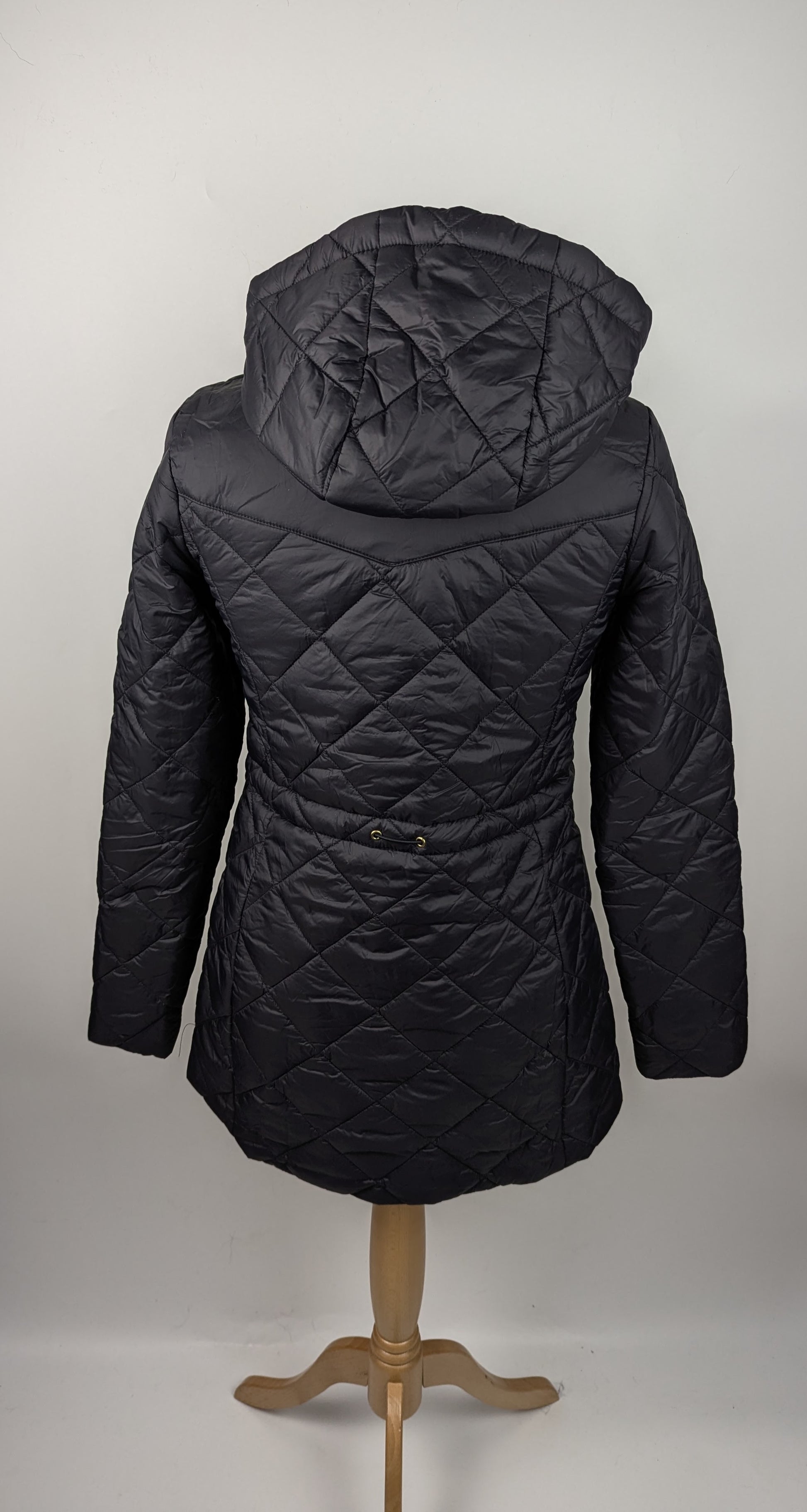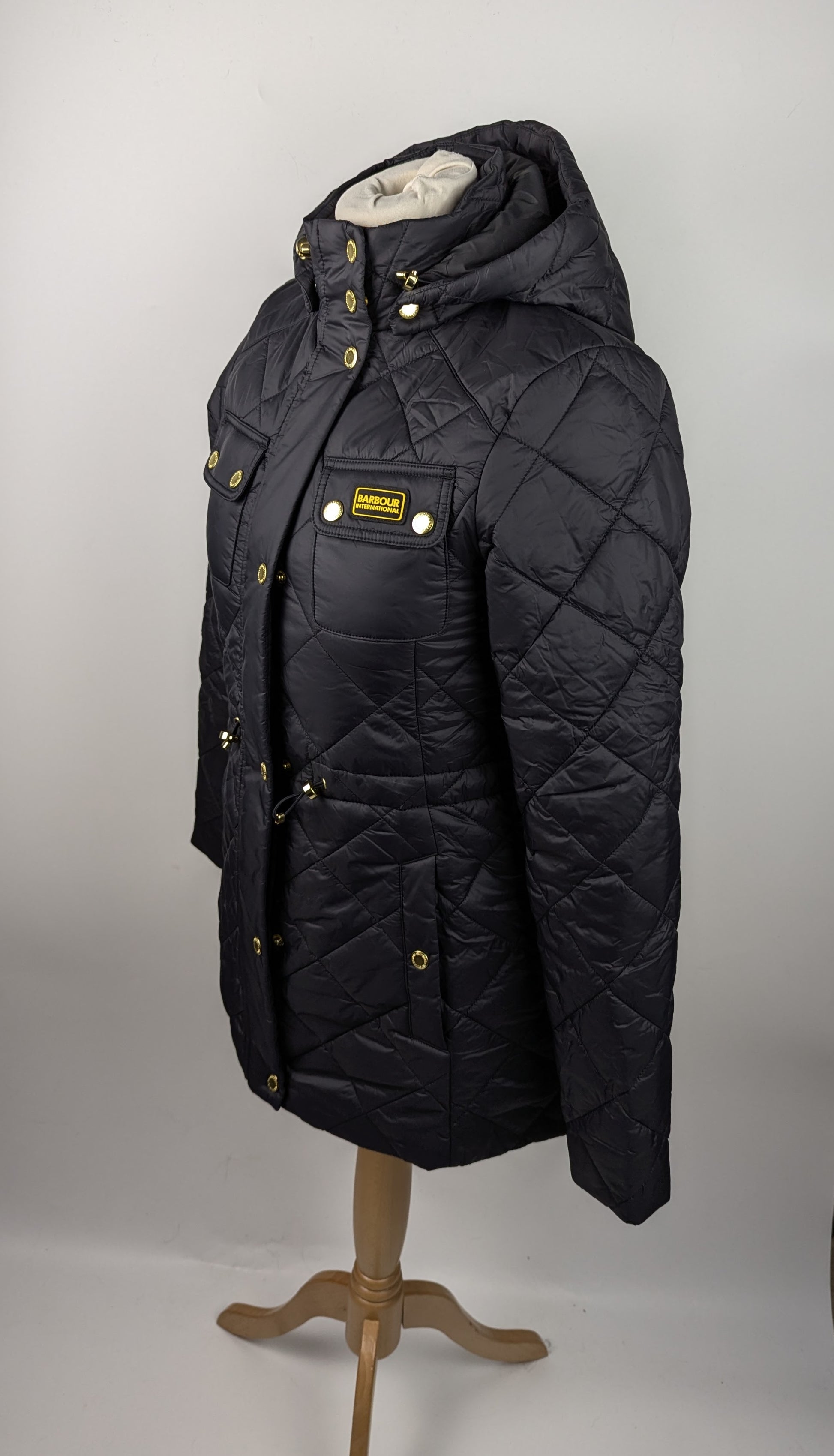 Barbour International's Avalon Water Resistant Jacket delivers protection with its quilted design and detachable hood. The elasticated waist creates a flattering shape, while four practical pockets and stud fastenings offer both functionality and the brand's classic style.