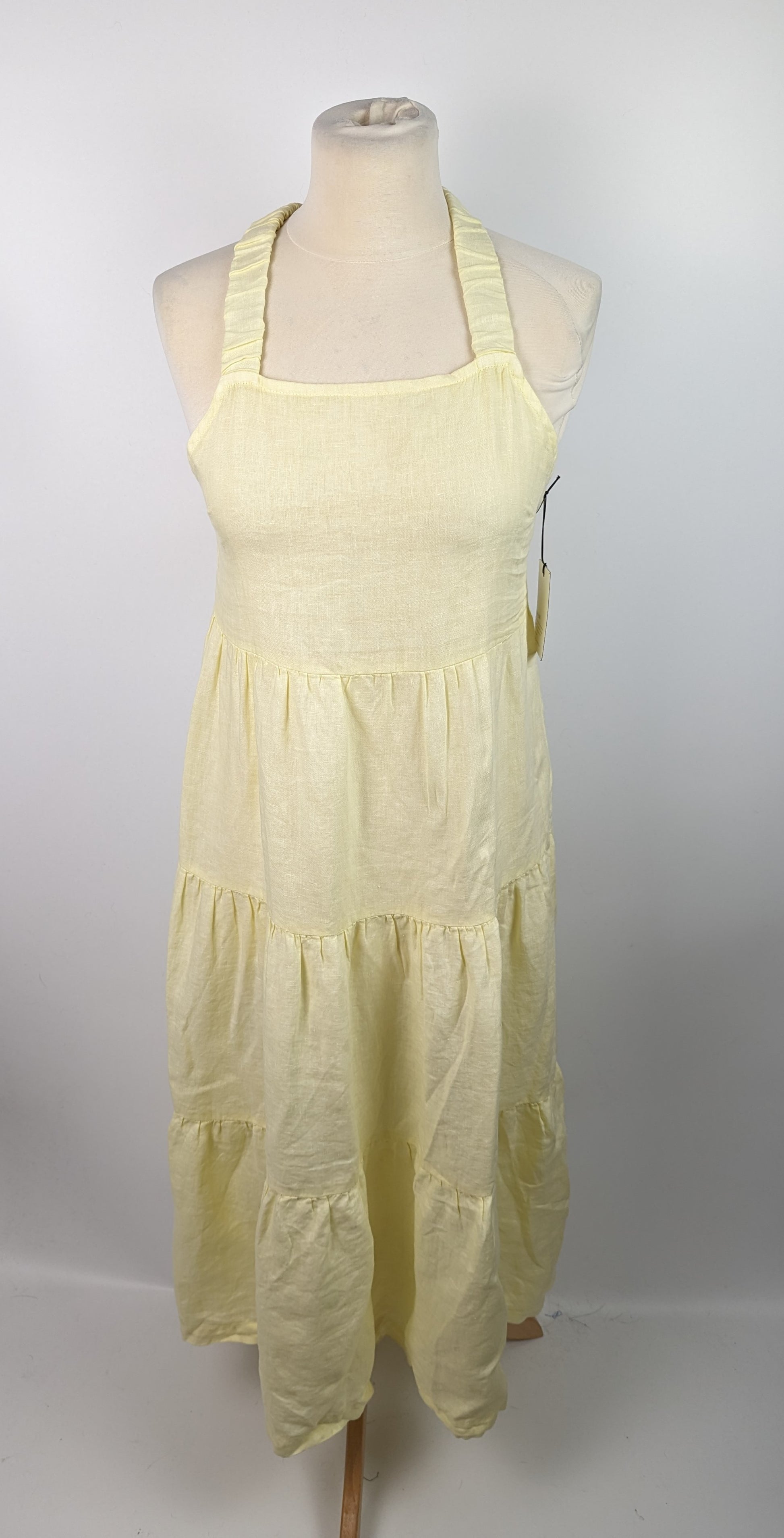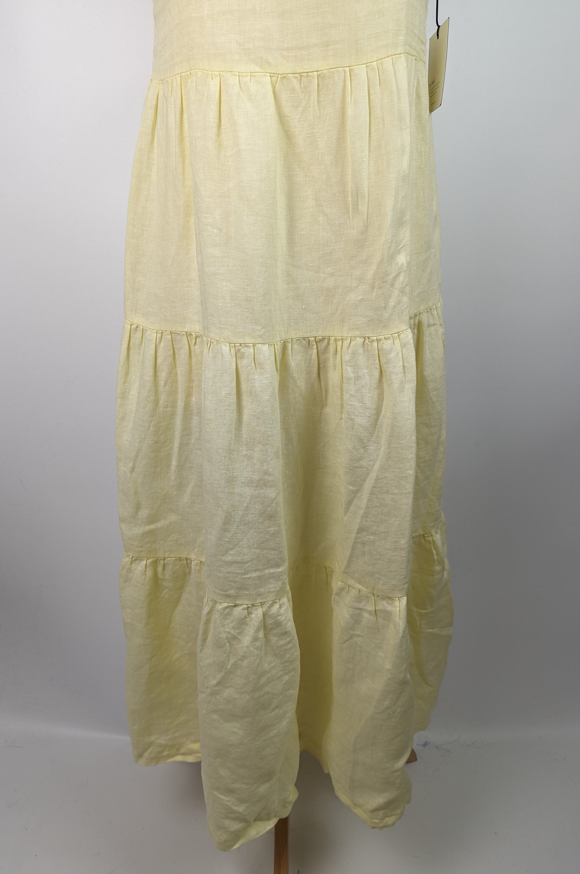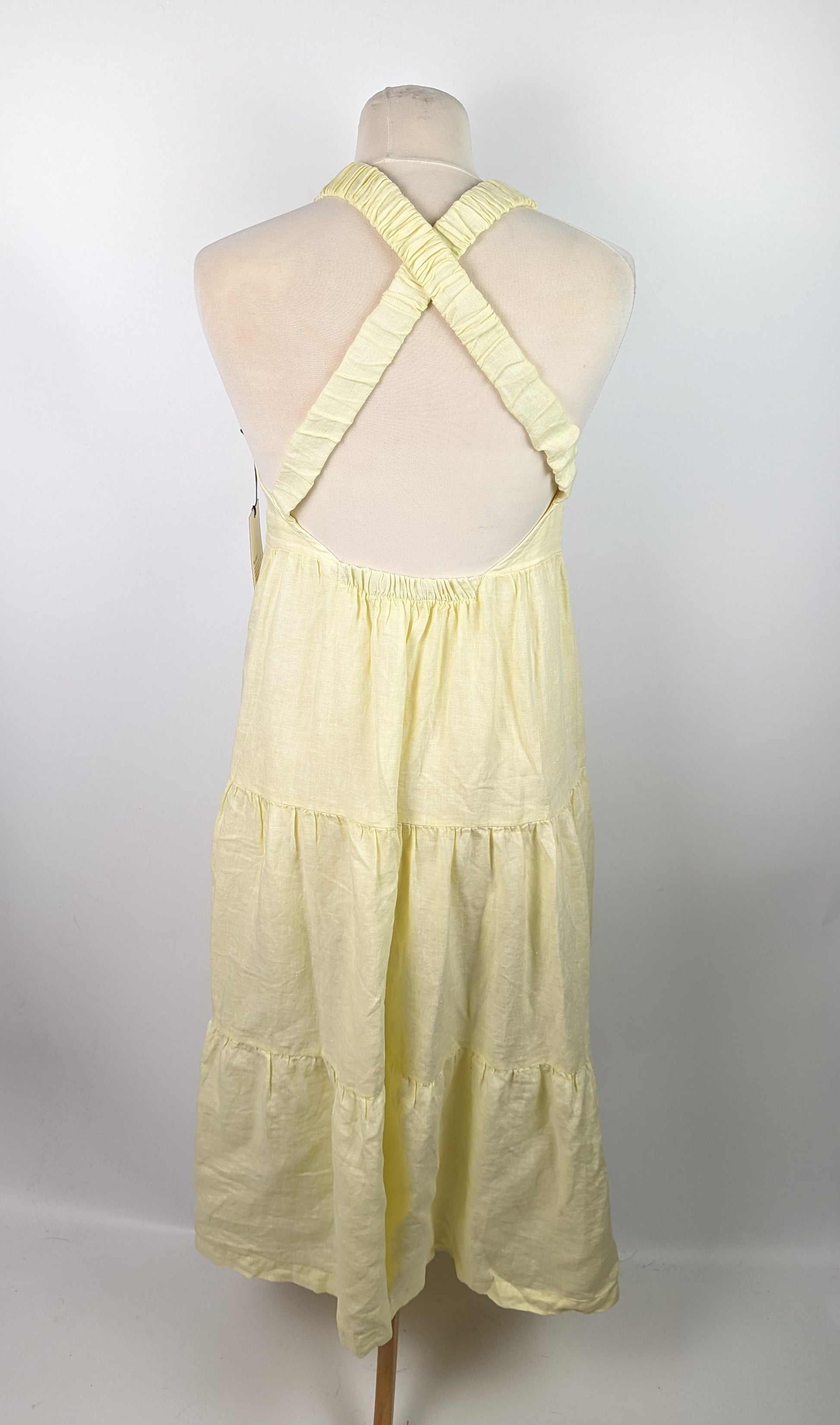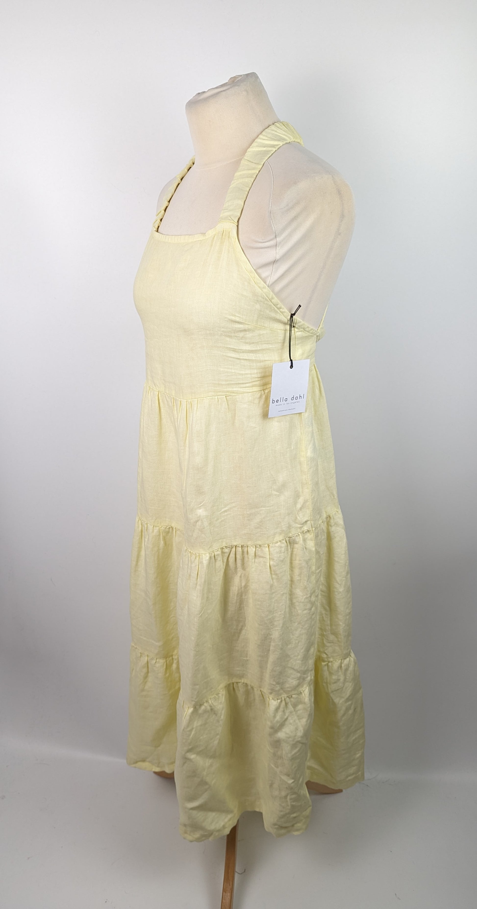 Beautiful Summery dress from Bella Dahl. This tiered, midi length style is crafted from a lightweight 100% linen in a fresh lemon yellow, perfect for the Spring and Summer seasons. The dress showcases scrunch detail straps with cross back detail and stretch construction for added fit and comfort.