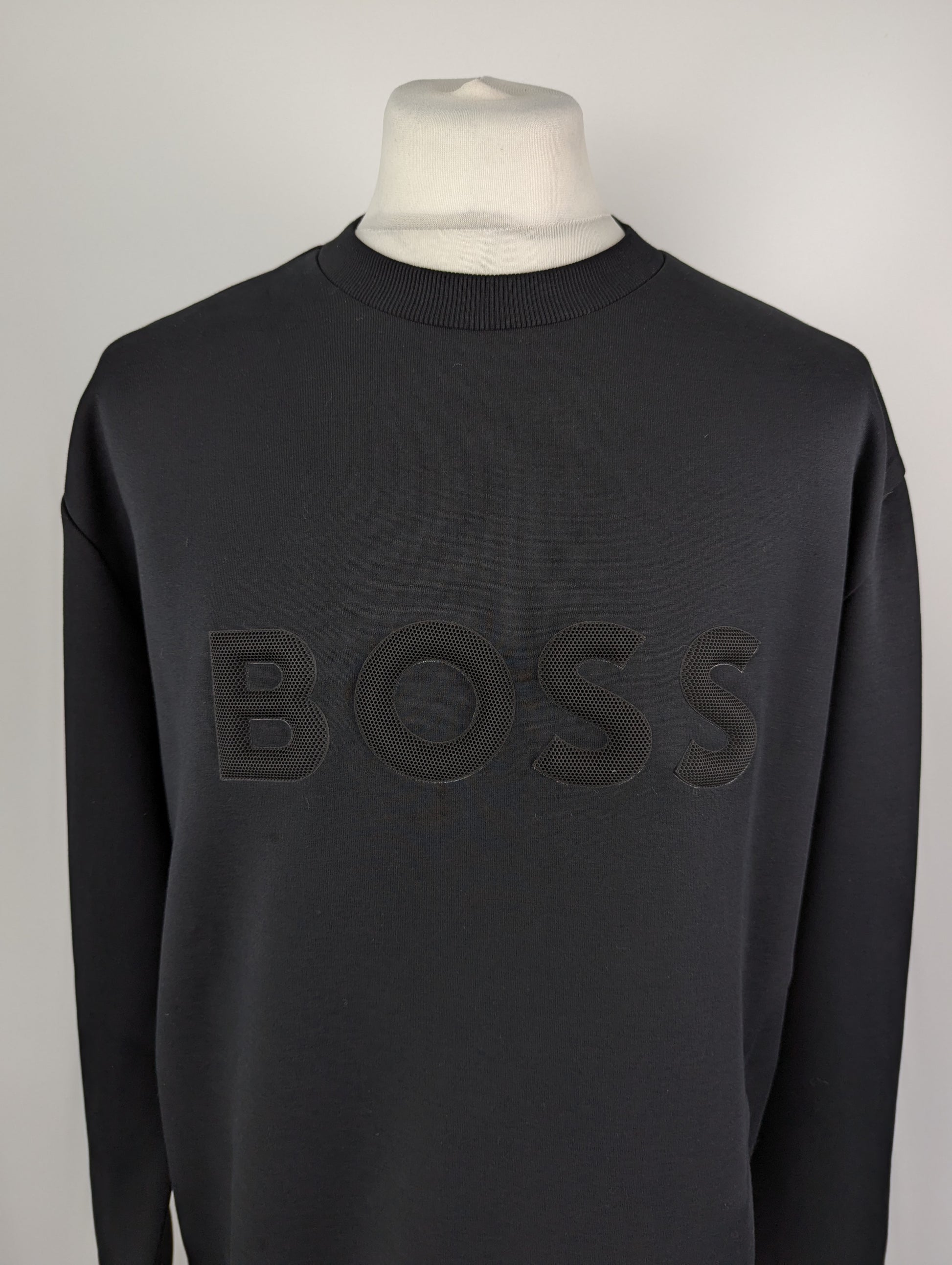 Crafted from a blend of black cotton and recycled polyester, this BOSS sweatshirt features a 3D-moulded logo on the front. The crew neck, long sleeves, and ribbed cuffs add to the comfortable and stylish jersey texture. For added convenience, it also includes two diagonal pockets on the sides and a ribbed hem. Made with 62% cotton, 33% recycled polyester, and 5% elastane, this sweatshirt is both sustainable and fashionable.