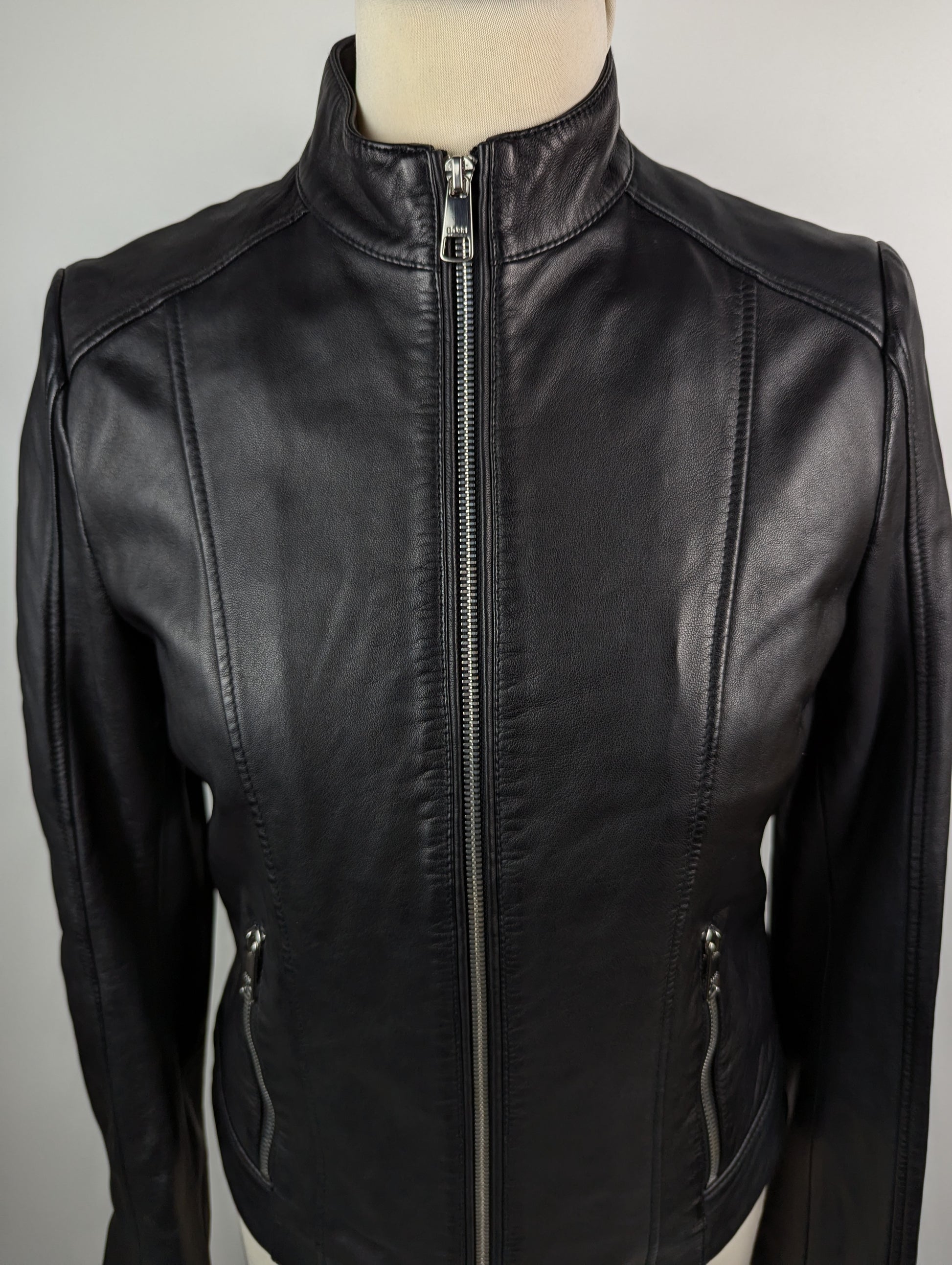 This women's leather jacket features a full zip closure complemented by zipped pockets and silver hardware accents. It offers a tailored fit with inner pockets lined with branded fabric. Crafted entirely from 100% lamb leather for premium quality.