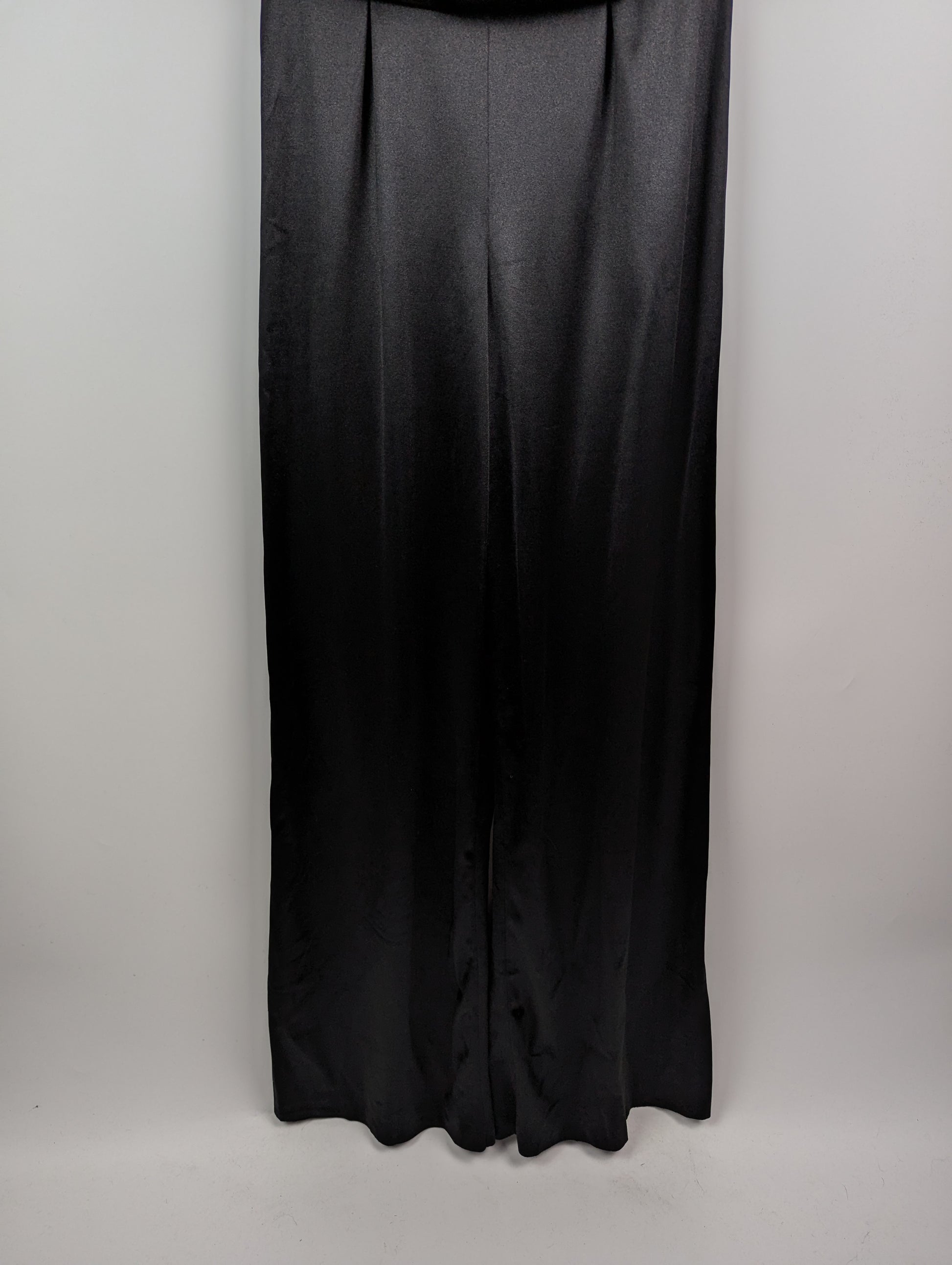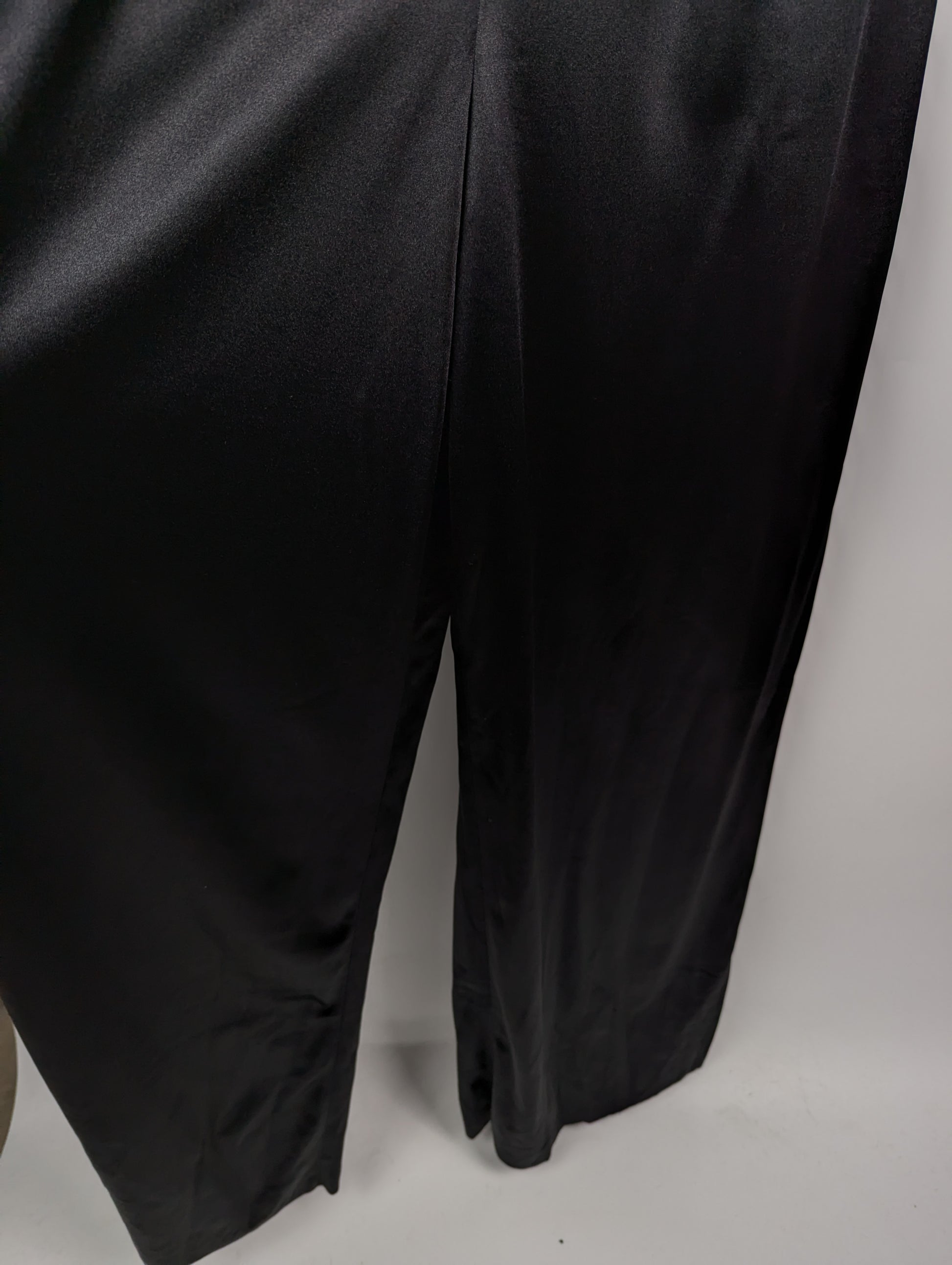 This women's jumpsuit features a wrap detail at the waist and a sleeveless design, complemented by a concealed side zipper. It has a straight-leg cut and is crafted from black fabric with a subtle shimmer, offering a refined and elegant look. Long finish.