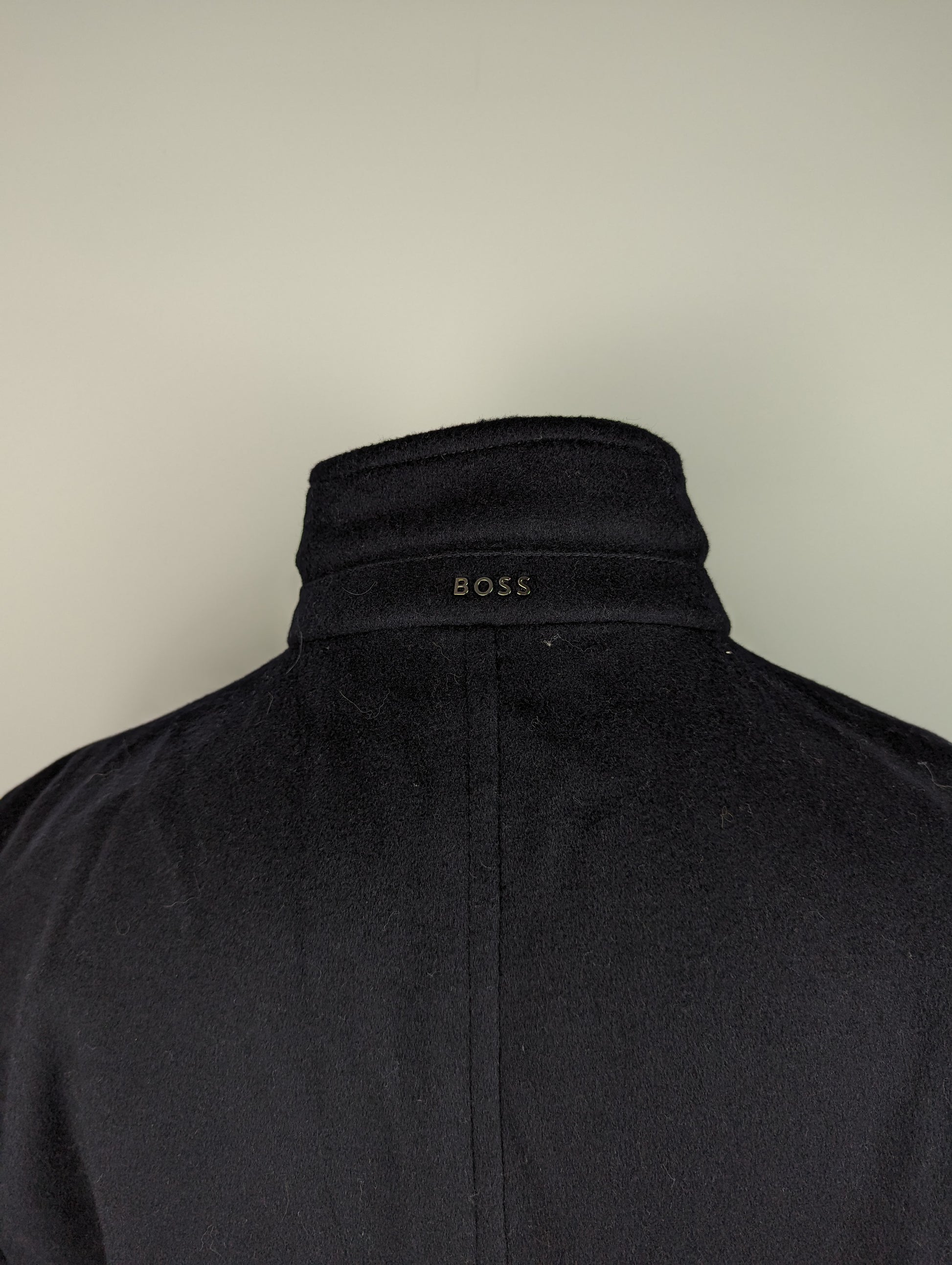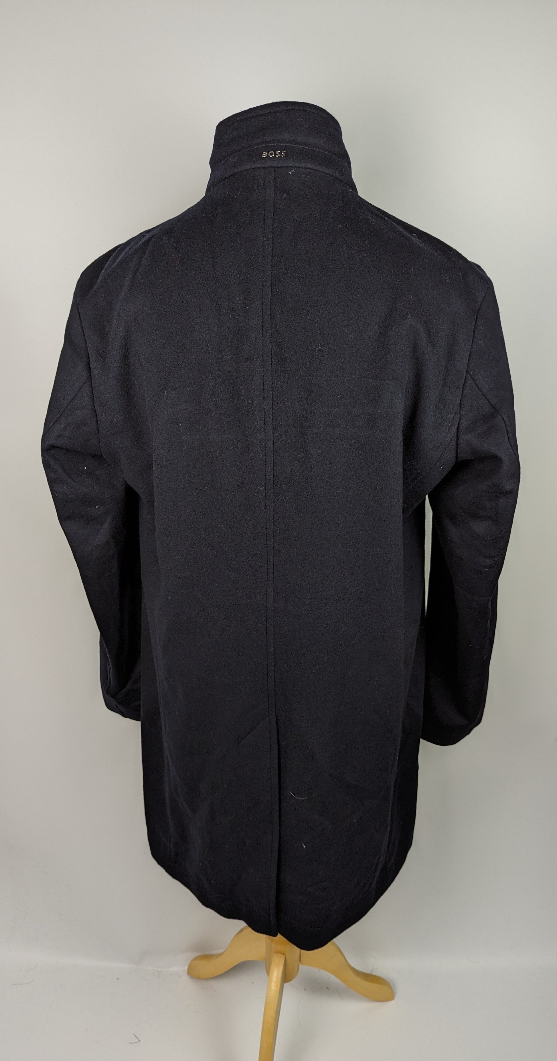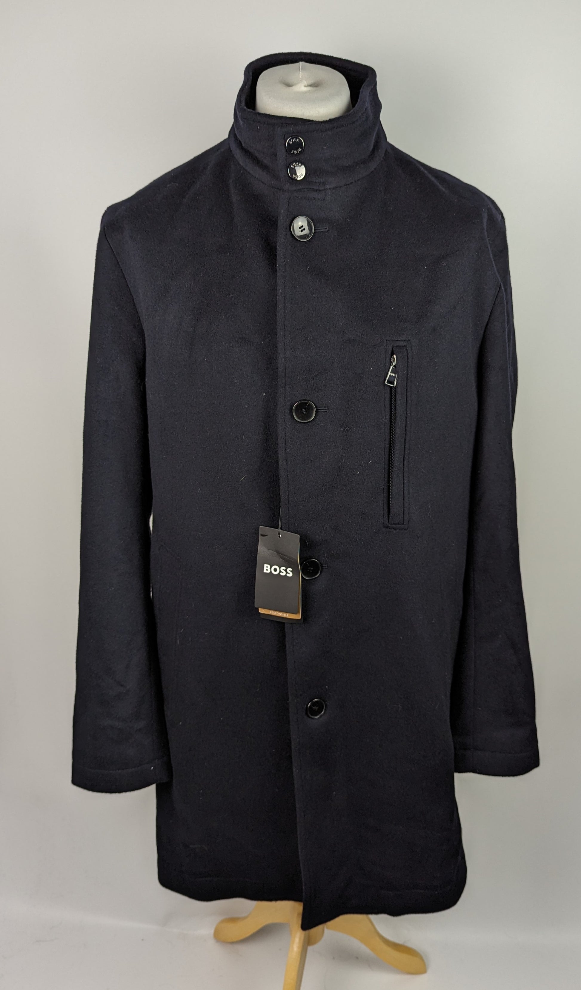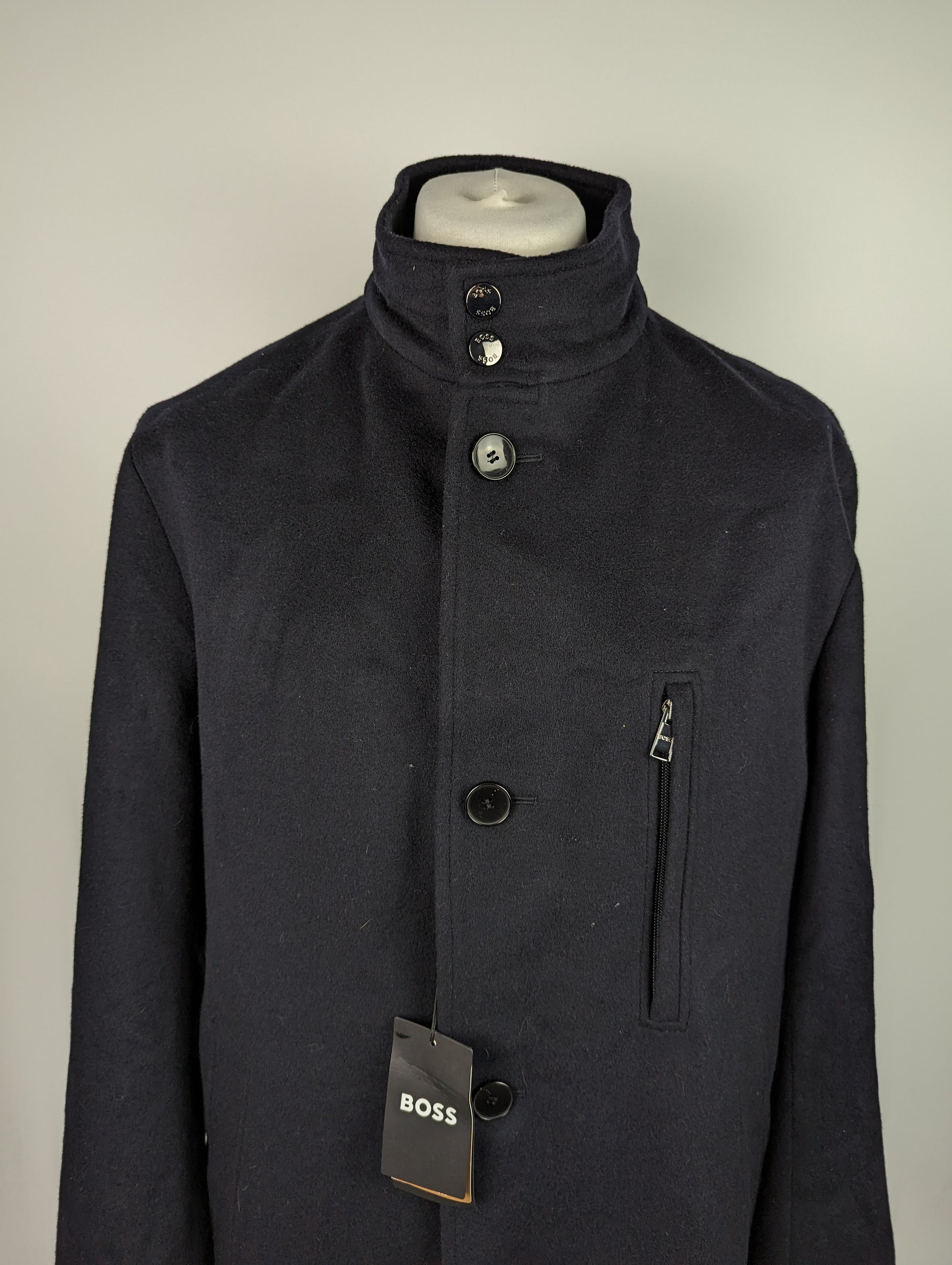 Boss Hyde Standup C 234 Overcoat in Dark Blue. A classic BOSS overcoat in slim fit, made from a mix of virgin wool and cashmere. This hugo boss overcoat features notch lapels and is fully lined. It has a 3 button fastening to the front and to the cuff. 1 vent to the rear of the overcoat. 2 slash pockets.
