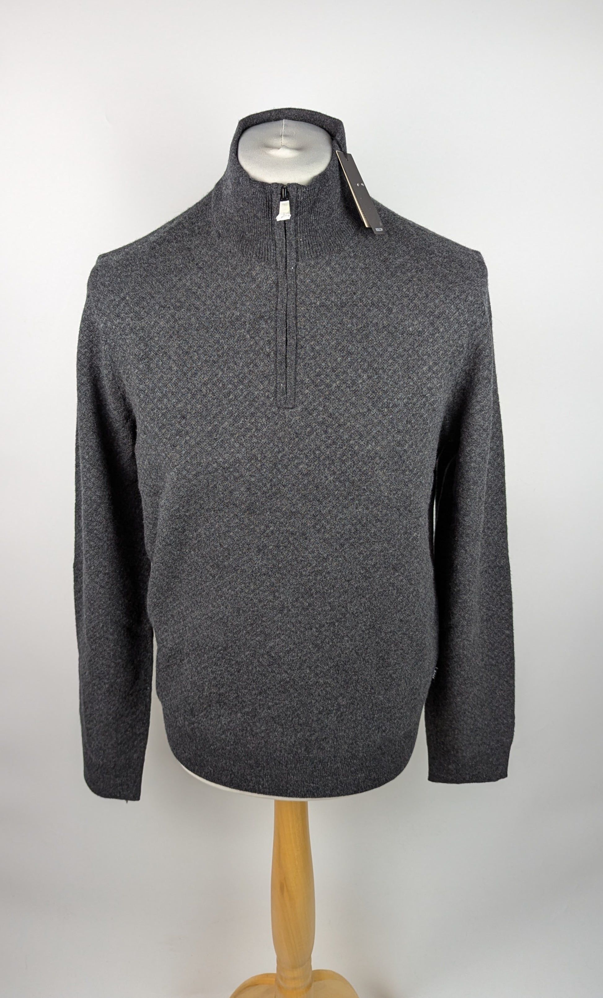 Comfort meets everyday wear in the BOSS HEltorino Quarter-Zip Knitted Sweater. The structured knit provides a smart look while the quarter-zip design offers adjustable styling for transitional weather. 77% wool,23% cotton.