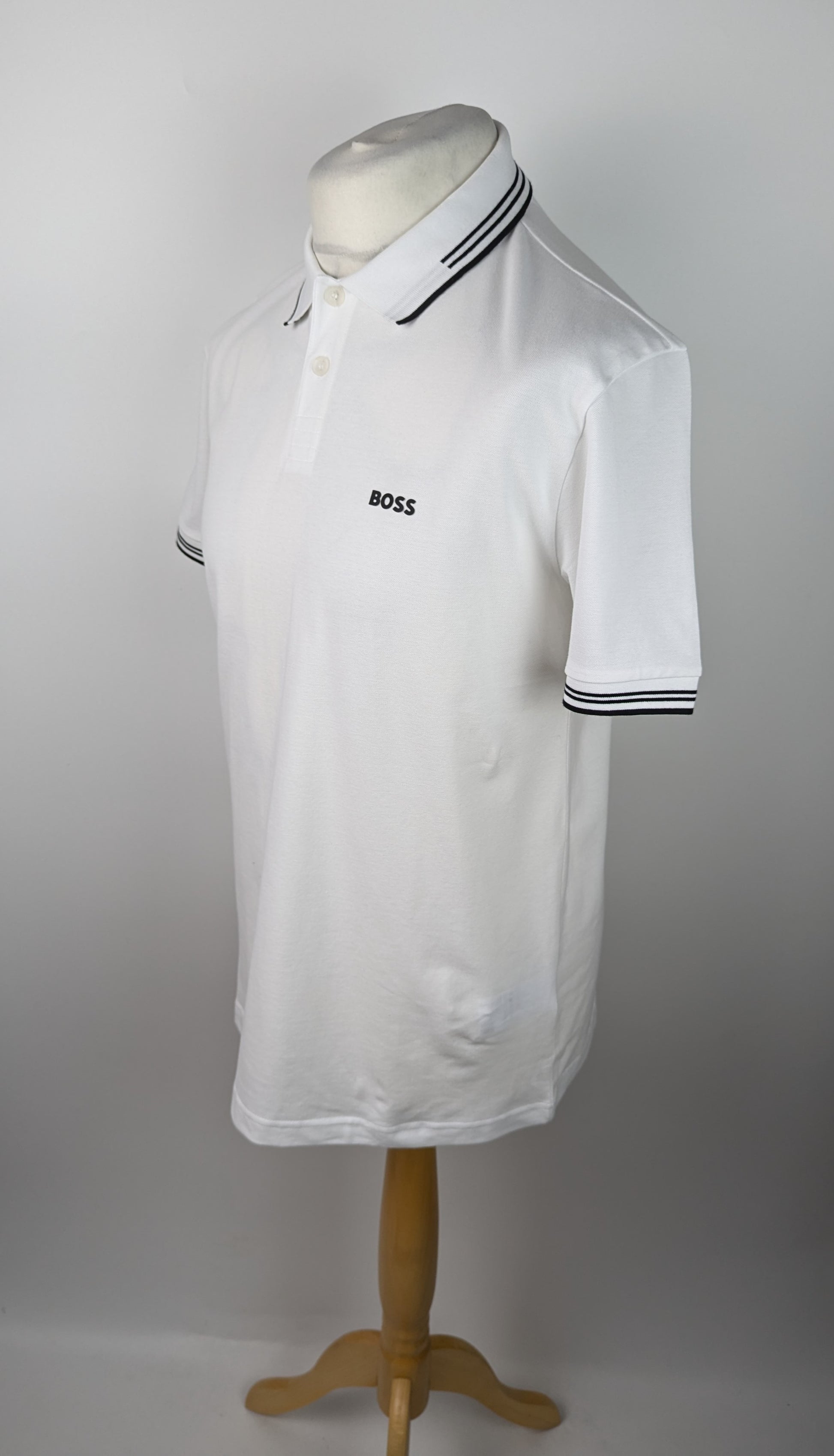 Distinguished by clean lines and timeless appeal, this Paul polo shirt from BOSS delivers classic style with contemporary details. The signature BOSS branding sits discreetly on the chest, while contrast tipping adorns the collar and cuffs for a sporting edge. Slim fit, strech.