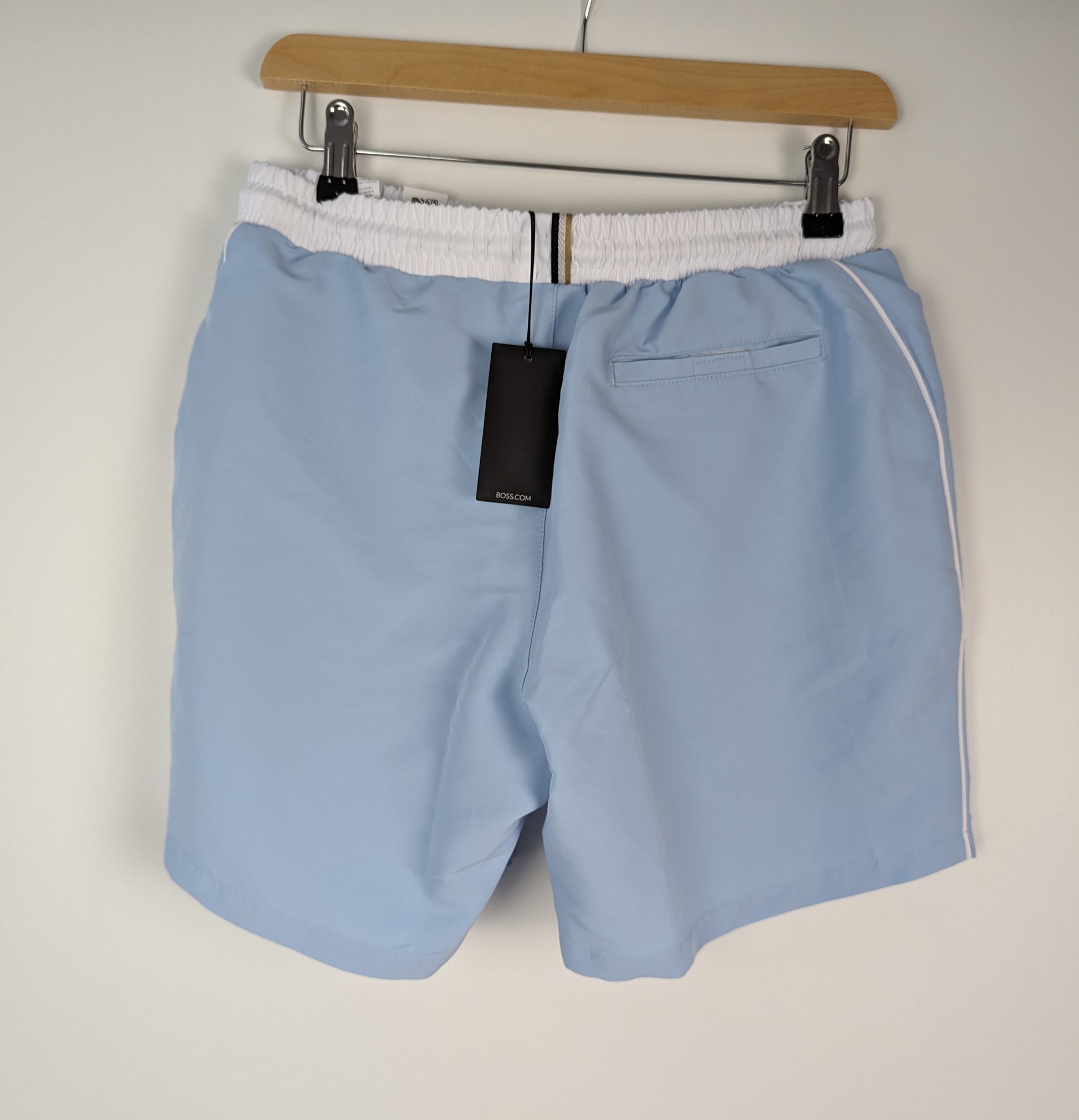 The Starfish Swim Shorts from Boss are crafted from 100% recycled polyester fabric with mesh polyester lining, feel good about yourself and the planet whilst swimming in style. These shorts feature an elasticated waistband with drawstring fastening, twin slit pockets and a touch close fastened back pocket for your essentials. The look is finished with the BOSS logo printed at the left leg, contrast piping down the sides and their iconic three colour tag on the waistband for true brand appreciation.