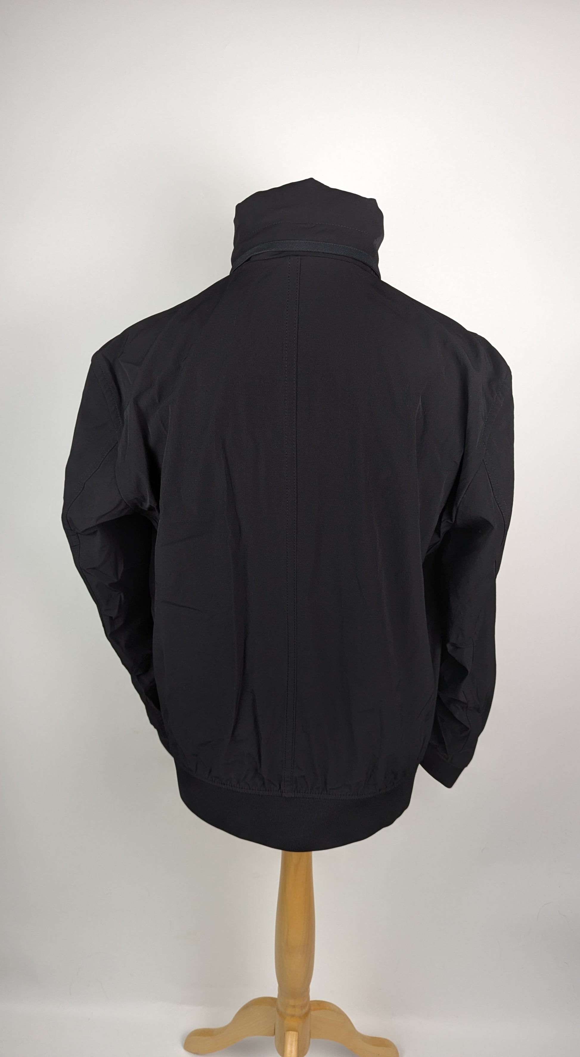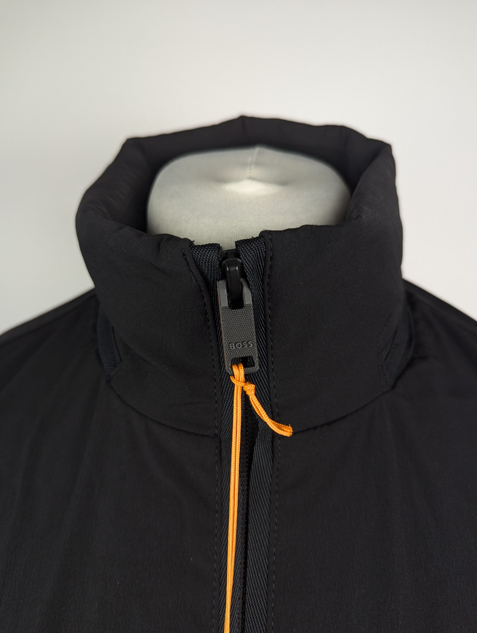 BOSS Ohice Jacket In Black, Regular Fit. A water repellent aviator style jacket with a full front zip fastening and a stand up collar which features a pack away hood. Ribbed sleeve cuffs and a stretch ribbed waistband. Two large press stud entry pockets on the front with a BOSS logo patch featured on the upper left sleeve. A press stud entry pocket on the left interior. Quality: 88% Polyamide, 12% Elastane. Lining: 100% Polyester.