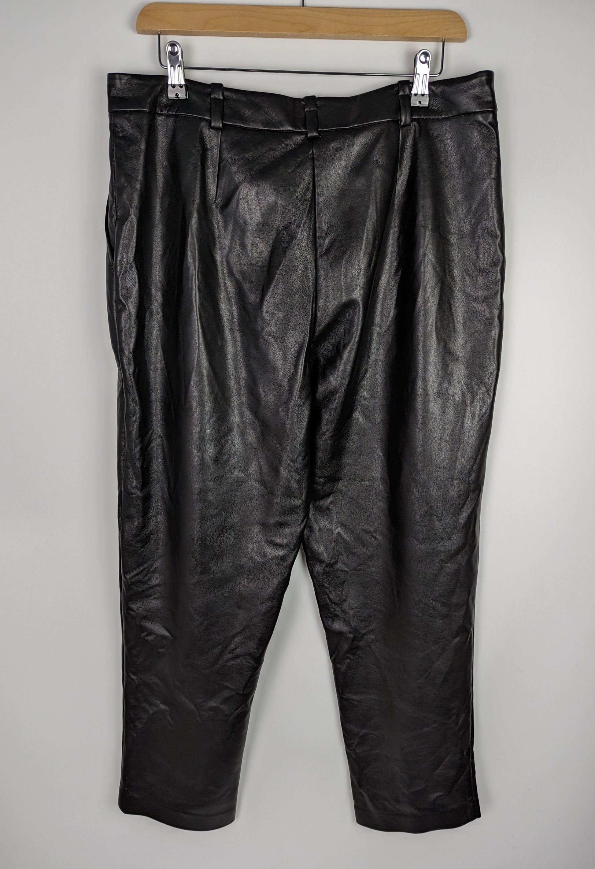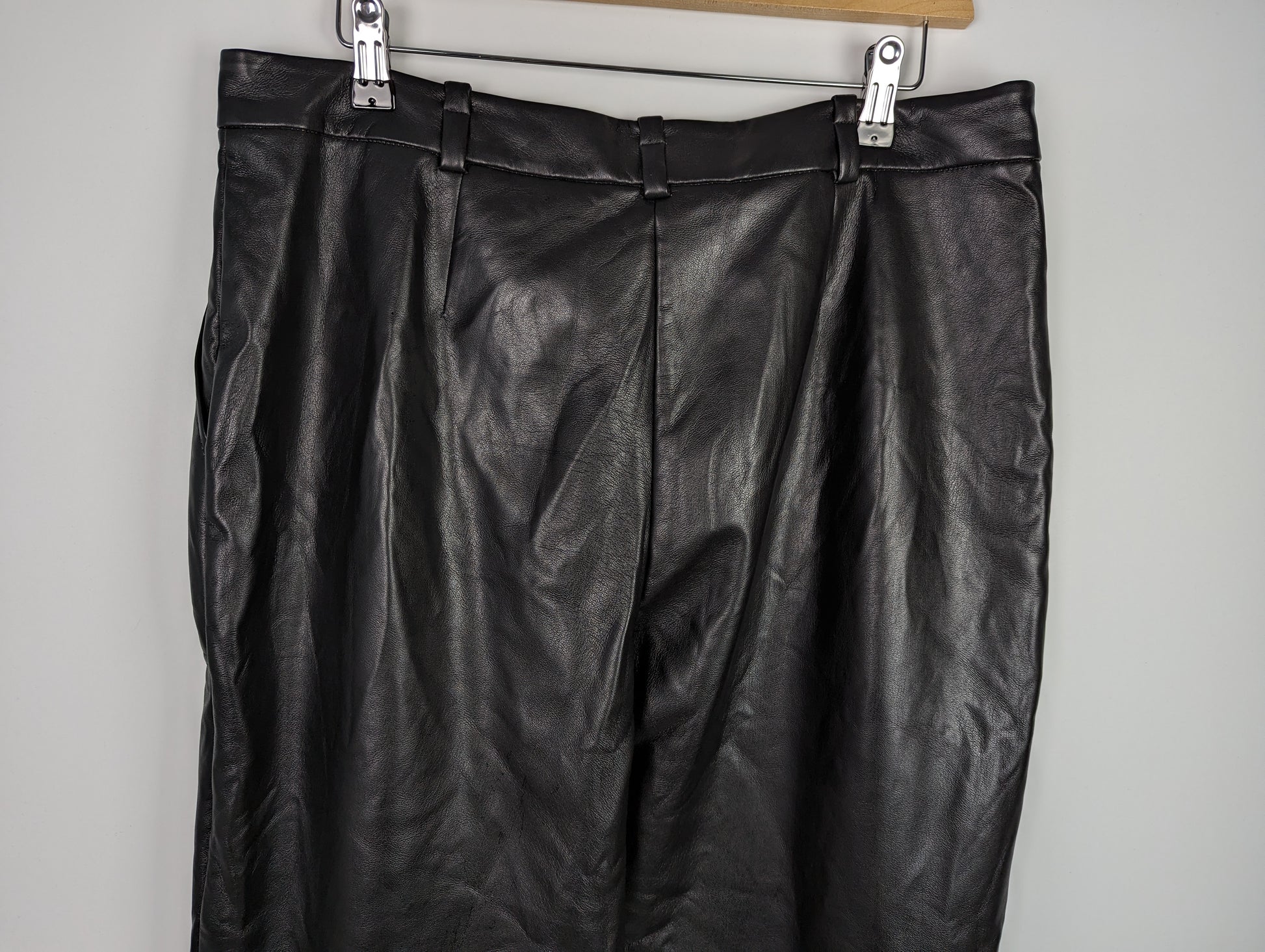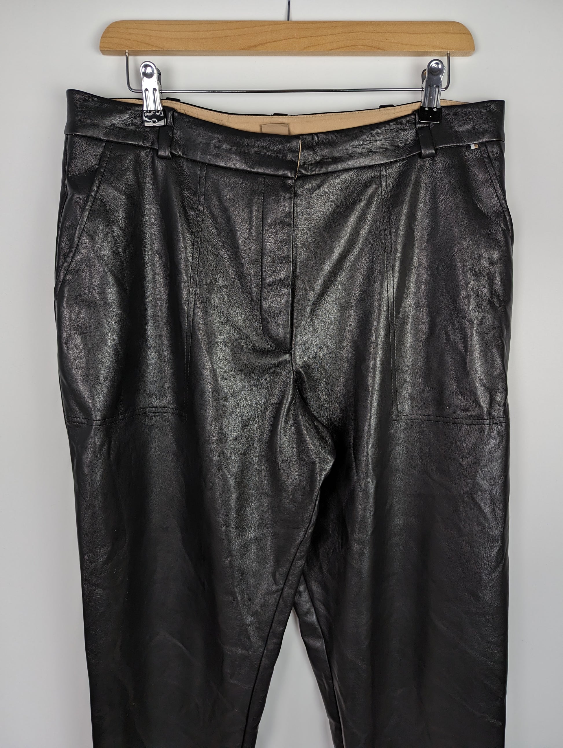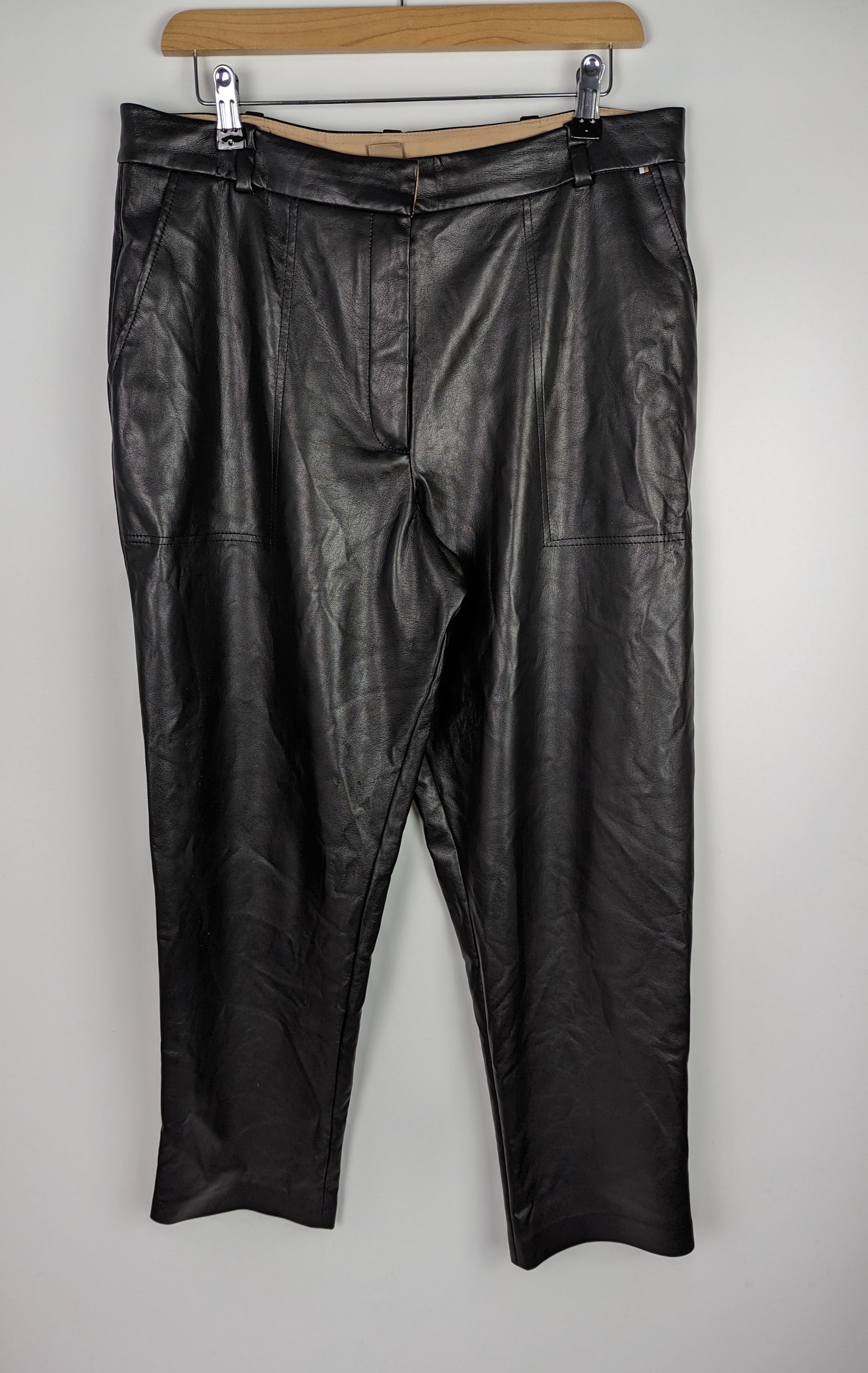 Boss Leather/PU Trousers. Crafted from a shiny faux leather fabric, this straight leg silhouette offers a black colour and tonal stitching adds clean aesthetic. Completed with a zip fastening and 2 pockets at the hips.