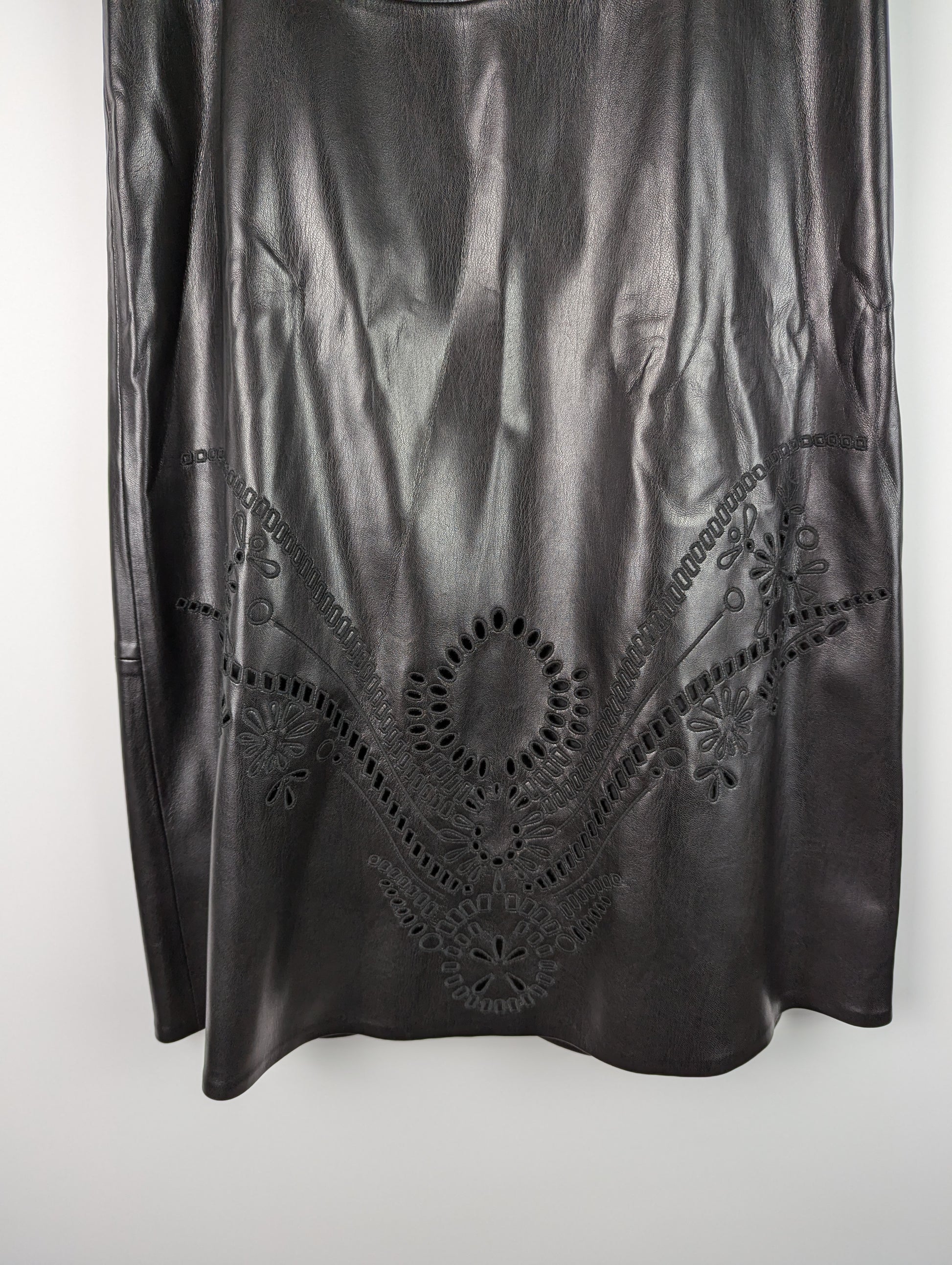 The BOSS Vembro A-line skirt in black features a Western-inspired pattern on the bottom, with a unique cut-out design. The back features a zip fastening. The composition is 100% Polyester, with a Polyester lining.