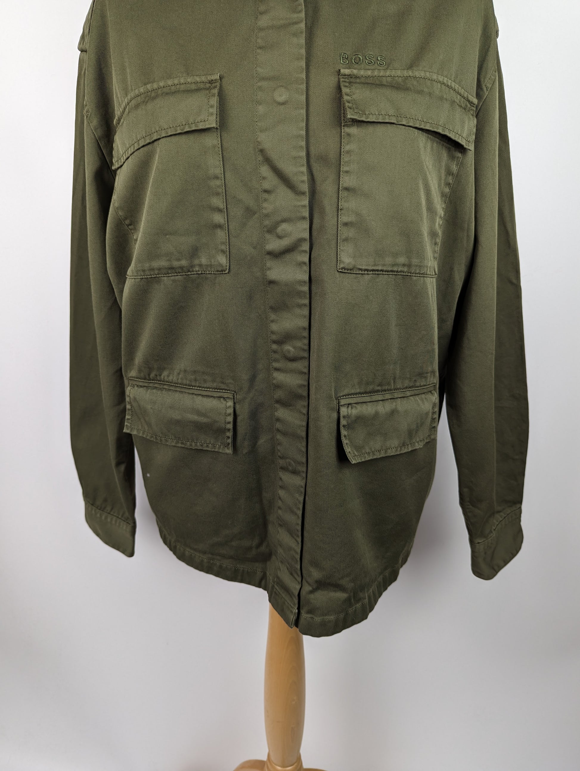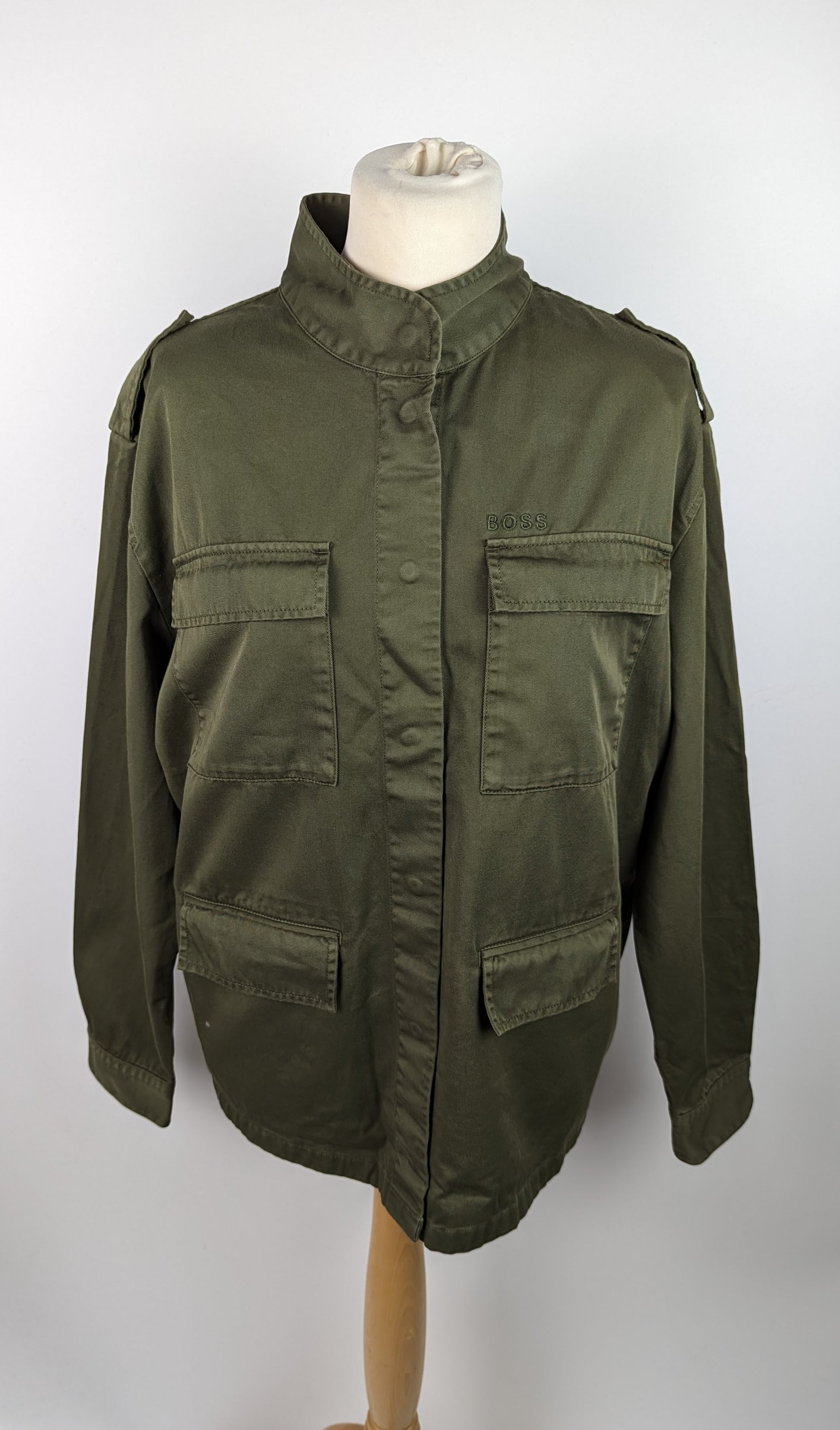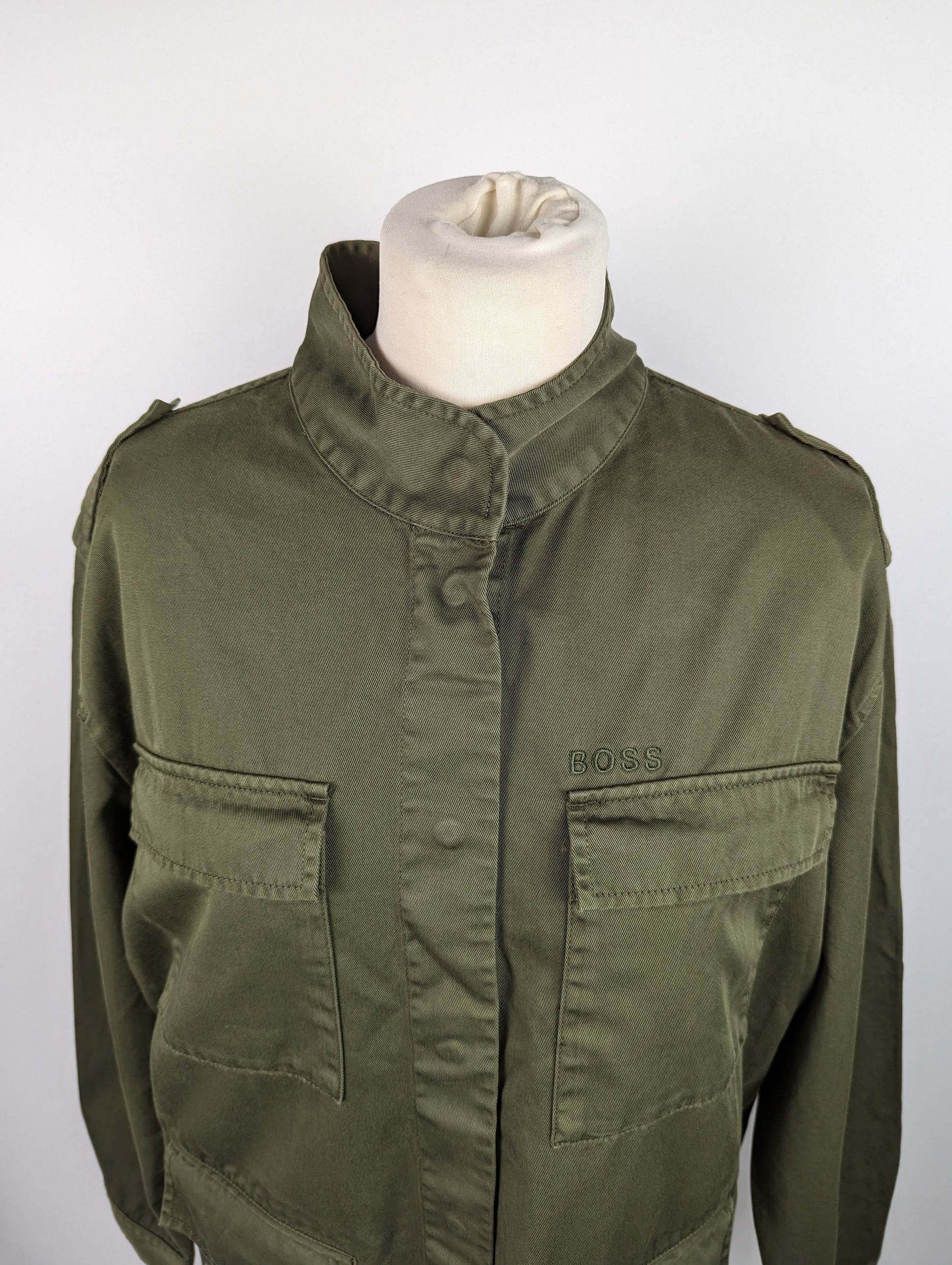 This jacket has a standing collar with a button covered fastening design, making it both simple and elegant. Additionally, it boasts four pockets on the front and an army-inspired aesthetic.