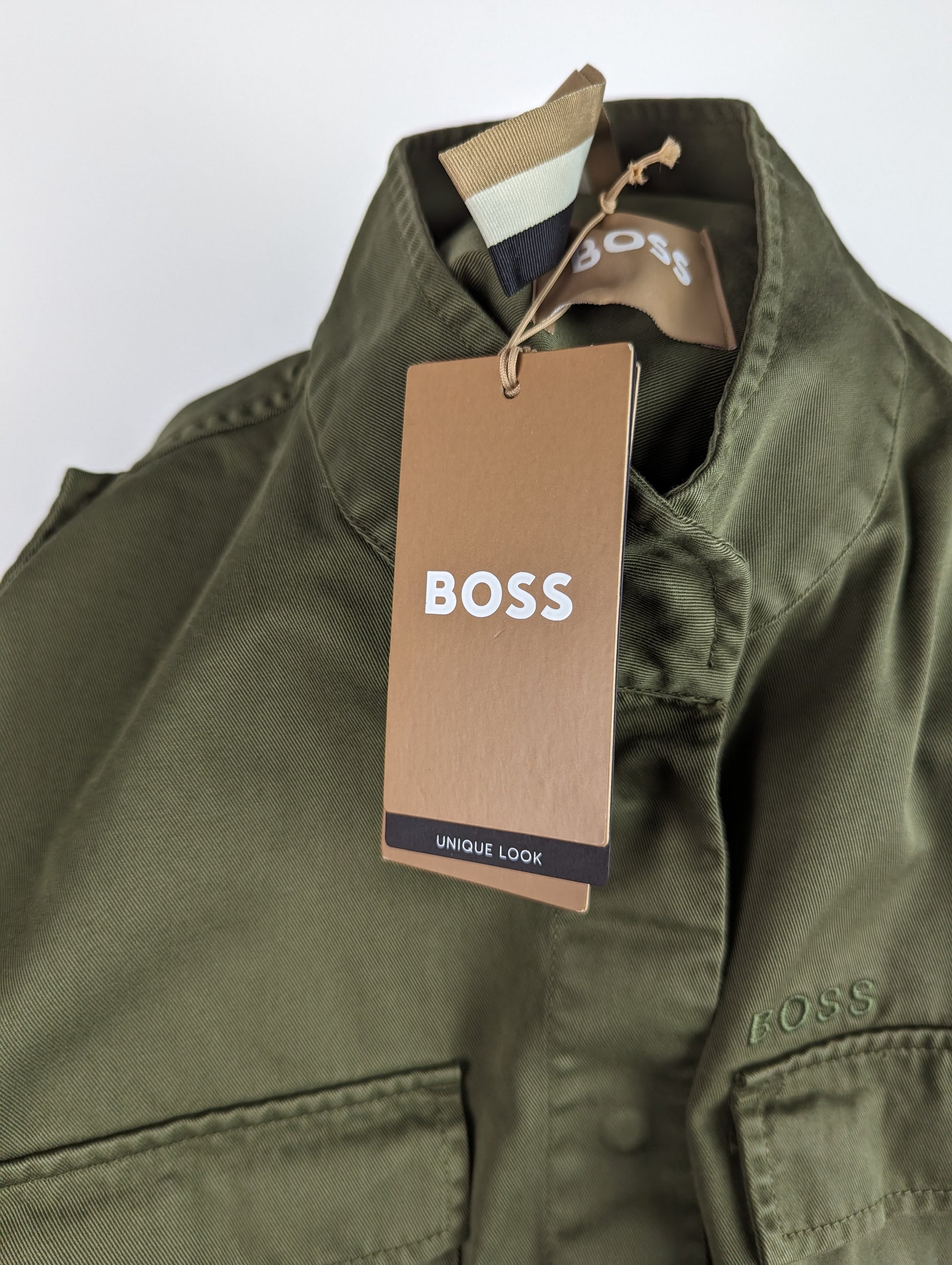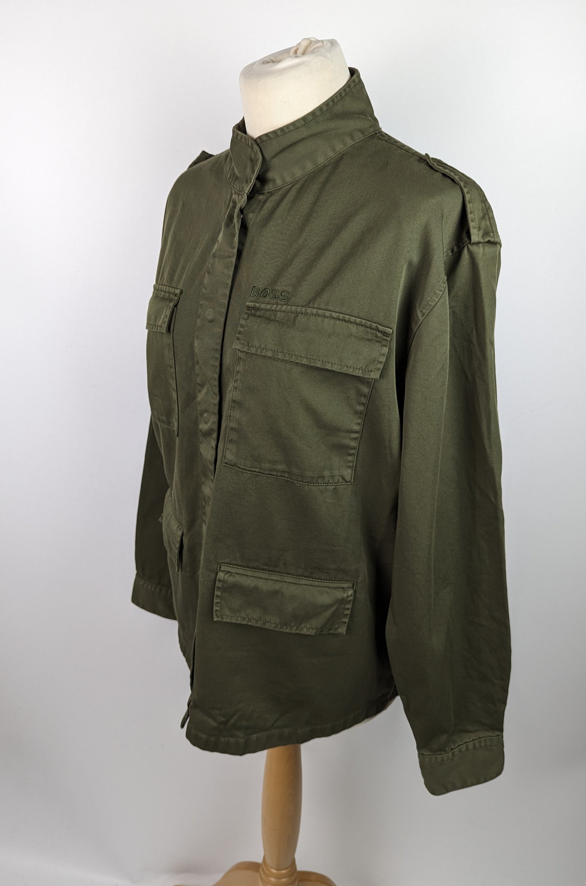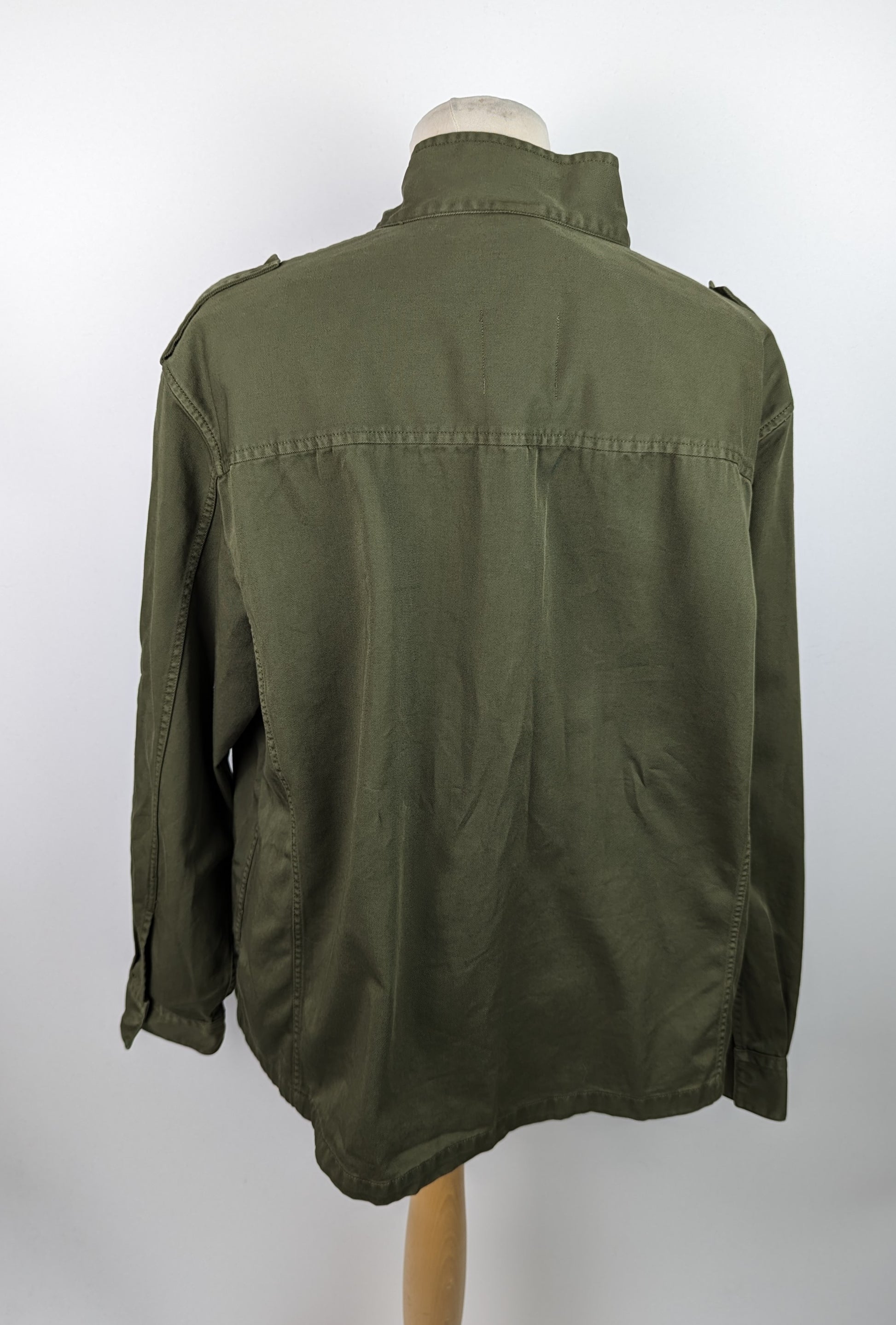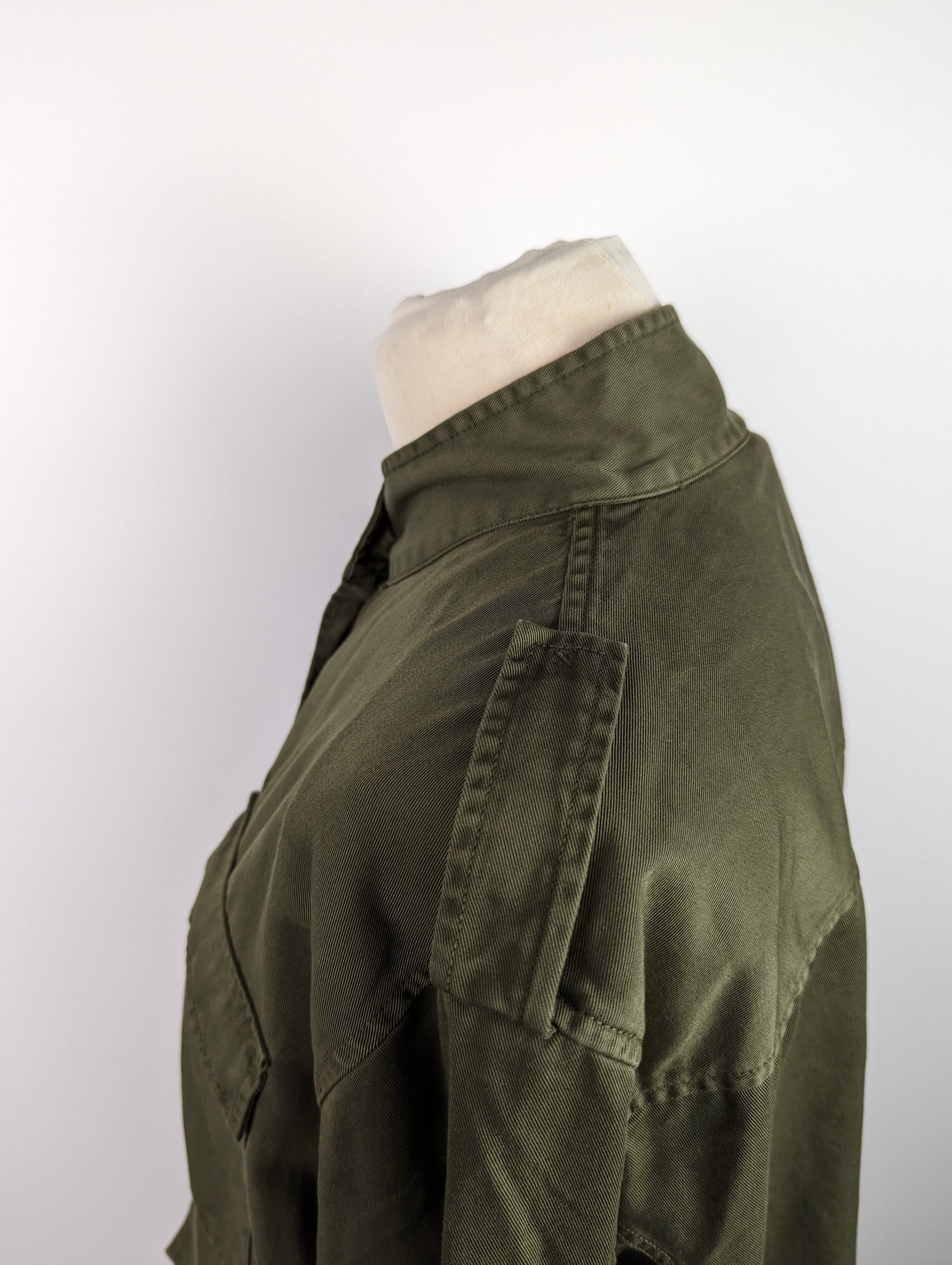 This jacket has a standing collar with a button covered fastening design, making it both simple and elegant. Additionally, it boasts four pockets on the front and an army-inspired aesthetic.