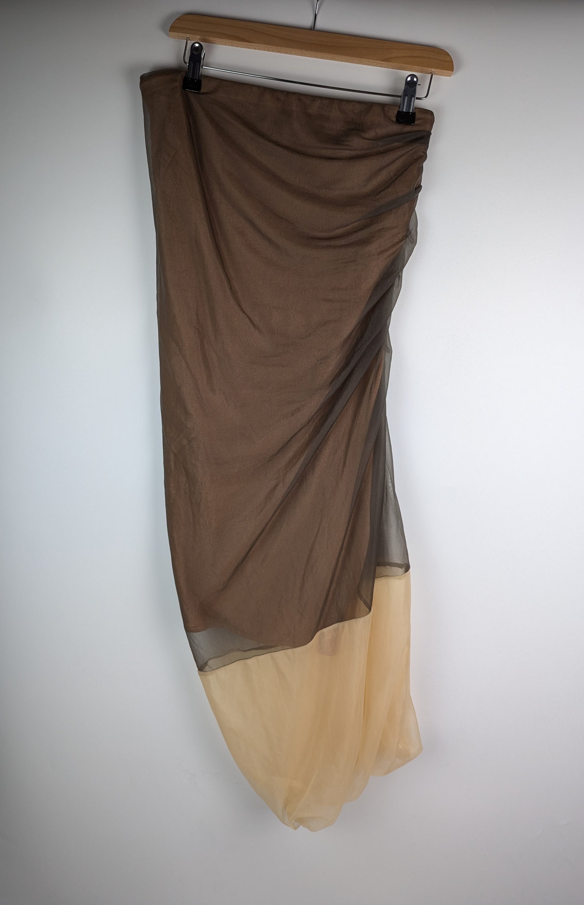 This fitted midi skirt features a mesh outer layer with a lining that extends three-quarters of the length, while the remaining portion showcases contrasting beige mesh. It includes an elastic waistband and a back zipper closure for a secure fit.