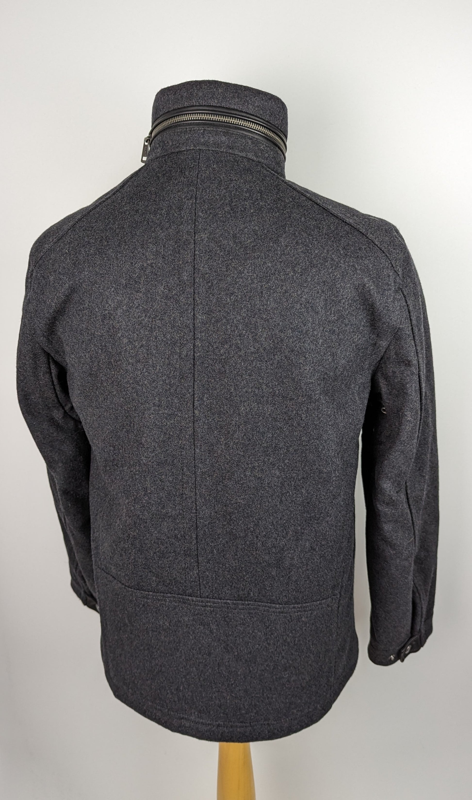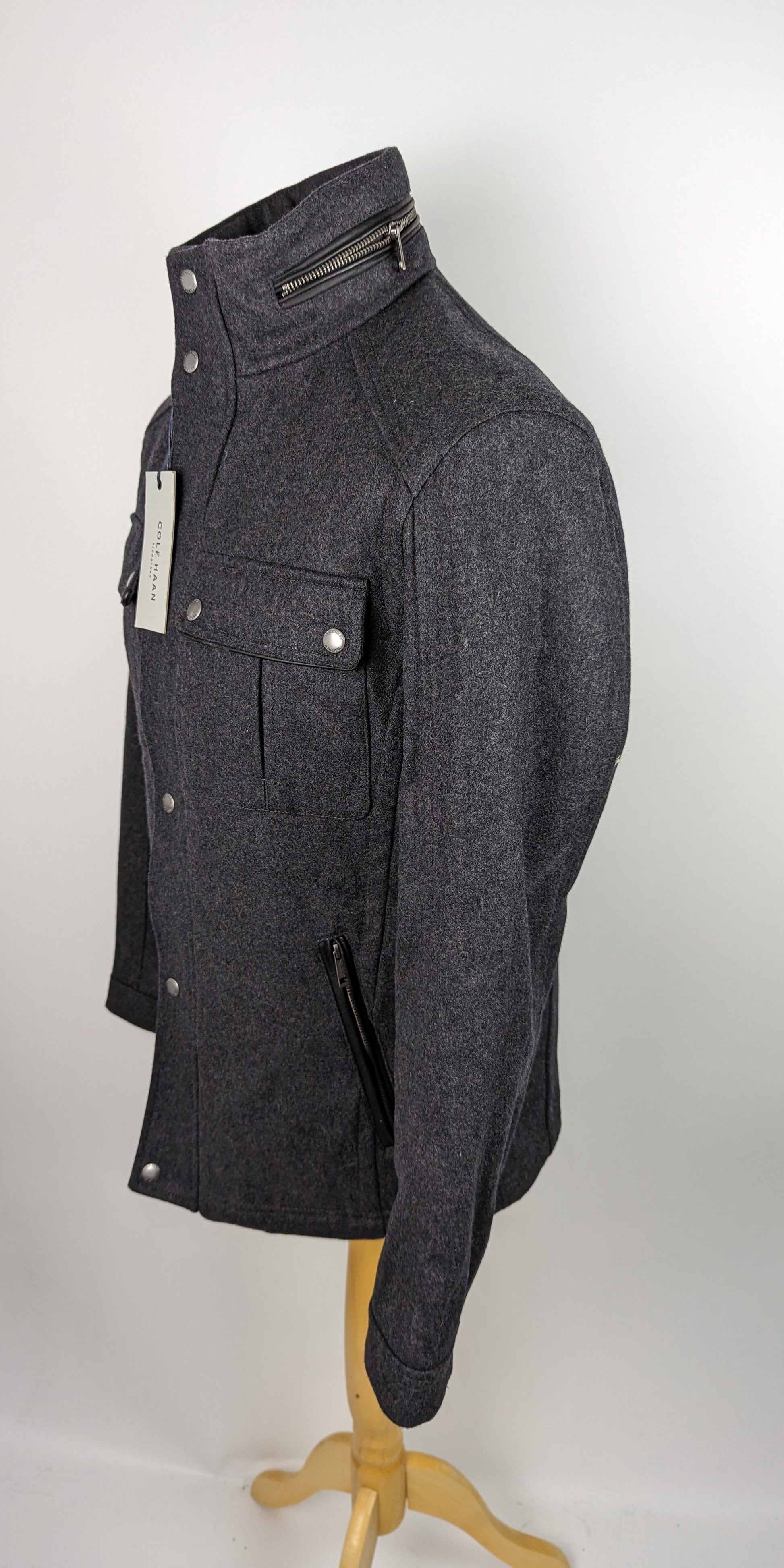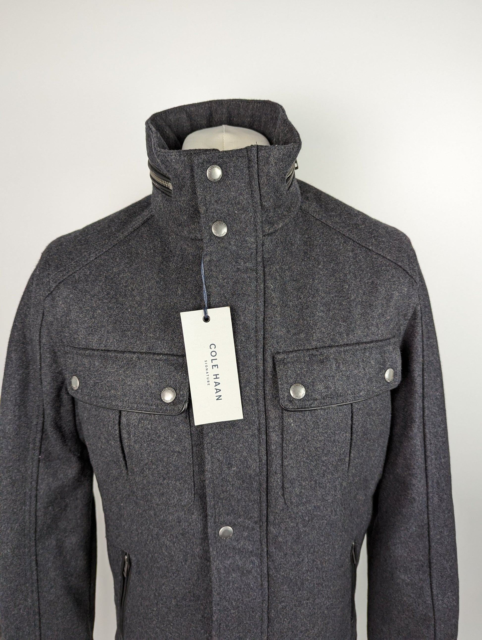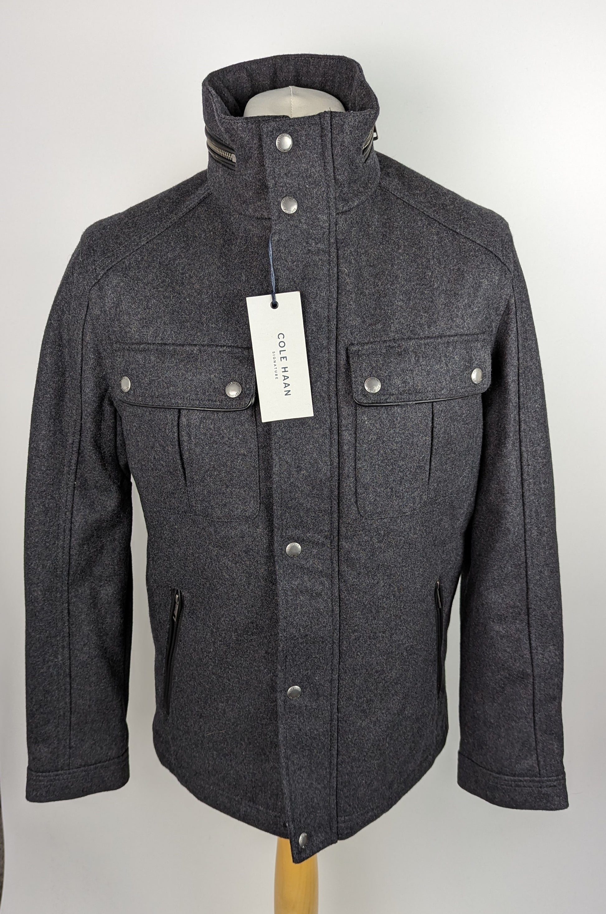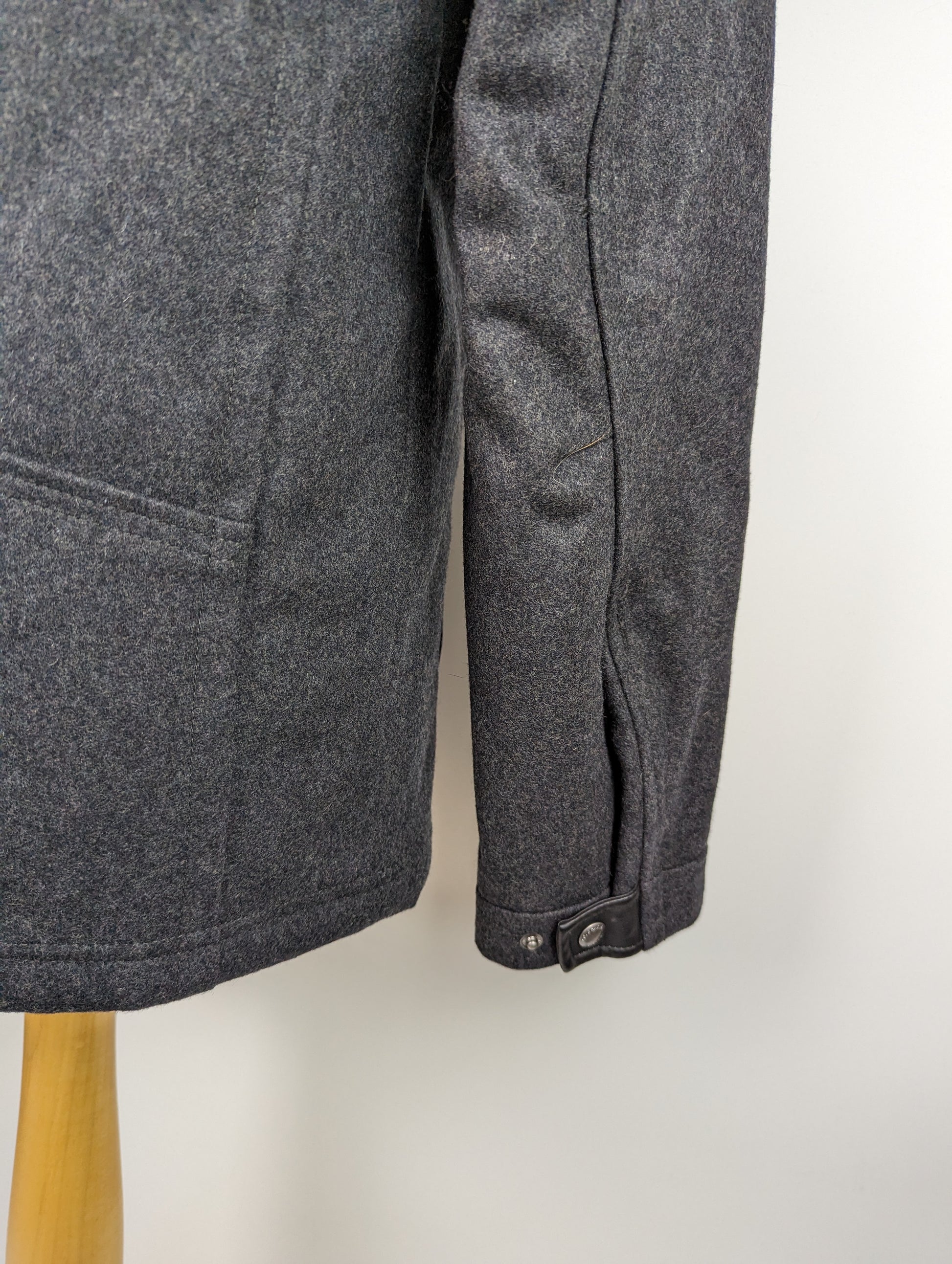 This wool jacket features long sleeves and a mid-weight design, making it perfect for chilly weather. Imported and lined, it also includes zipper pockets at the waist and patch pockets at the chest. The jacket has a zipper closure with a snap overlay at the front, as well as a stand collar and a zip-out hood. Made of a wool/polyester blend with a polyester lining and faux leather accents of acrylic/spandex.