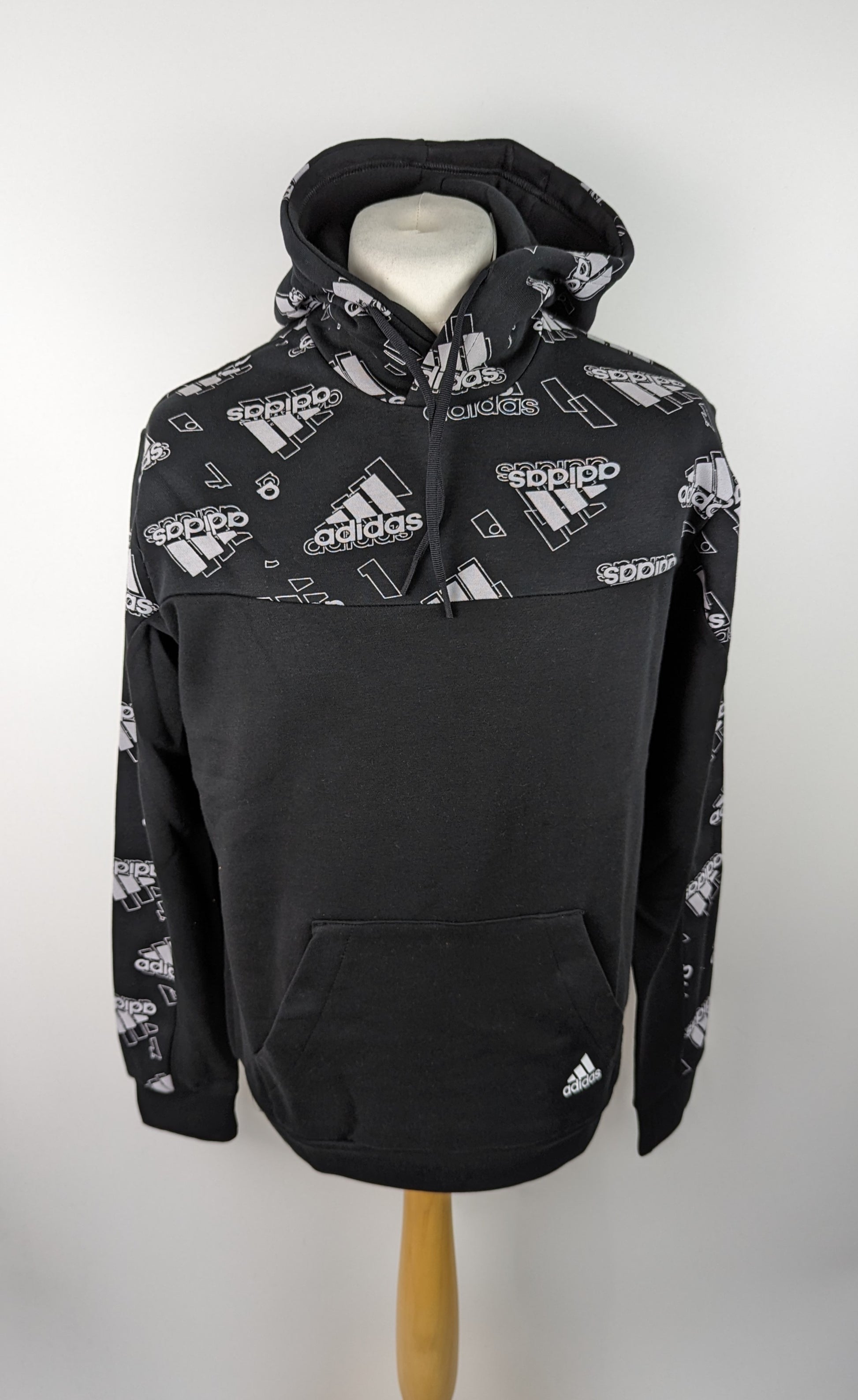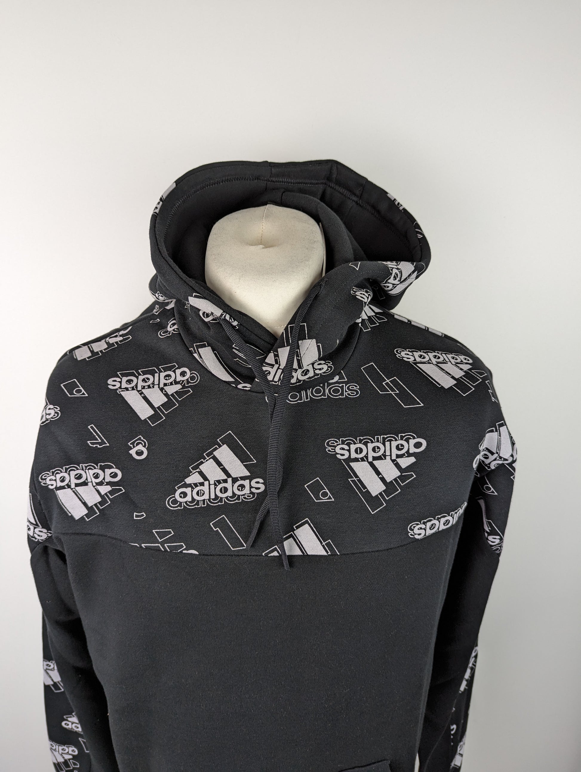 Upgrade your casual wardrobe with this adidas GFX hoodie. Crafted in all black for a modern feel, it is designed with long sleeves and ribbed trims, plus adjustable drawstring hood and kangaroo pocket elements; perfect for everyday comfort. Completely lightweight construction ensures freedom when you move as well as featuring printed detailing across the front, back and sleeves.