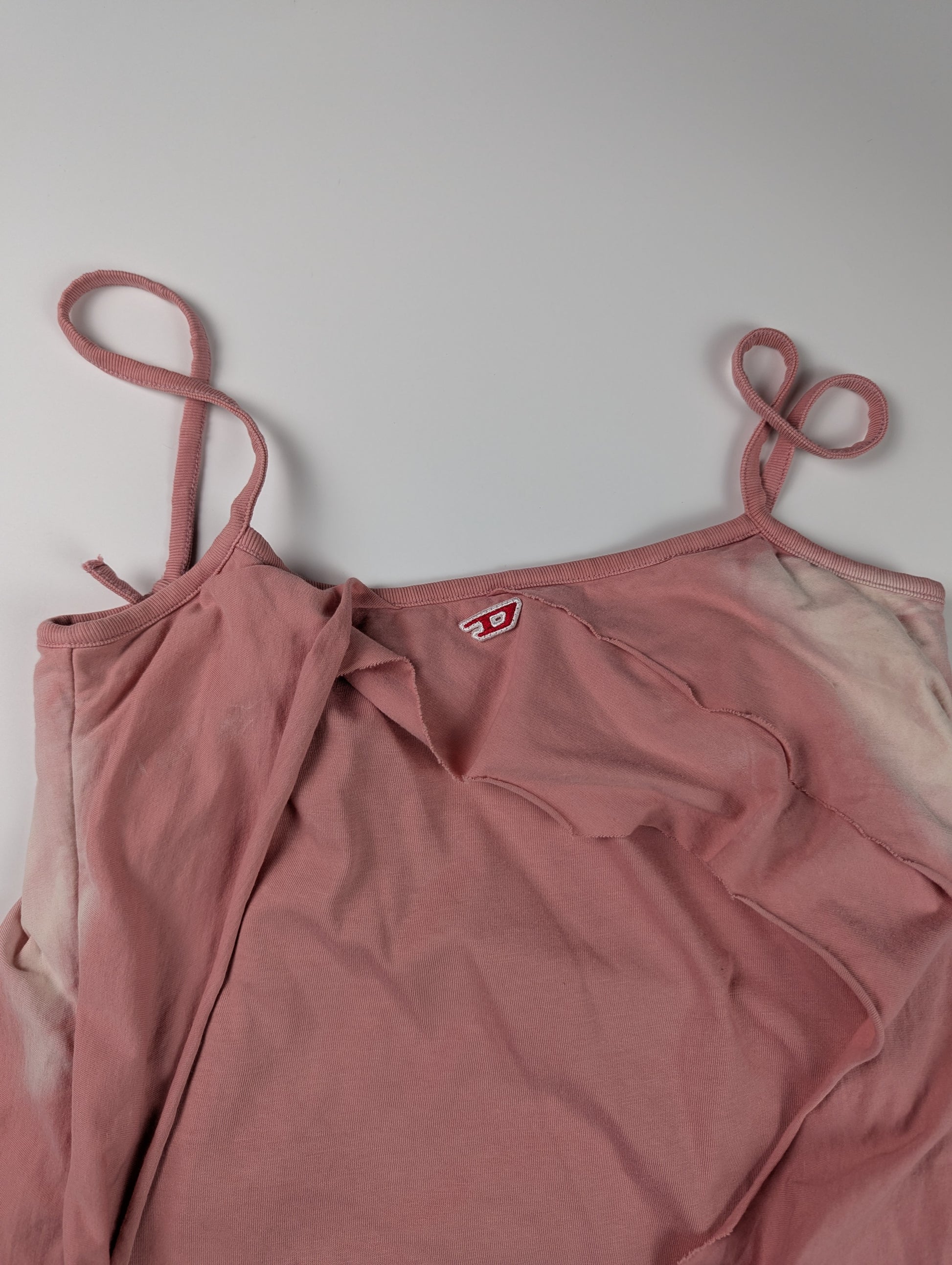 This women’s short dress is designed with slashed jersey layers that hang off the silhouette, creating a destroyed peel-off effect. Detailed with an embroidered D patch, it has thin spaghetti straps and a faded finish at the neckline and hem.