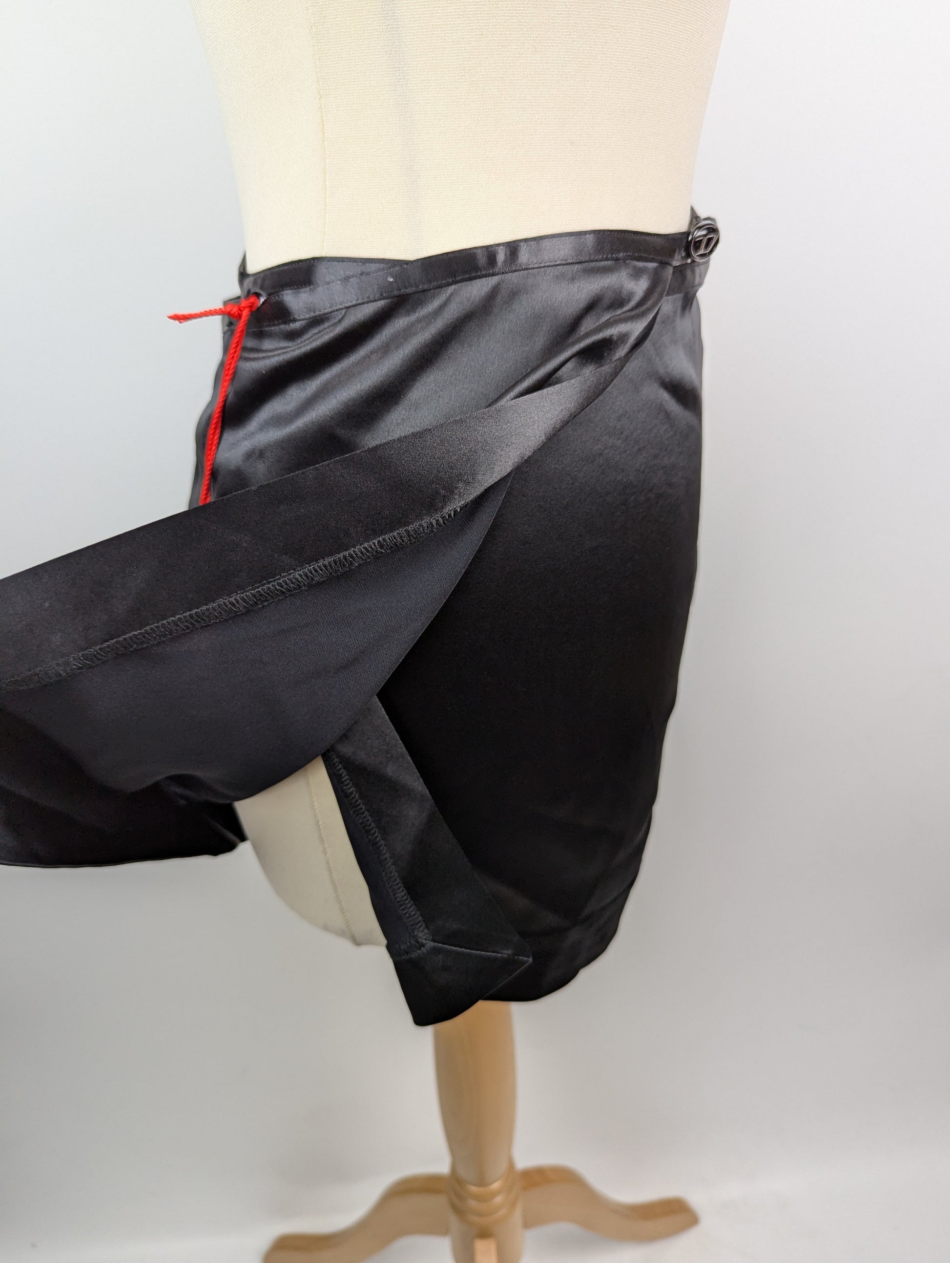 This mini skirt features navy and black colour blocks highlighted by white contrasting details. It wraps around the waist and secures with a belt-like fastening for a tailored fit.
