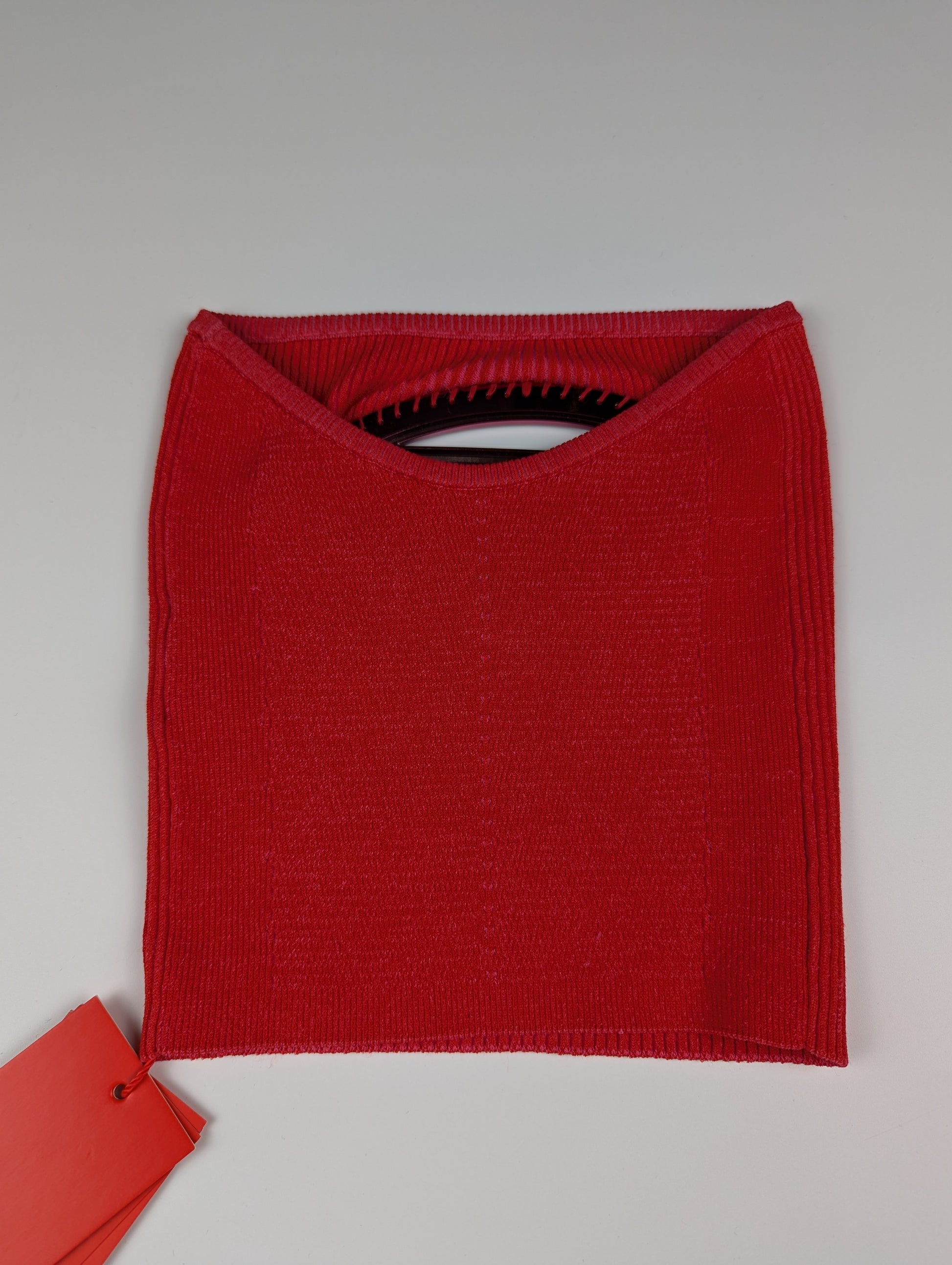 This sleeveless bando features ribbed stretch fabric and is accented with a prominent pink metal logo on the chest.