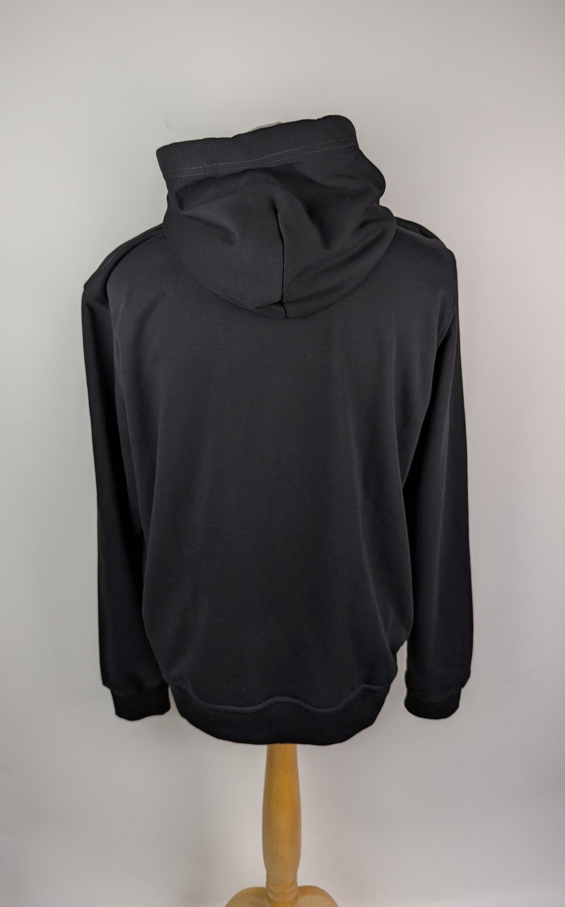This refined pullover hoodie features a striking black logo across the chest, paired with practical drawstring detailing on the hood for adjustable comfort. The kangaroo pocket provides functional storage, while ribbed cuffs and hem ensure a polished, tailored silhouette that maintains its shape through regular wear.