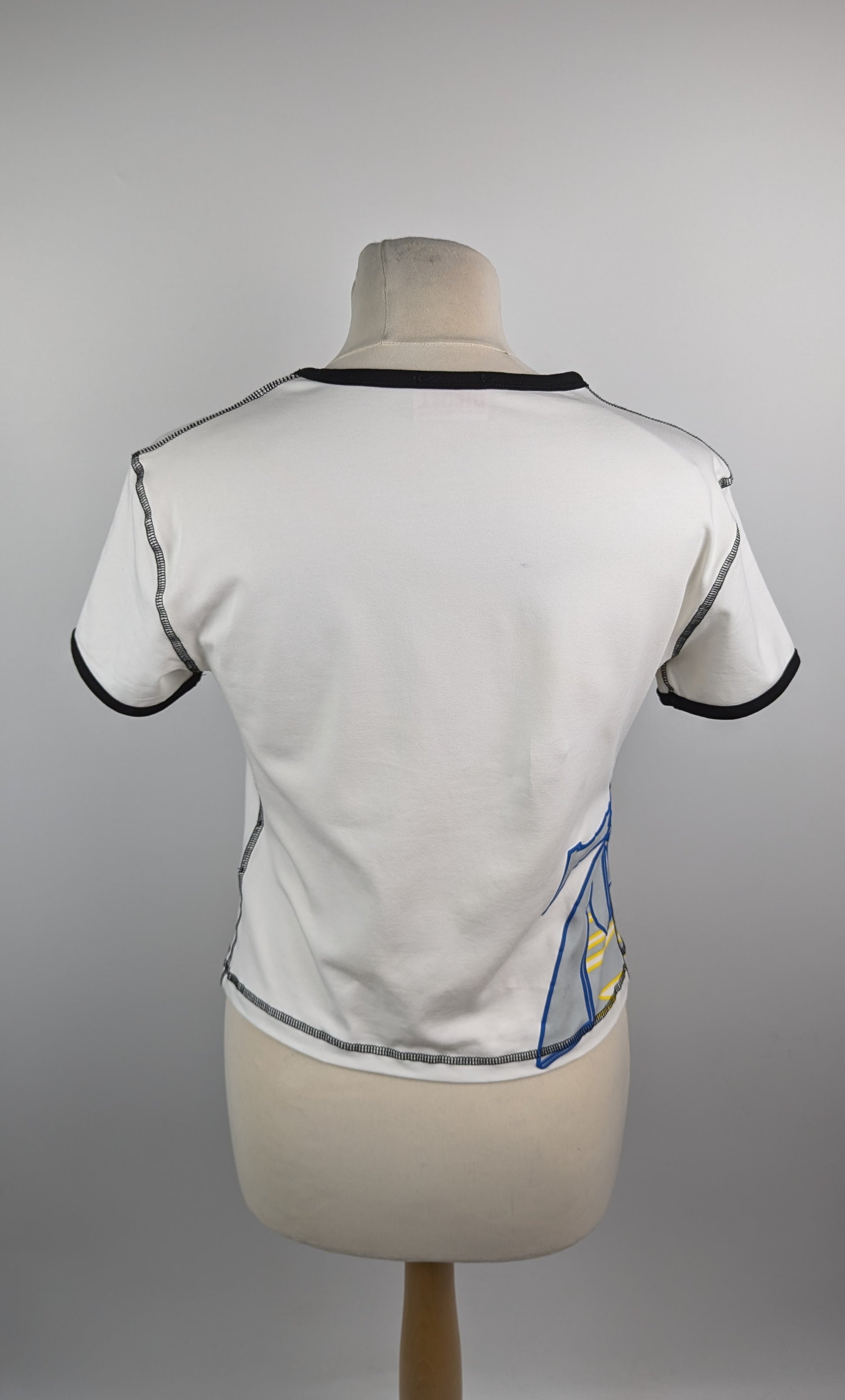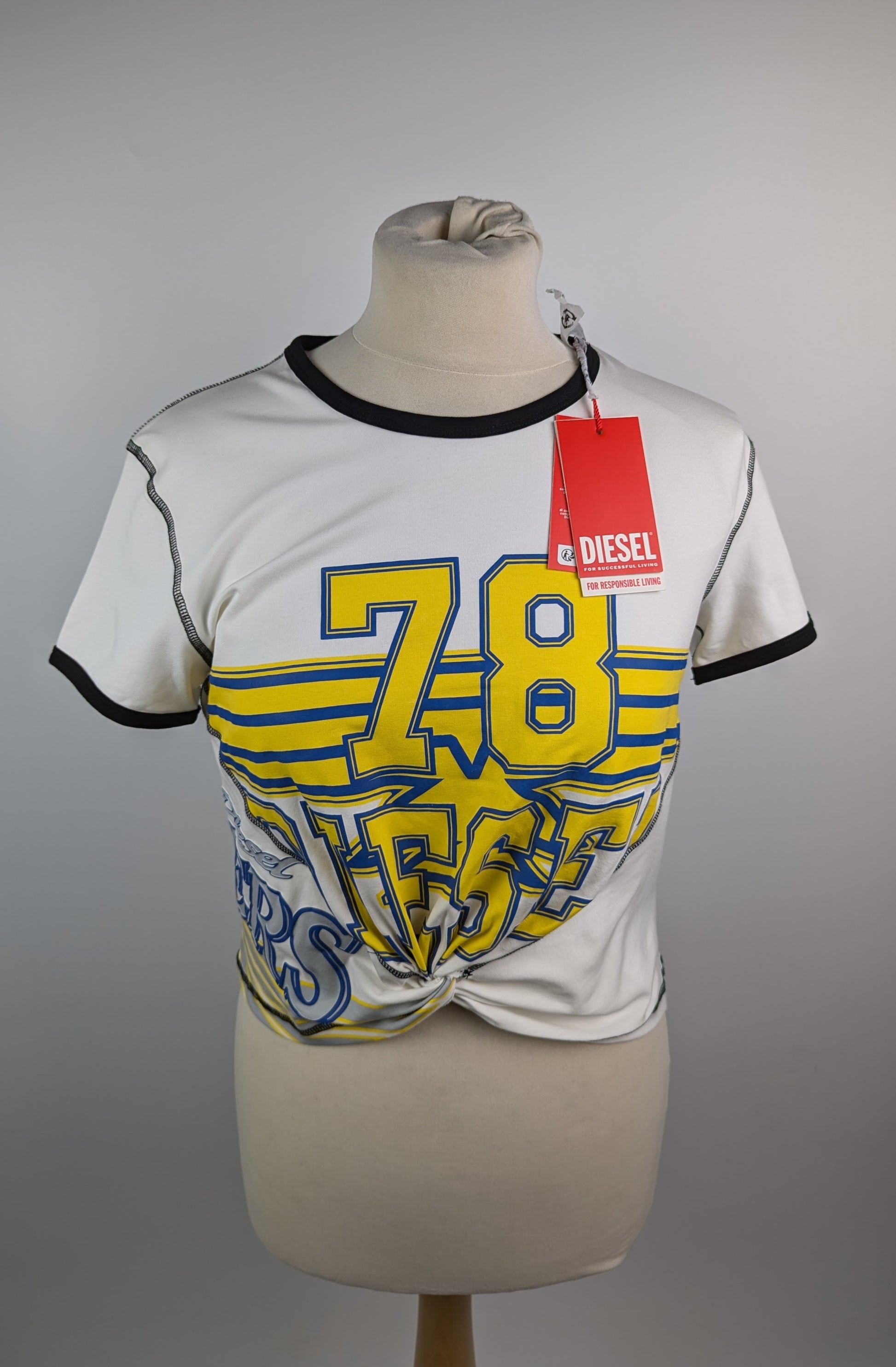 Women's Diesel T-Lison T-Shirt. A tight white T-shirt that easily fits into the wardrobe of a carefree student. The characteristic print contrasting trim on the cuffs and round neckline a decorative knot that reveals the waist - all this makes the model as casual as possible.- Crew neck.- Short sleeves.- Straight hem.- Contrasting seams.- Ruberrized print in yellow and blue.- Decorative knot on the front.- Slim fit. Material: 93% Cotton 7% Elastane
