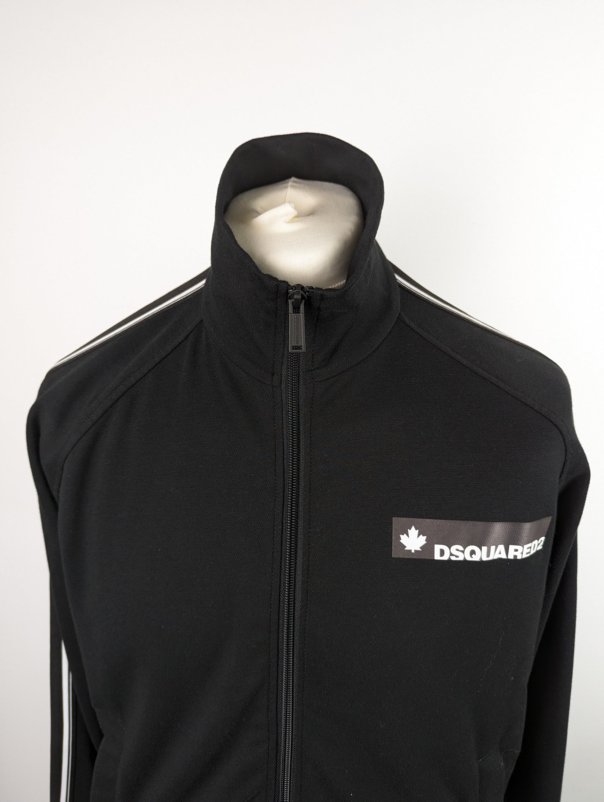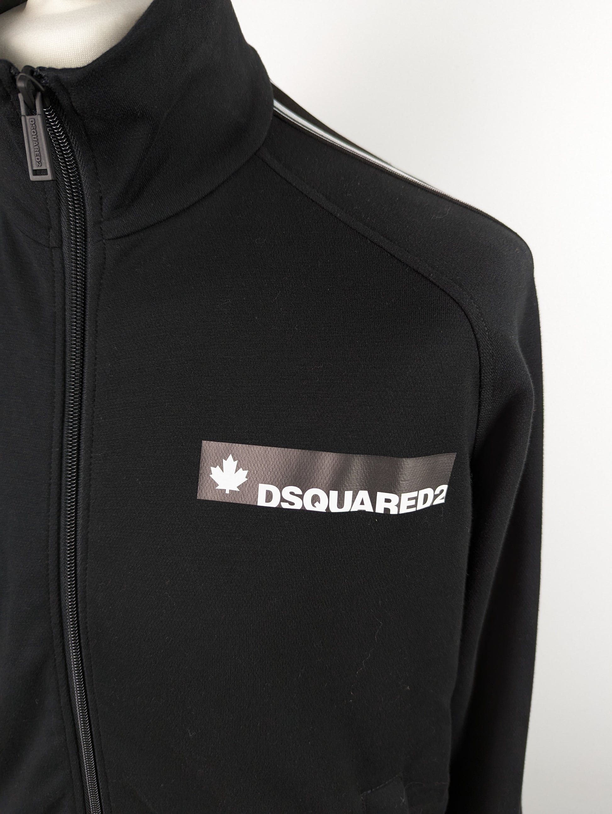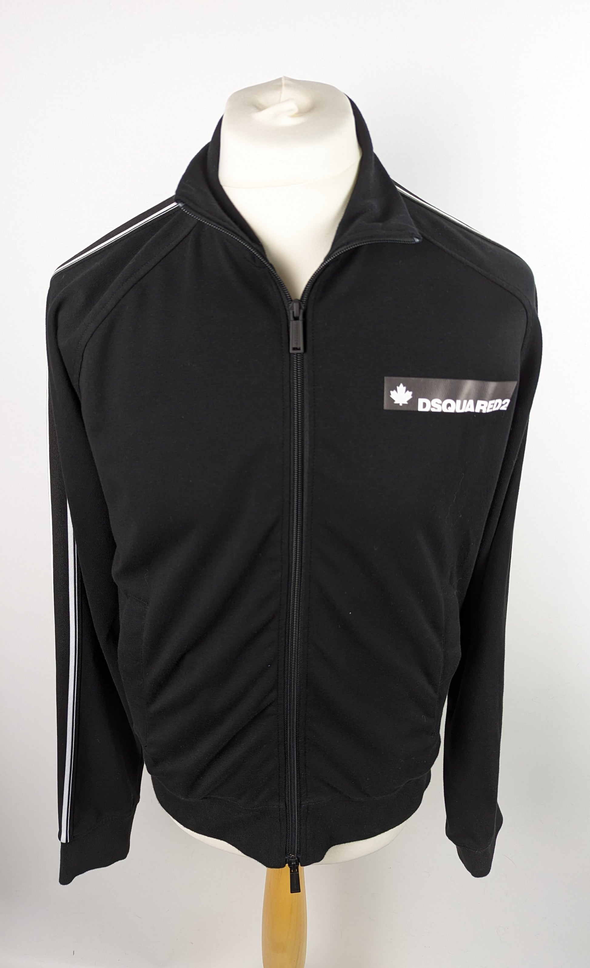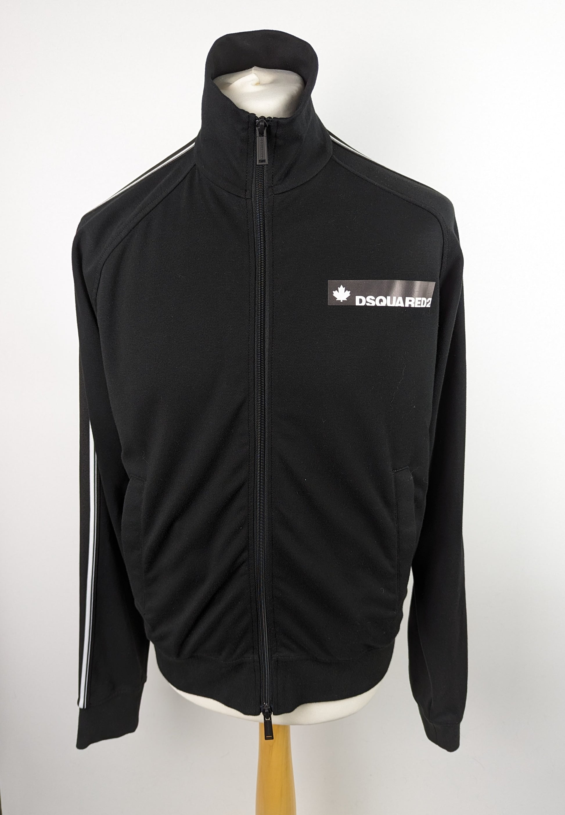 Men's classic track top by designer brand DSQUARED2. Black polycotton blend fabric, with stripe detail to the sleeves, and full length zip fastener. Featuring a large printed logo to the chest. From the 2022 S/S collection.
