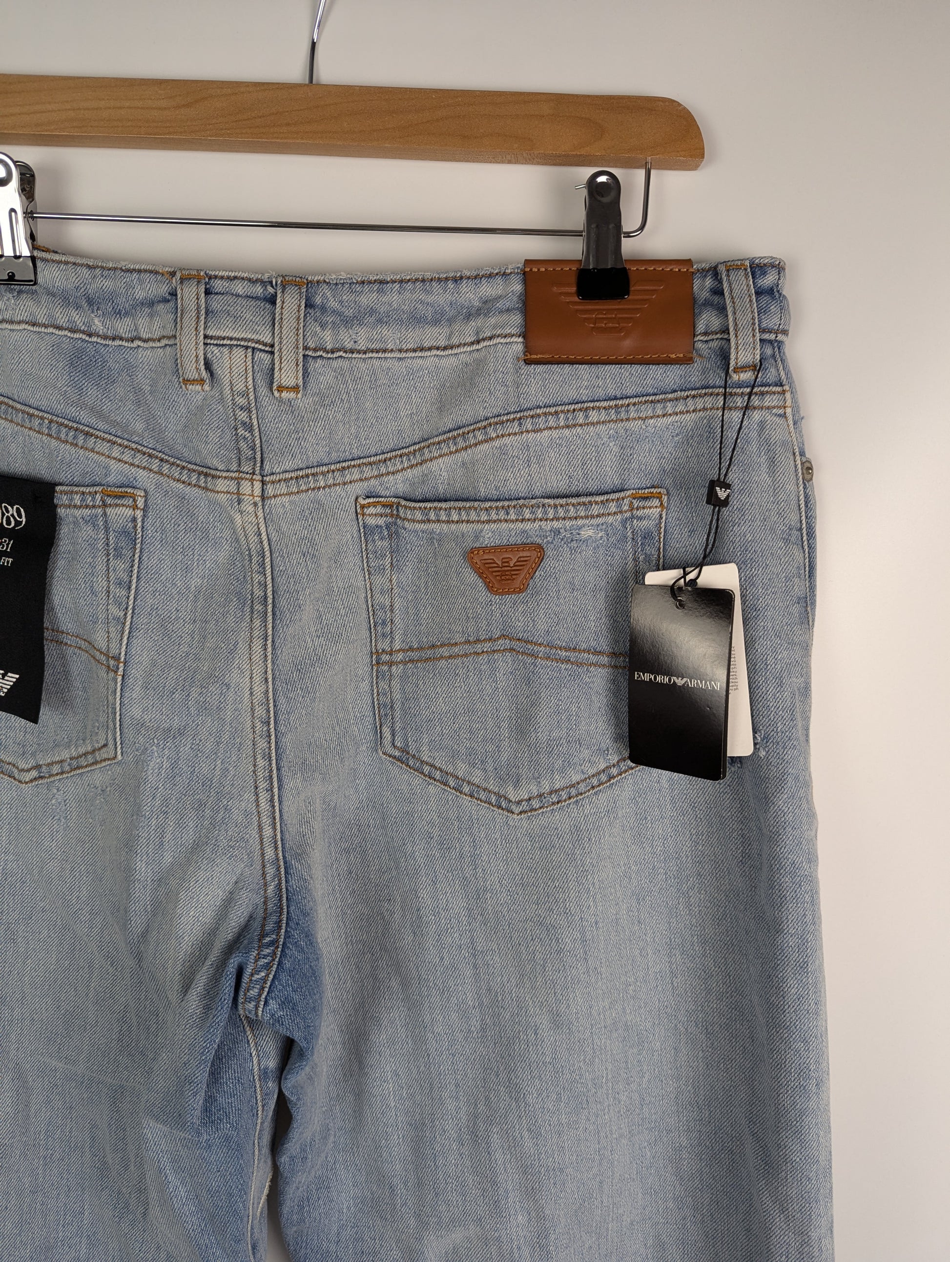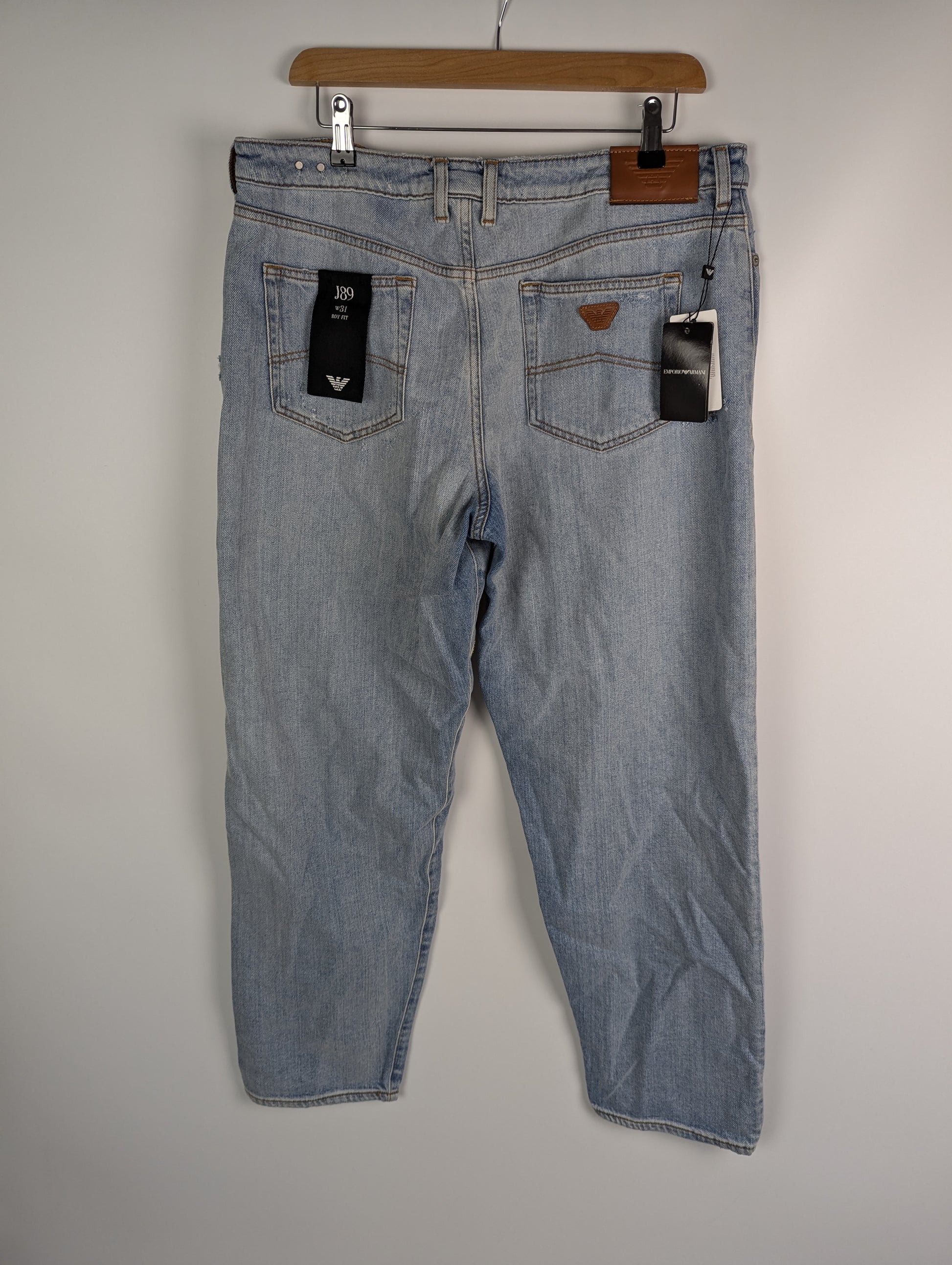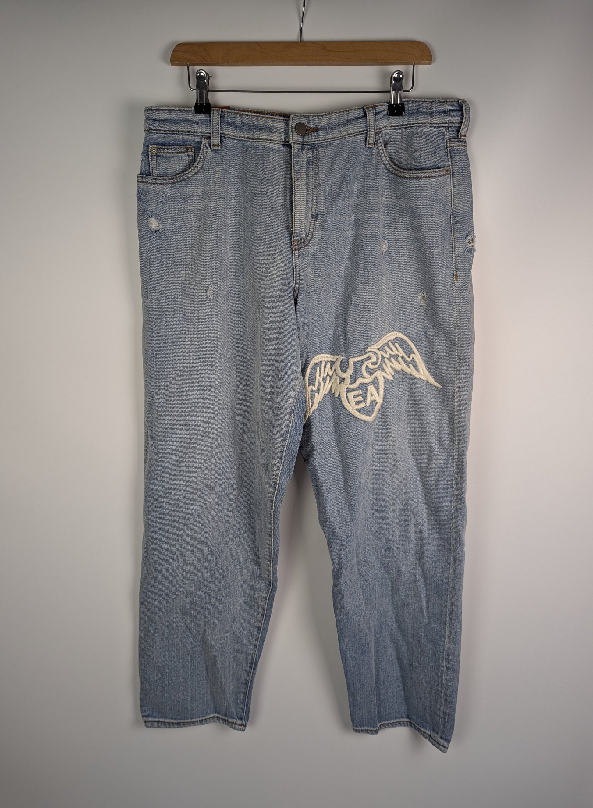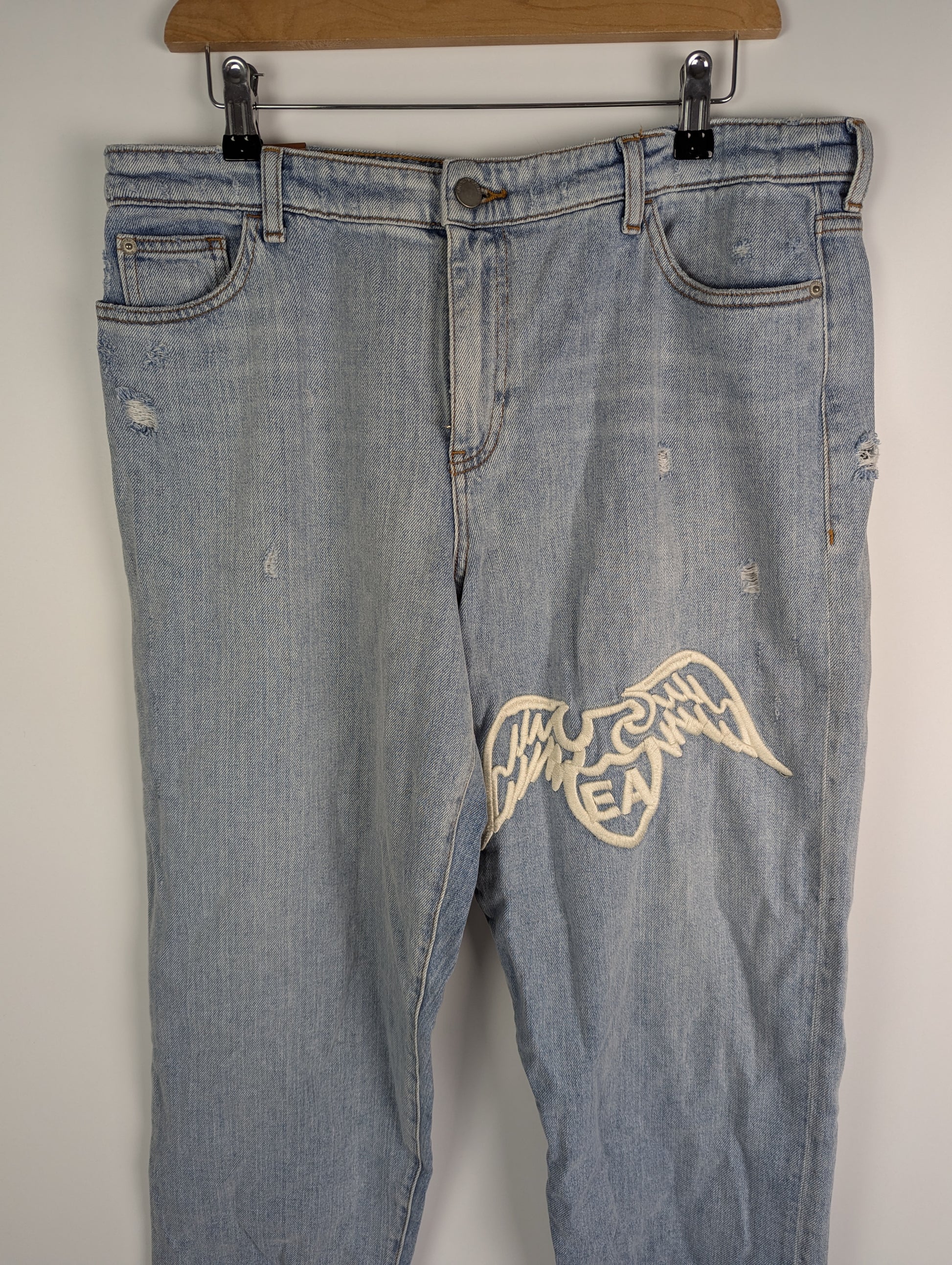These Emporio Armani Logo womens Jeans in Blue feature a boy fit with a zip fly fastener. The jeans are also embellished with multiple rips and an embroidery detail on the leg.