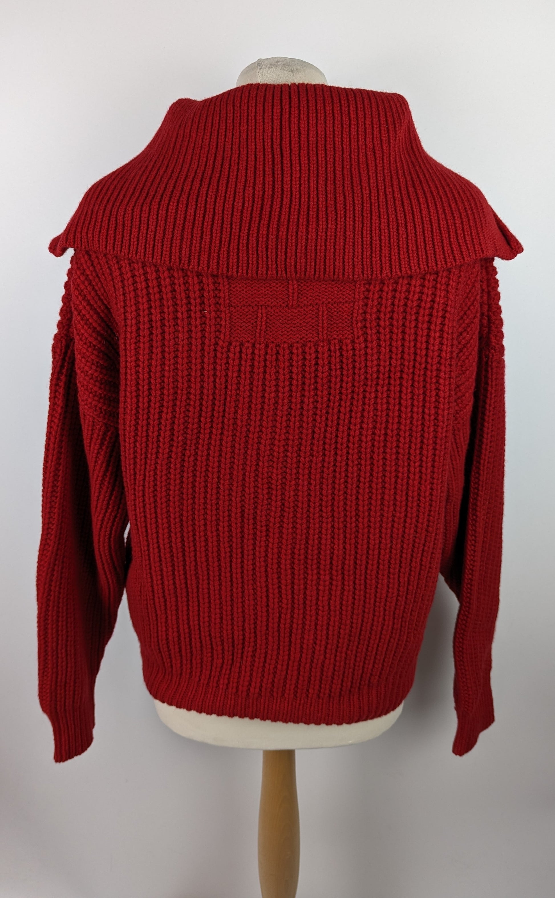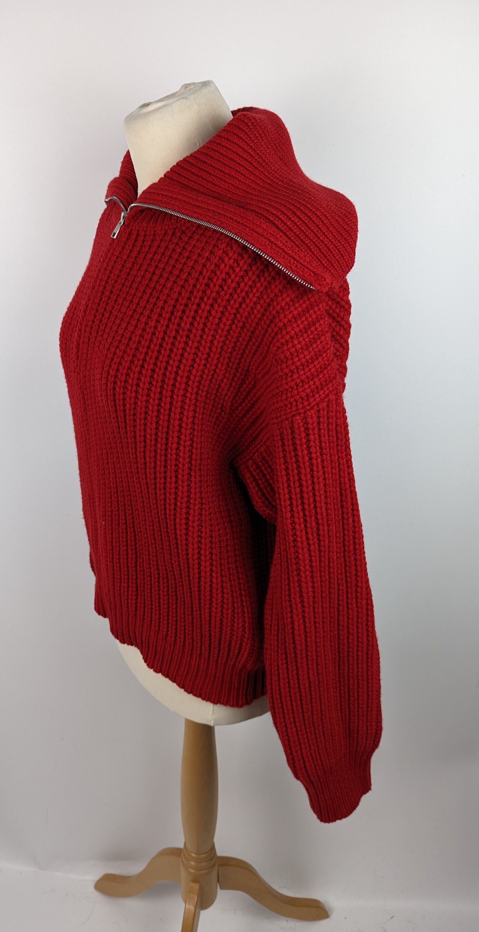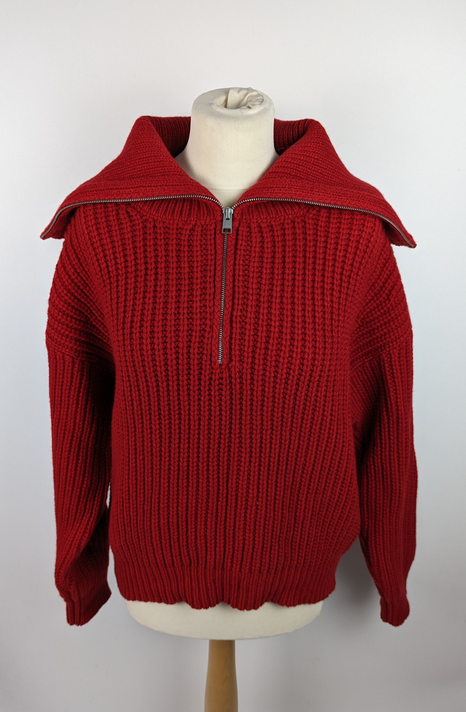 Chunky knit sweater from Los Angeles label FRAME. The Half Zip Rib Knit features a 90's inspired, slightly cropped fit, and is the perfect addition to your knitwear collection. Crafted from 100% merino wool in a chunky rib knit, the bold scarlet red brings a touch of colour to your outfit. Pair with tailored trousers or your favourite jeans for a range of seasonally transitional looks.
