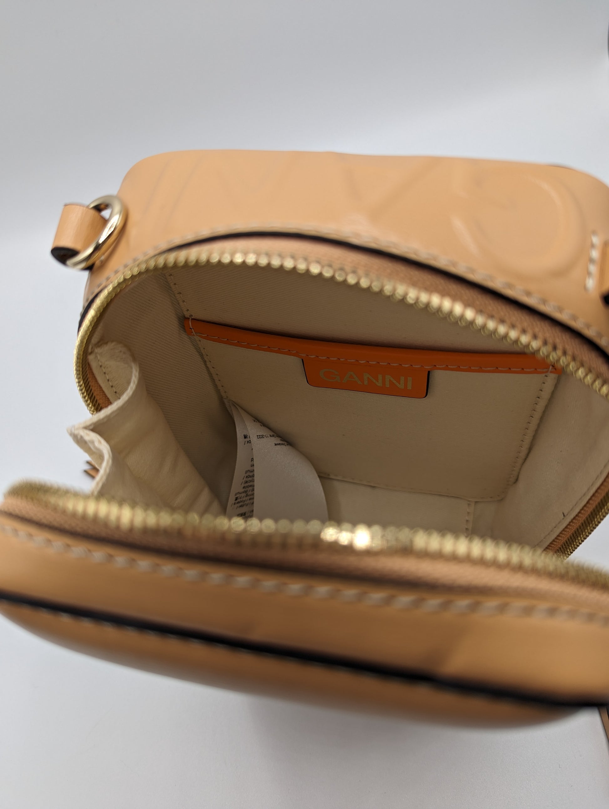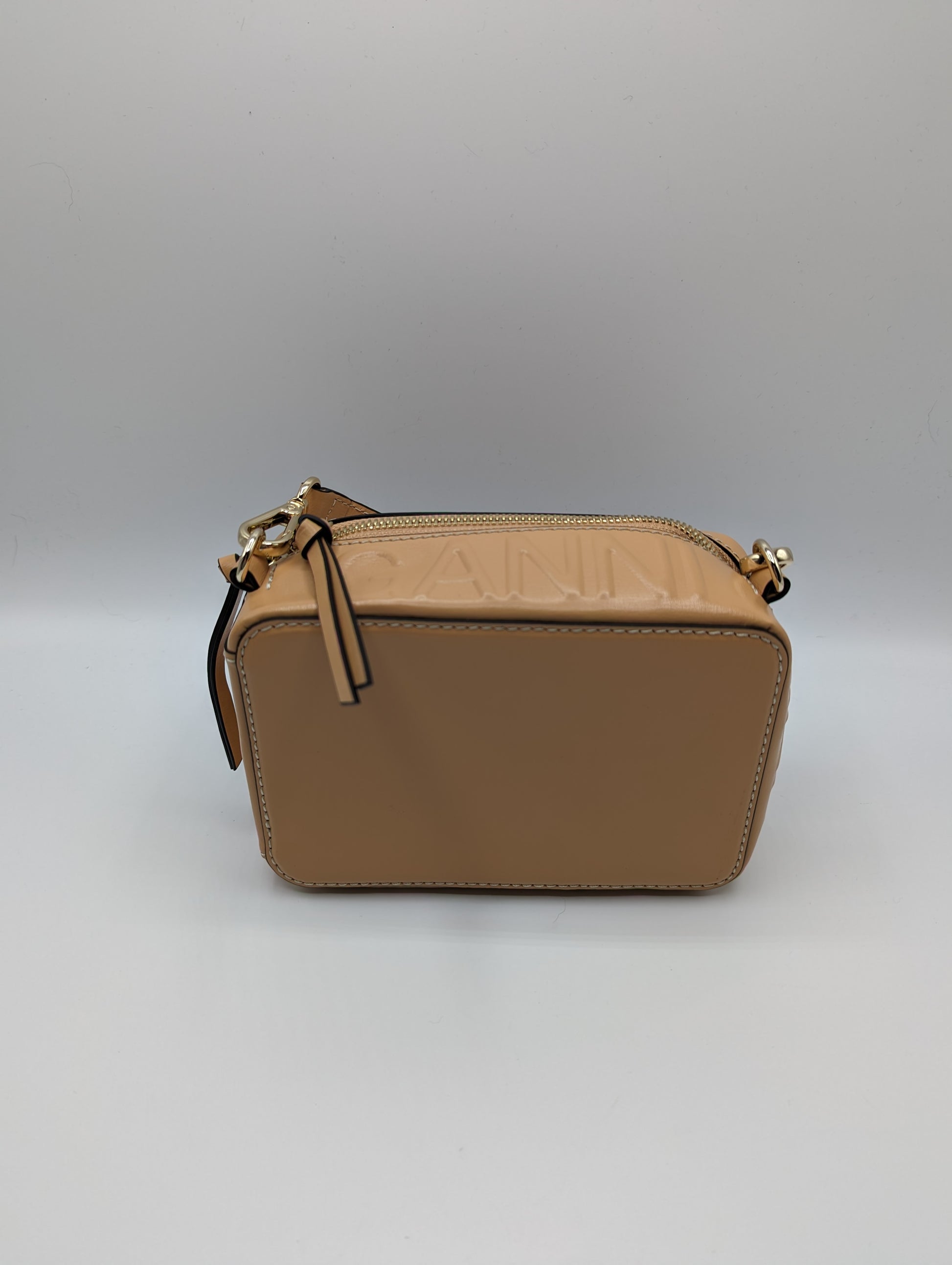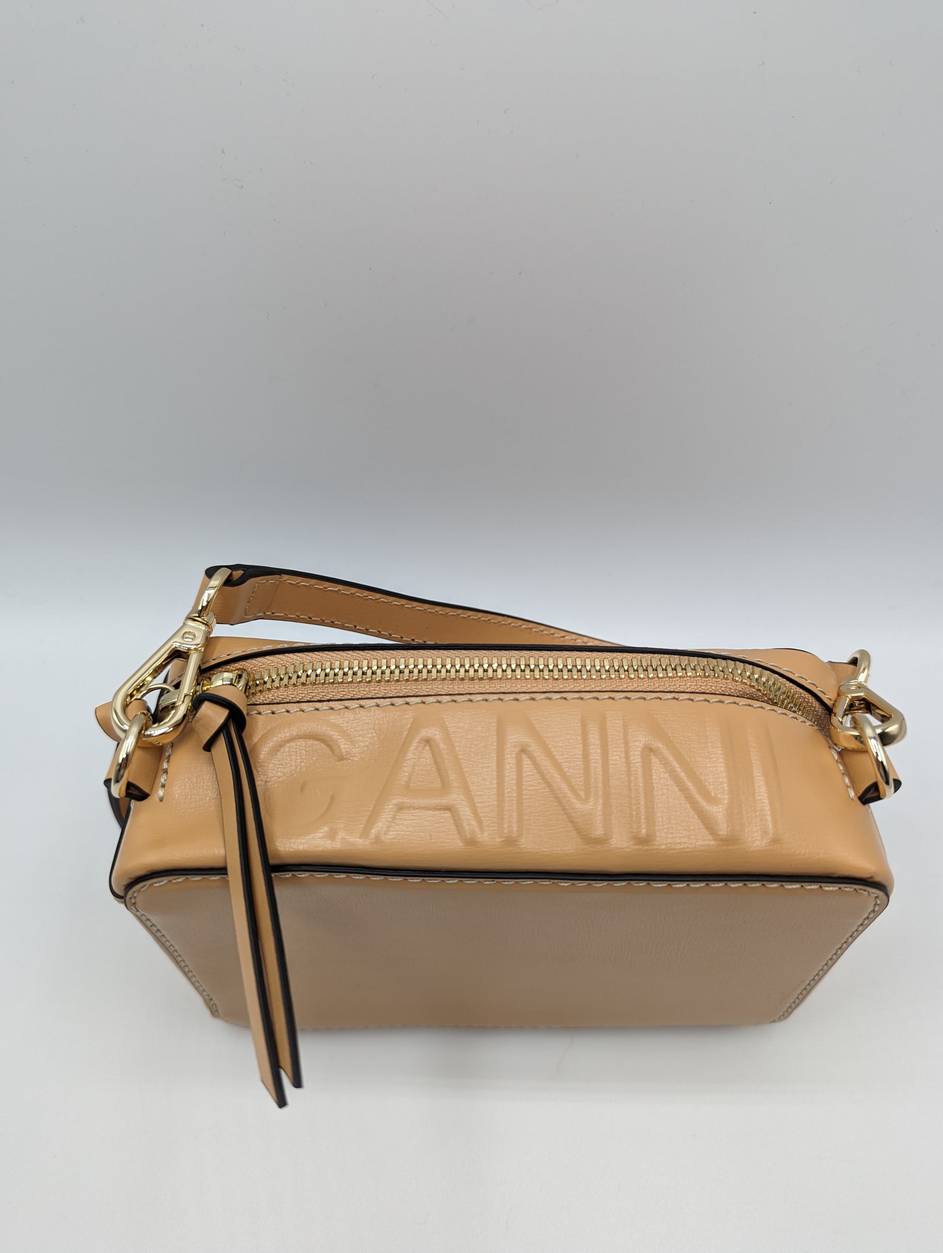 This small-sized GANNI Banner Camera Bag in Tan features a top handle for convenient carrying and 3 hooks for customizable handle placement. Made from 100% leather and measuring H: 20cm x W: 15cm x D: 6cm, this bag is both stylish and functional.
