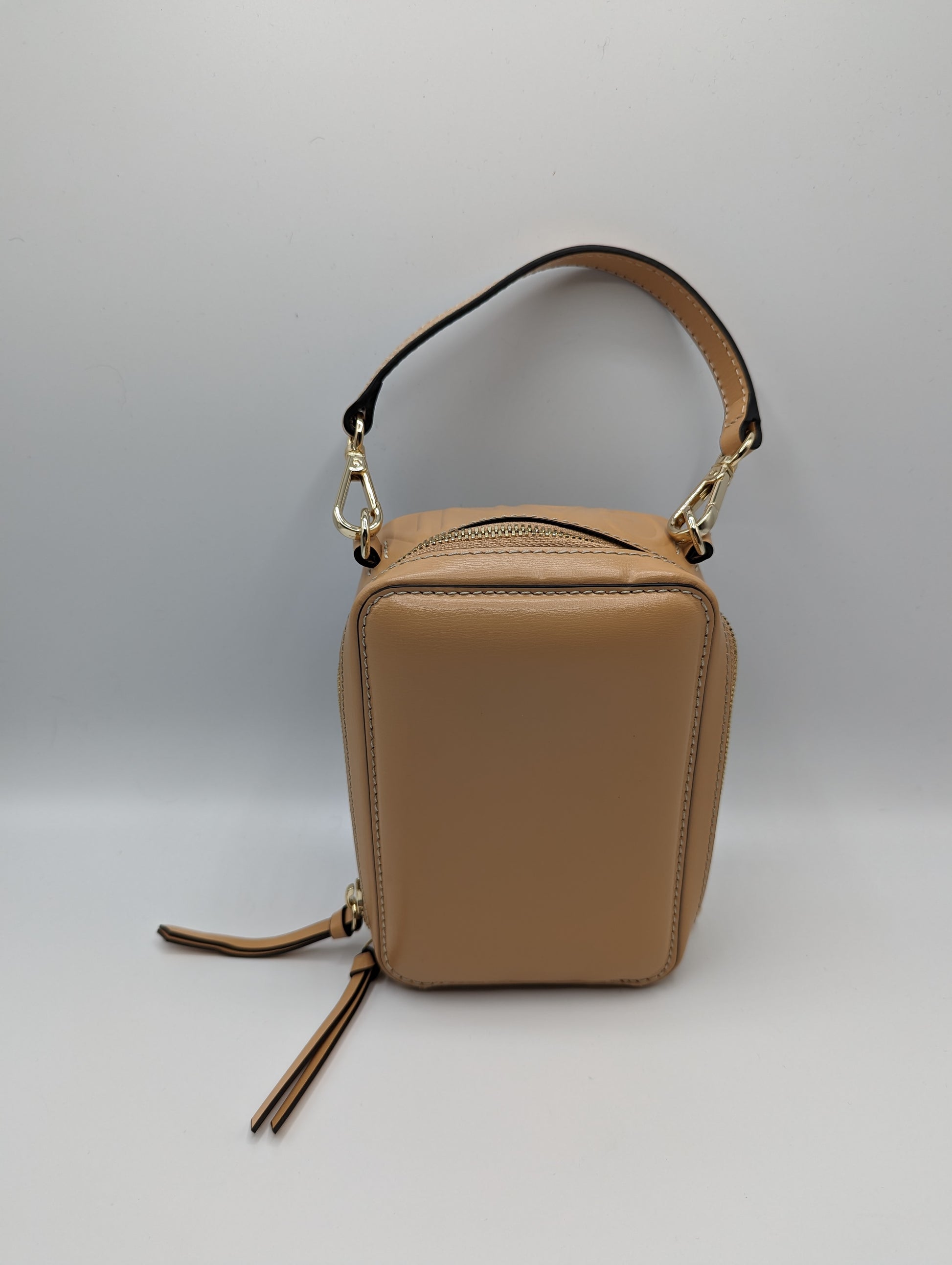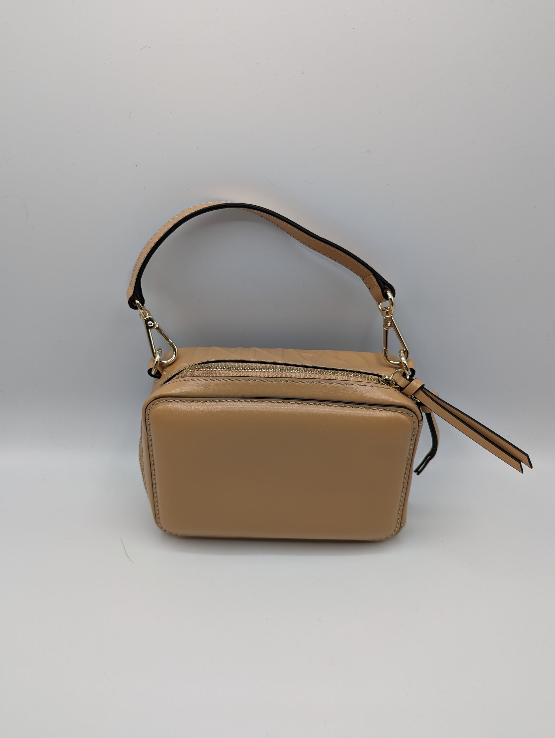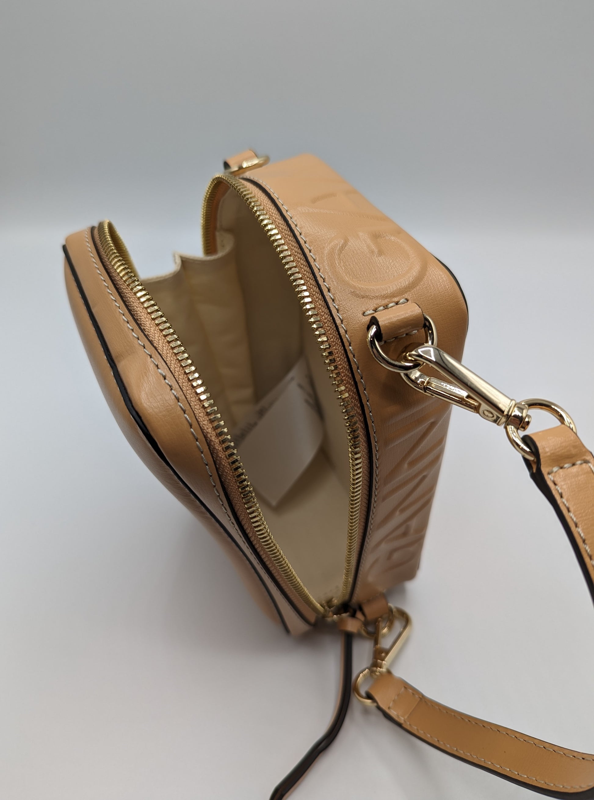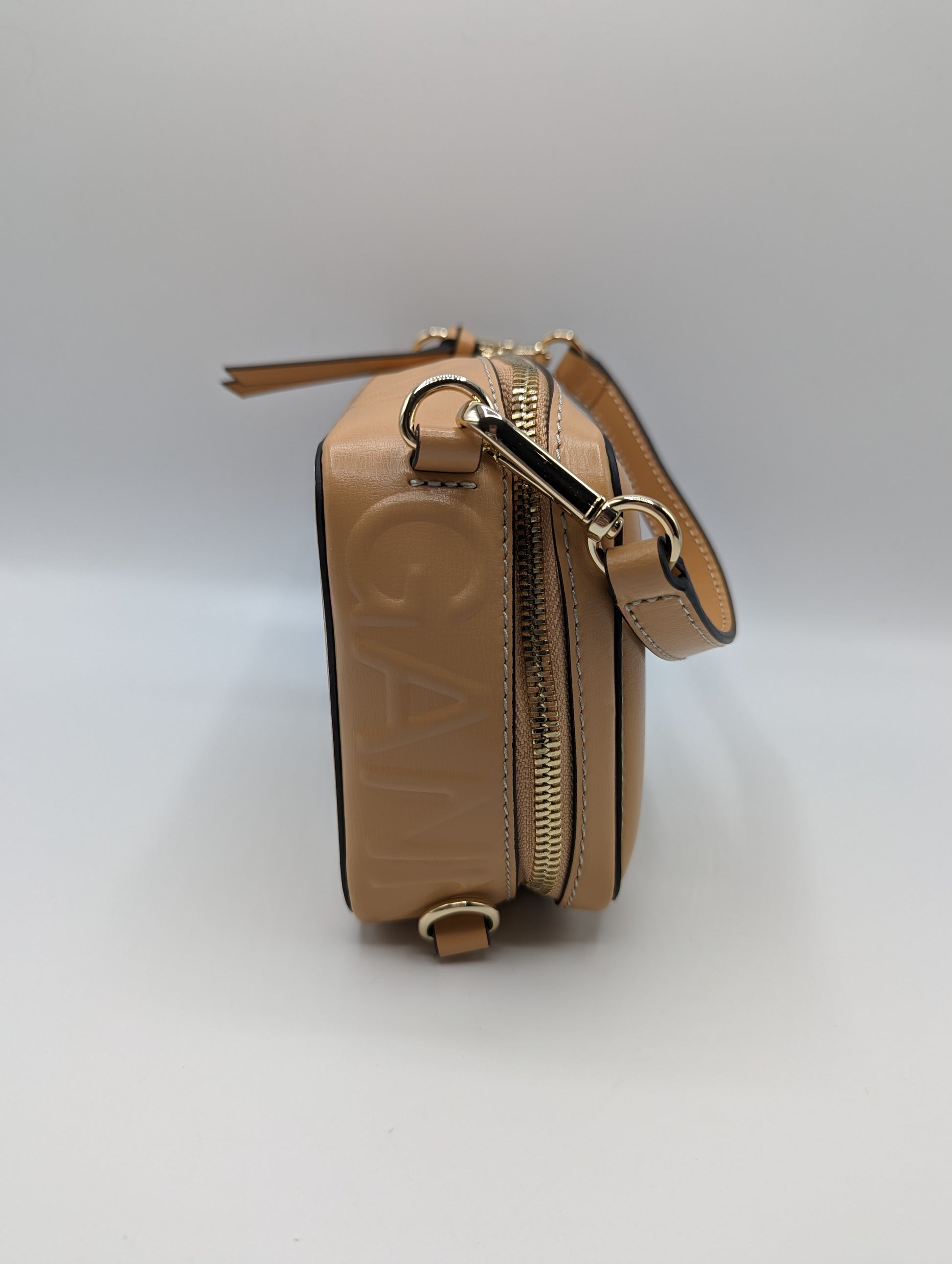 This small-sized GANNI Banner Camera Bag in Tan features a top handle for convenient carrying and 3 hooks for customizable handle placement. Made from 100% leather and measuring H: 20cm x W: 15cm x D: 6cm, this bag is both stylish and functional.