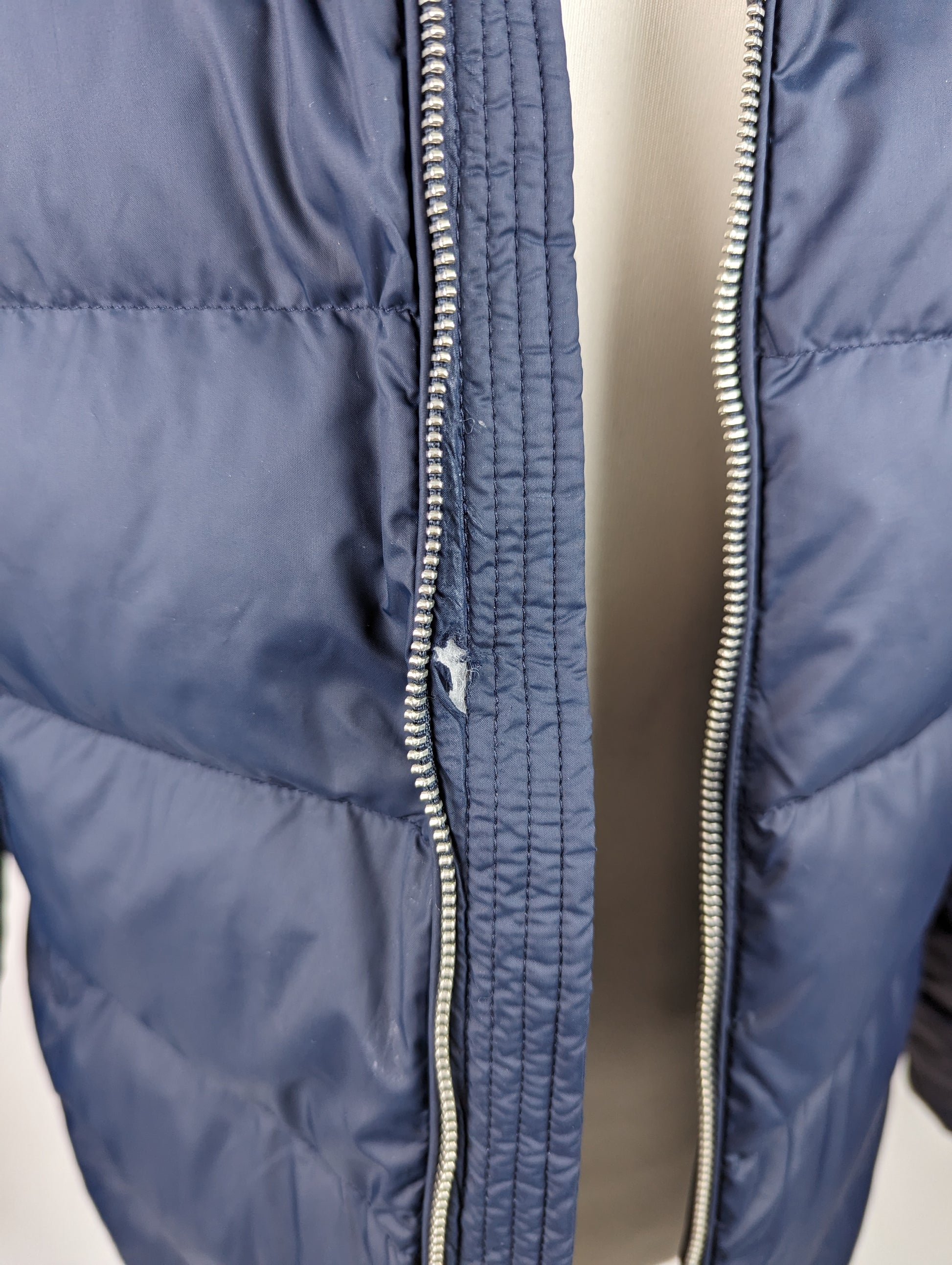 Brand new with tags. The zip does get caught on the lining, this has made a hole on the lining. Please refer to the photos, other than this perfect condition.