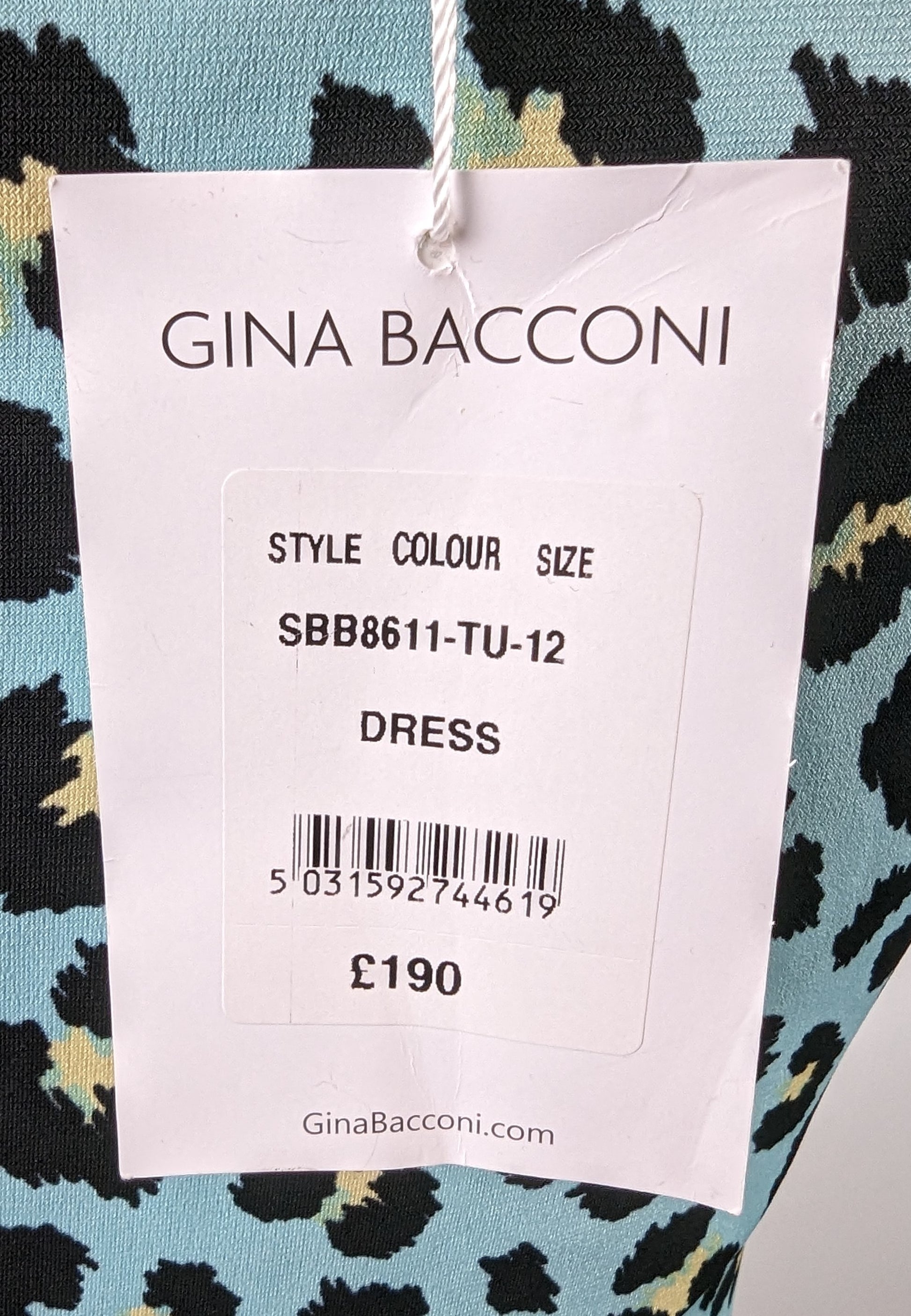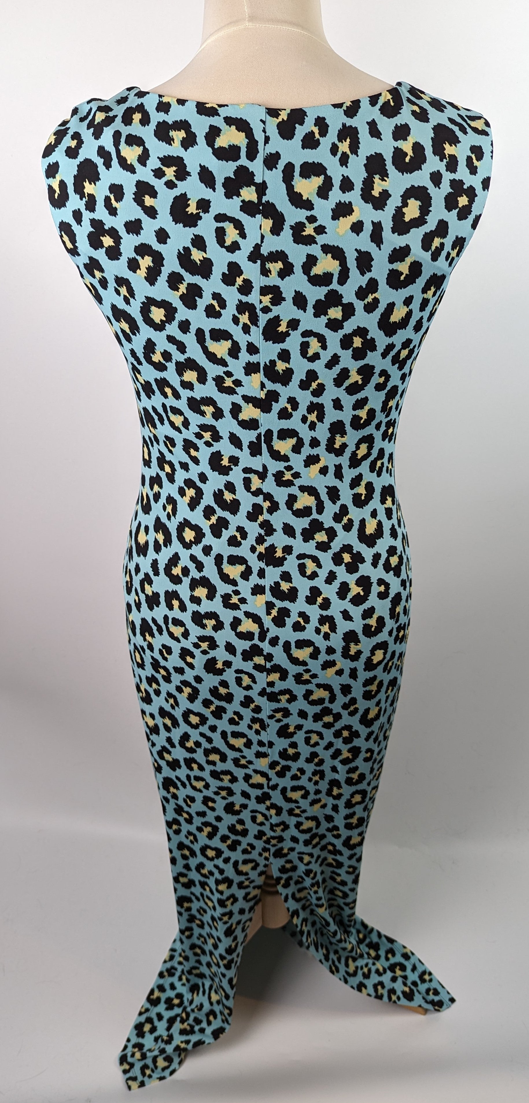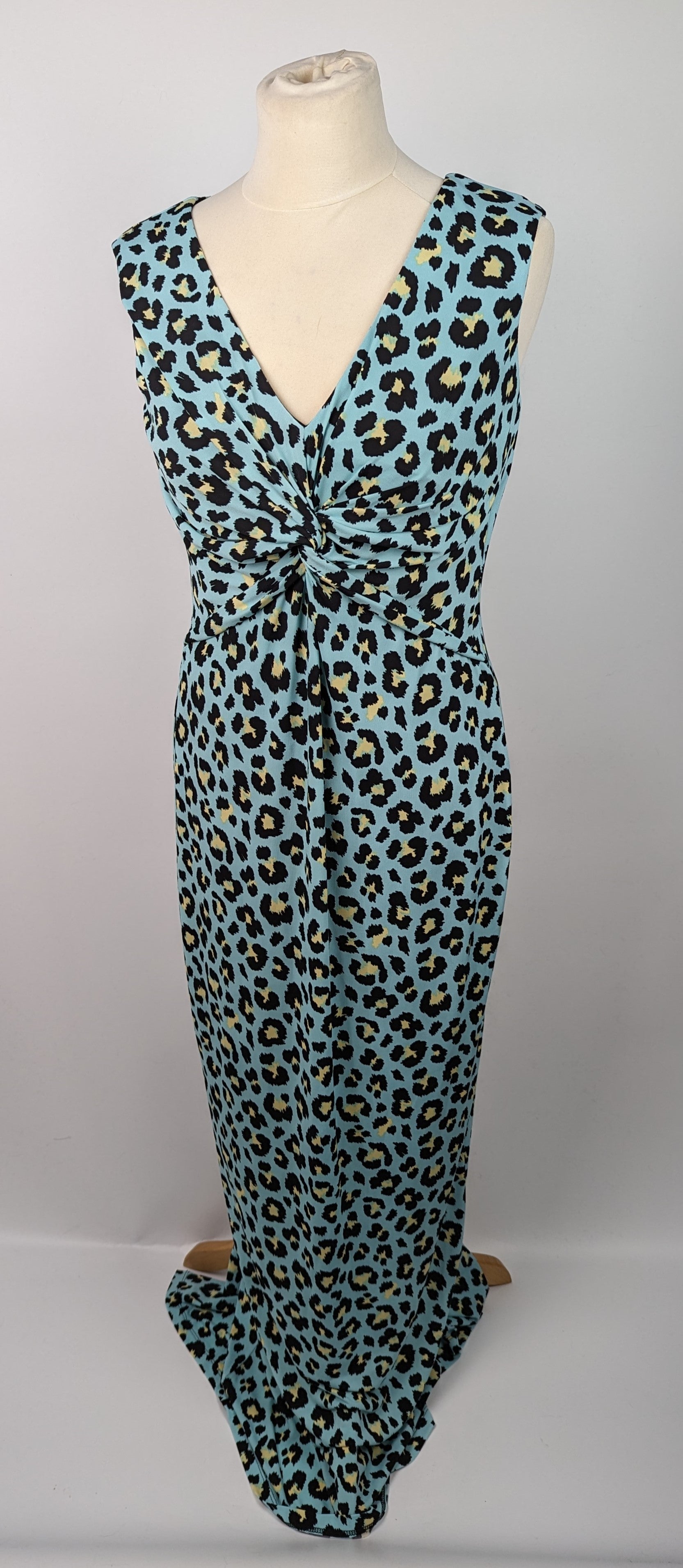 Fabulous eveningwear dress by Gina Bacconi. The Hudson maxi dress is a striking piece in a mid weight, stretch jersey fabric. Bold and colourful, the dress showcases a pale blue leopard print pattern with black and yellow detail. The fitted bodice and twist detail to the v neckline add to the classically elegant design of the piece.