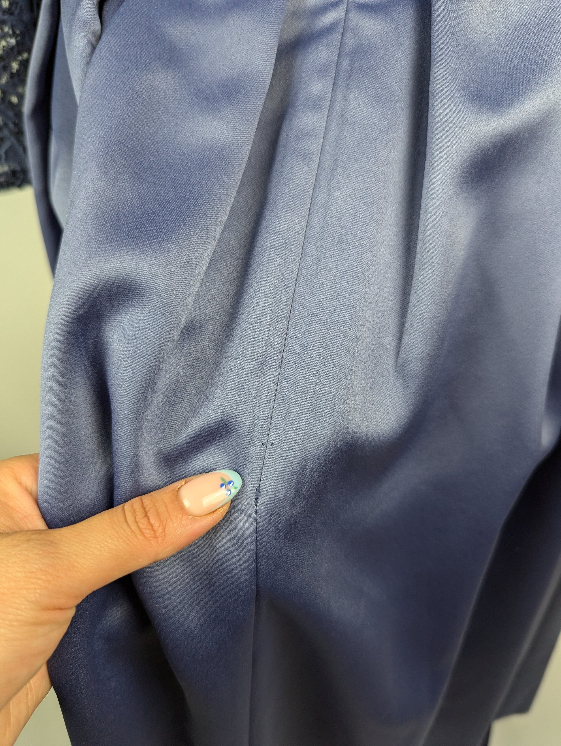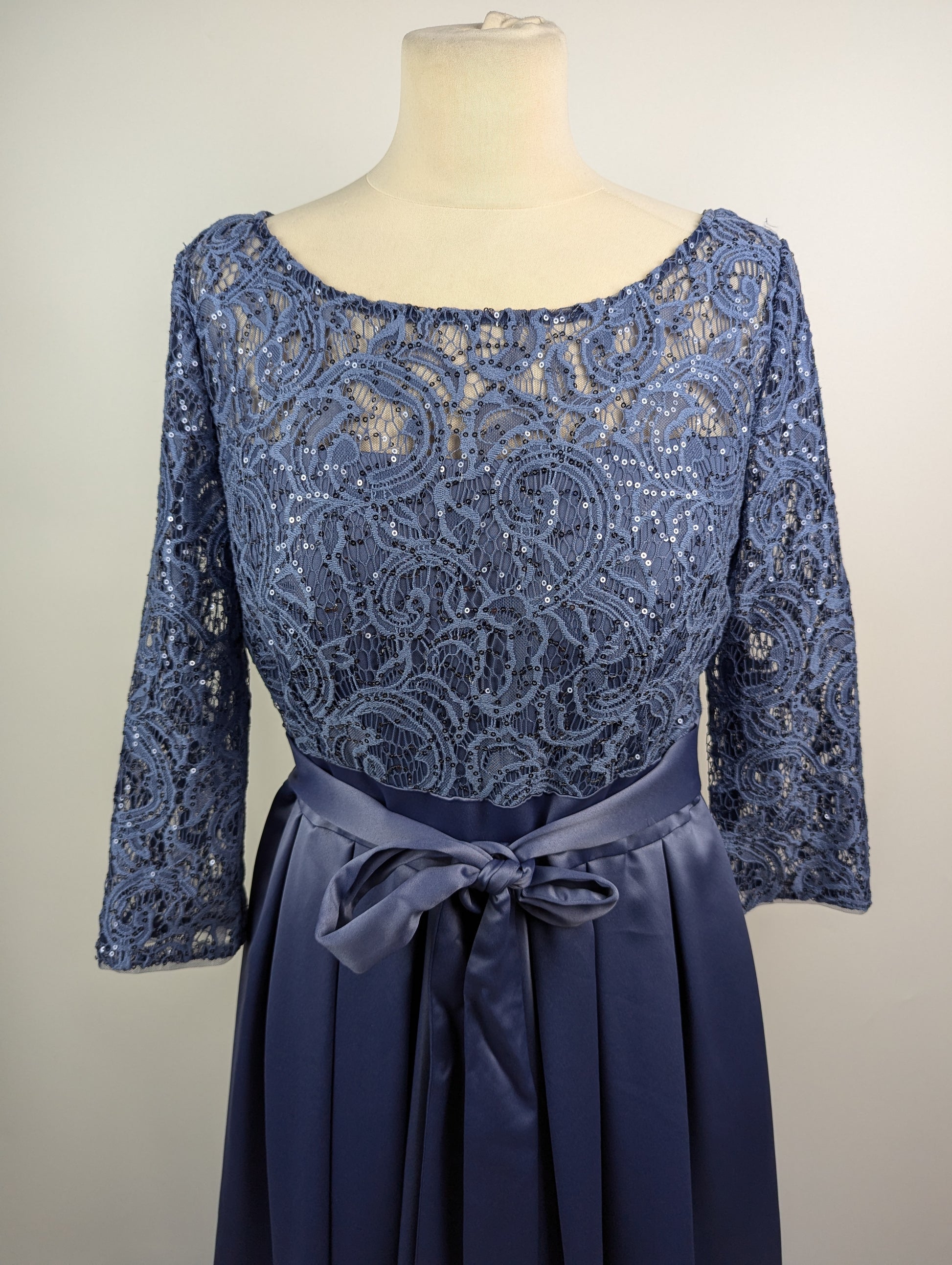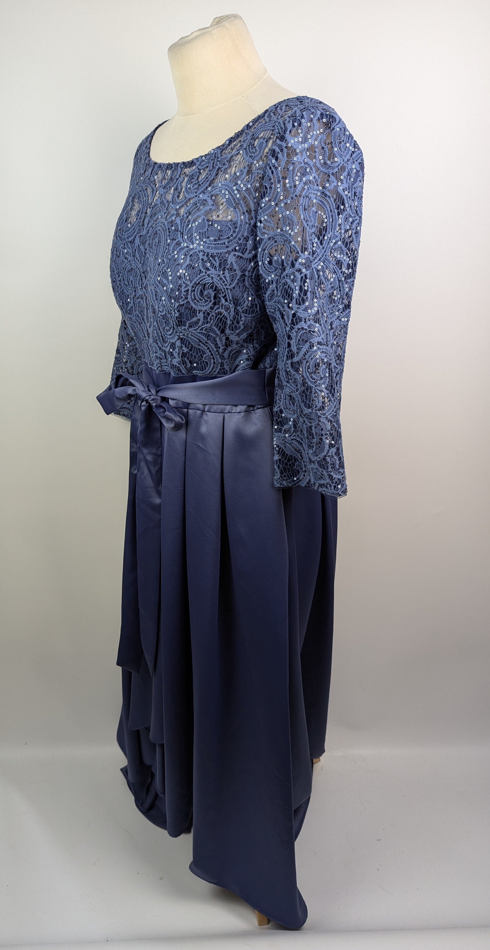 Elegant dress with a lace bodice and full hi-low satin skirt. The bodice is unlined at the sleeves and yoke. This dress has a zip at the centre back and a self fabric tie at the waist.