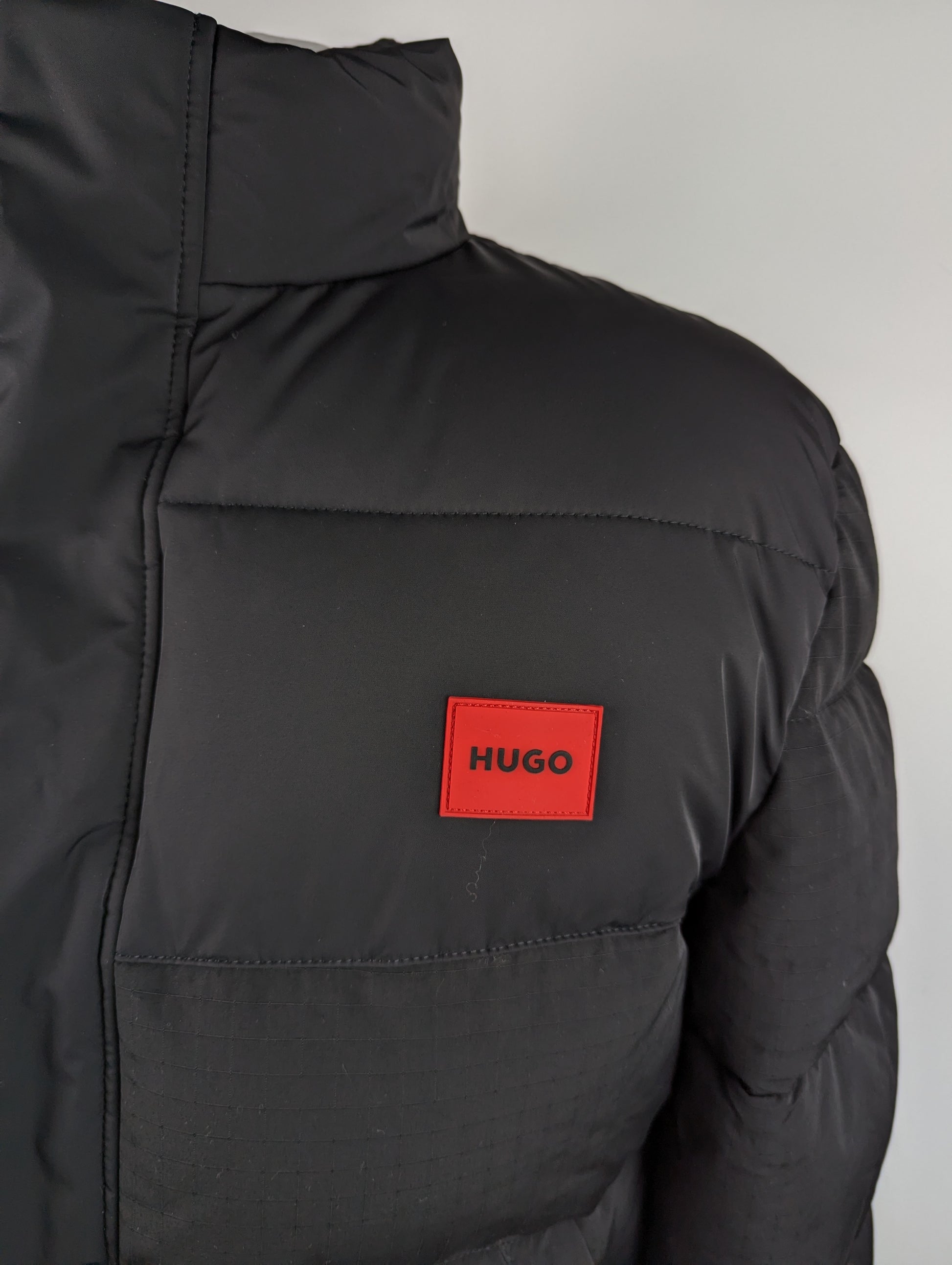 This Hugo Balto 2541 puffer jacket combines practical functionality with distinctive styling. The full-zip front closure pairs with a drawstring hem for adjustable fit, whilst dual snap-fastening pockets and an interior pocket provide secure storage. The two-tone design features contrasting plain and textured square-print panels in black, creating visual depth. Finished with elasticated cuffs for a refined silhouette.