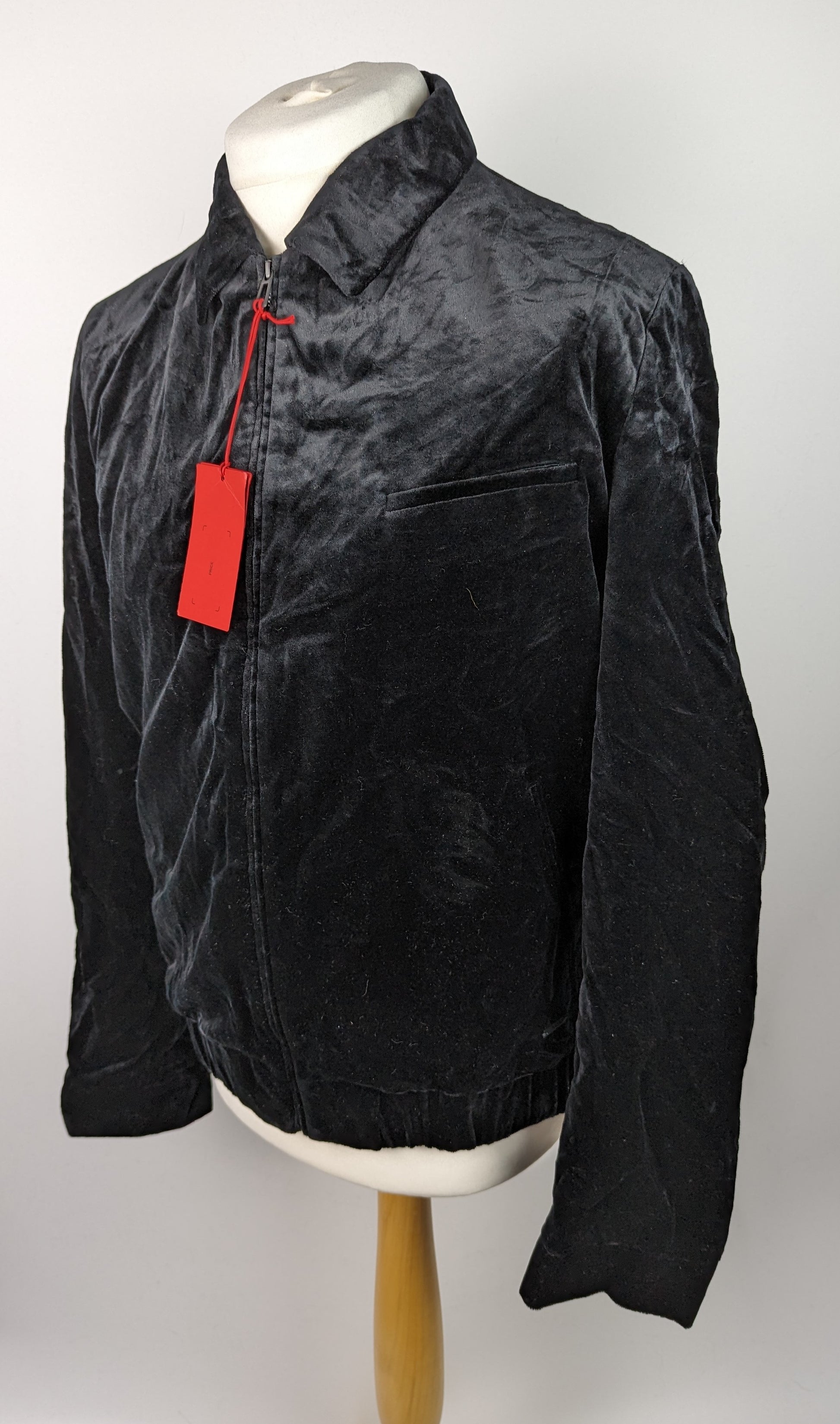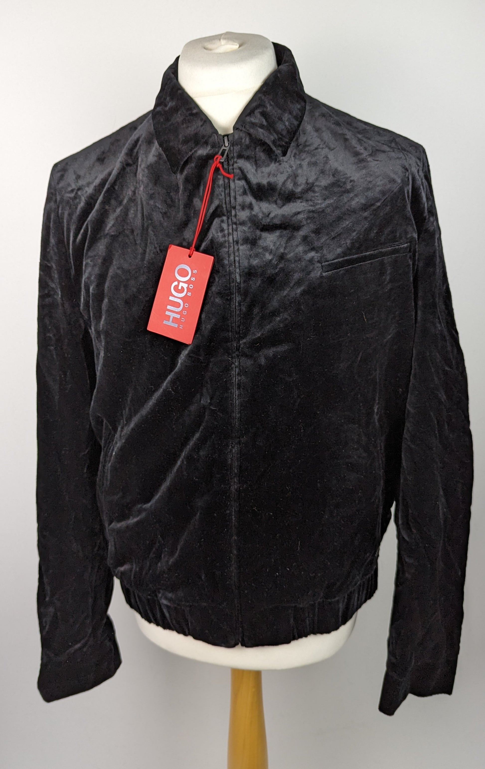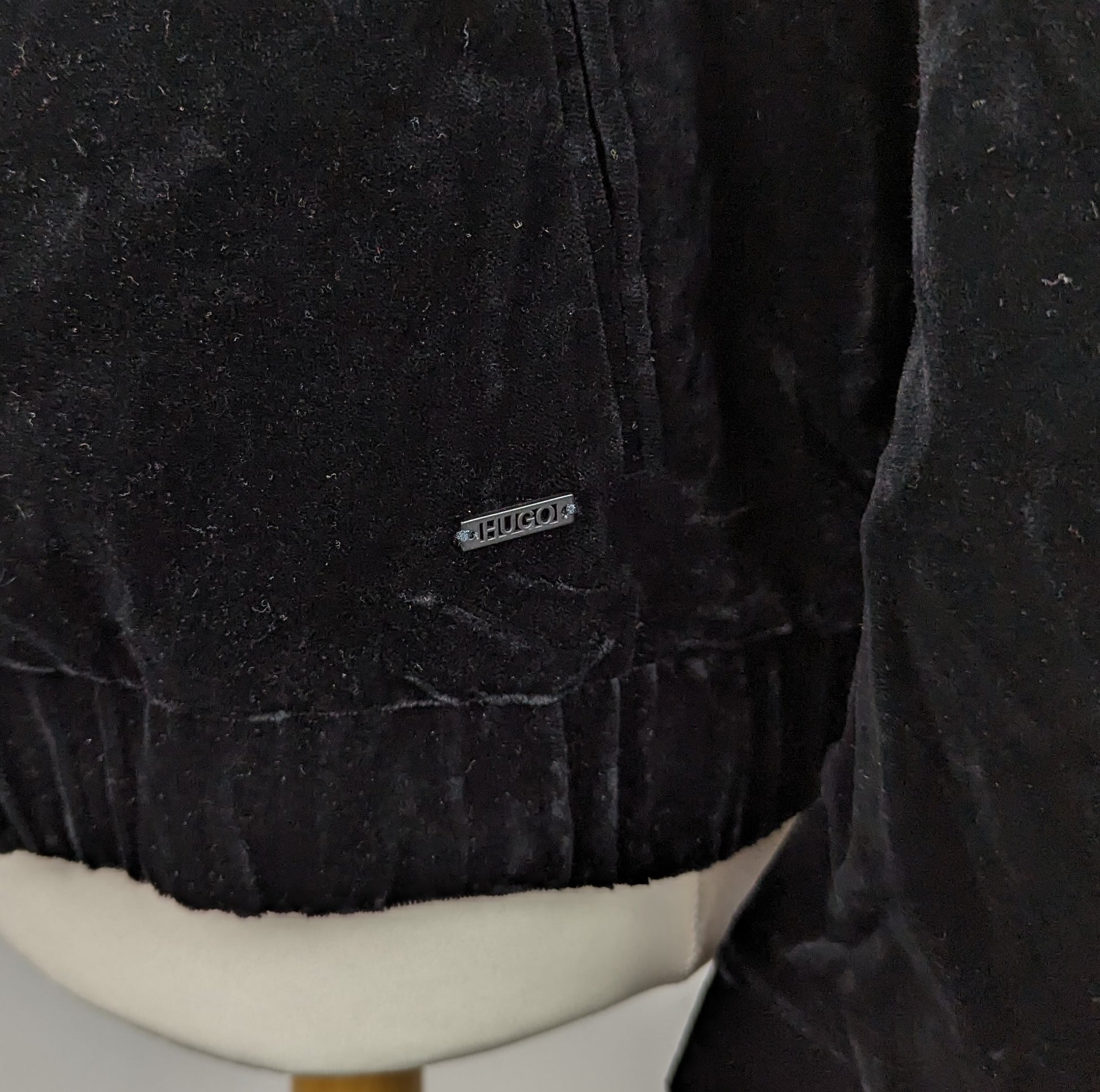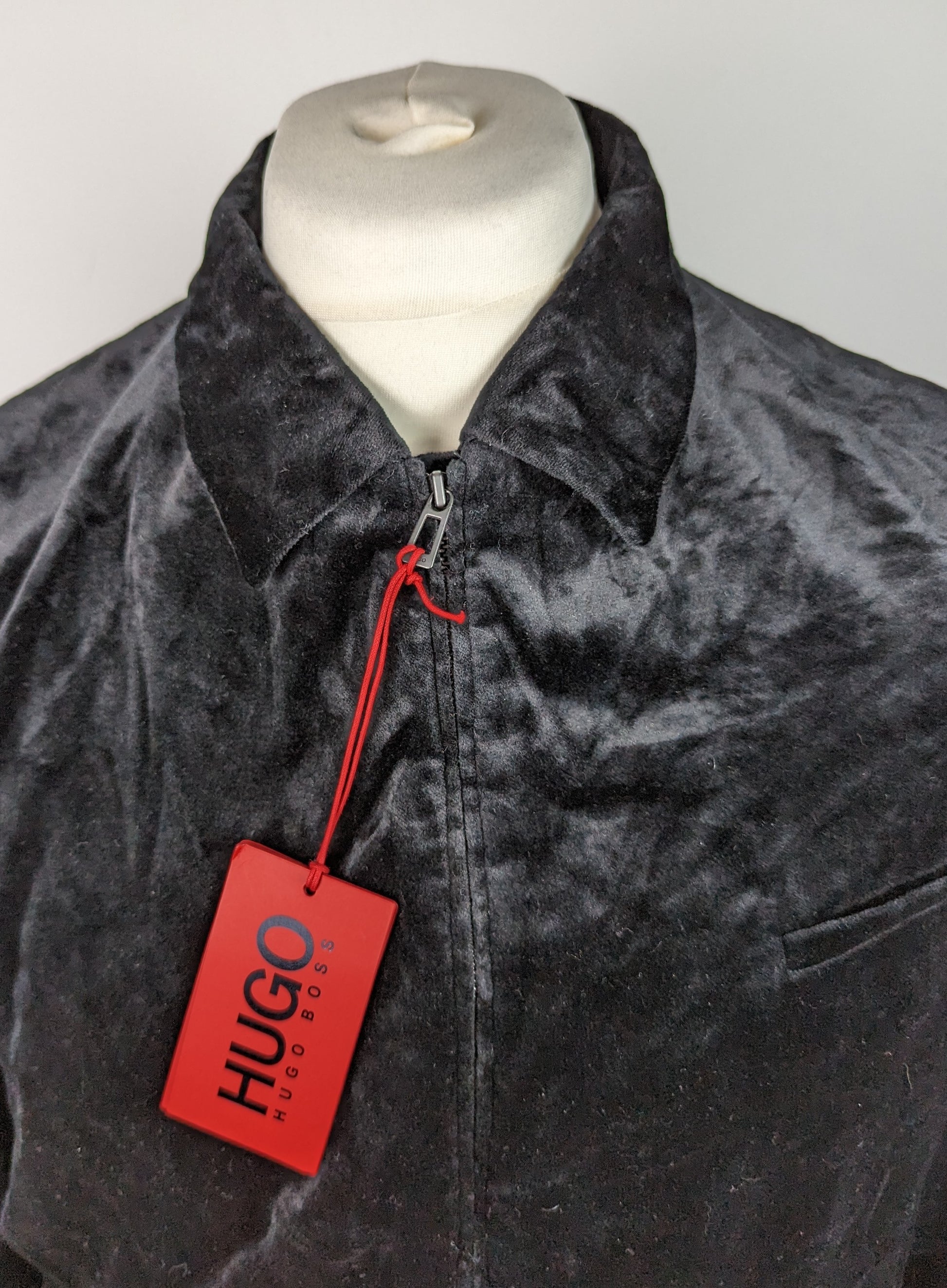 Stylish HUGO Hellis velvet jacket from Hugo Boss. A simple, versatile bomber style jacket with full length zip. Crafted in a plush black velvet effect 100% cotton fabric, the design oozes class and style, making it the perfect smart casual piece. Pockets to the chest & waist.