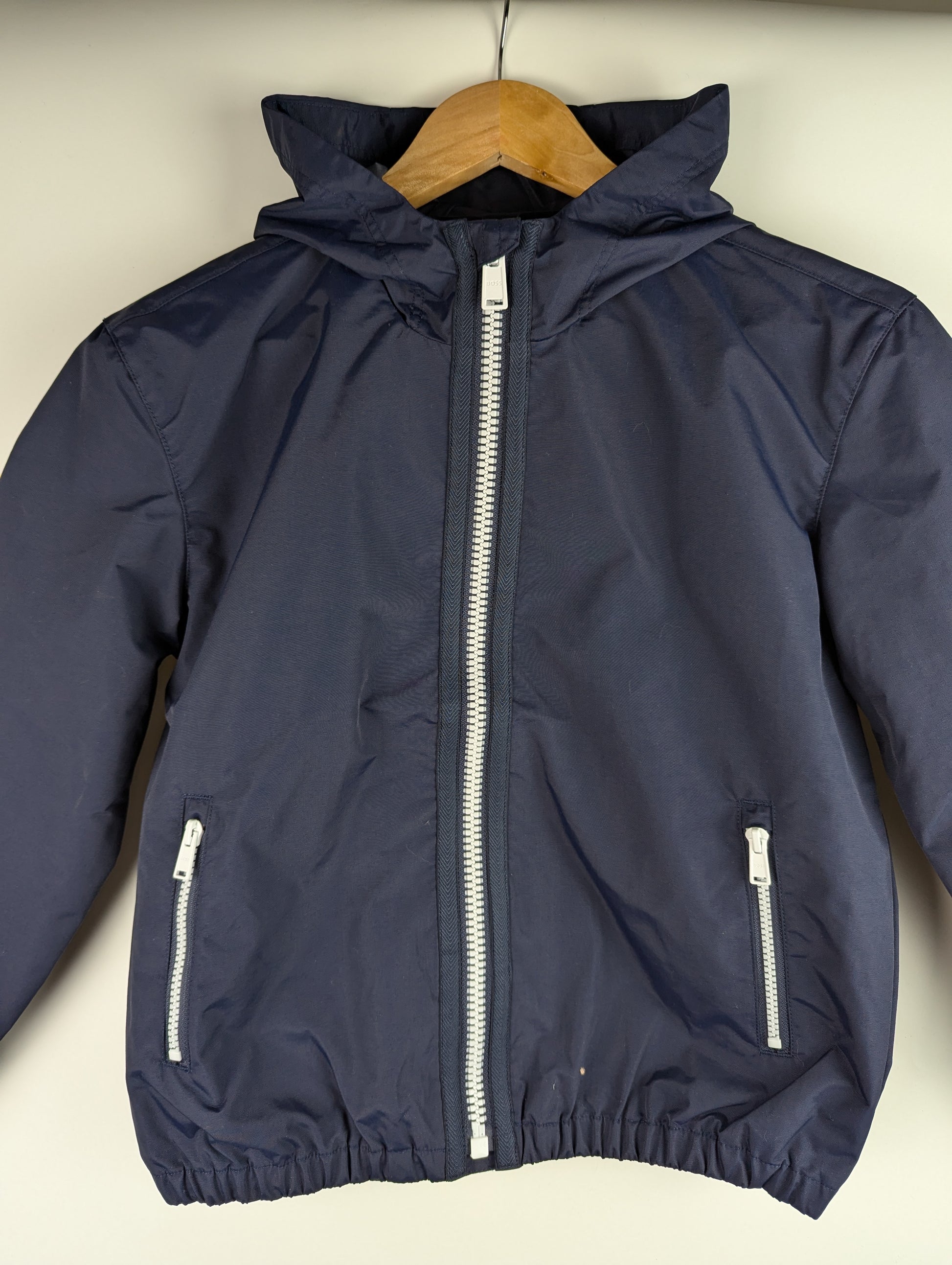 This blue and white Hugo Boss jacket for boys is lightweight and features long sleeves, a hood, a front zip fastening, side zip pockets, and elasticated cuffs and hem. The sleeve is adorned with a logo patch, adding a touch of style to the functional design.