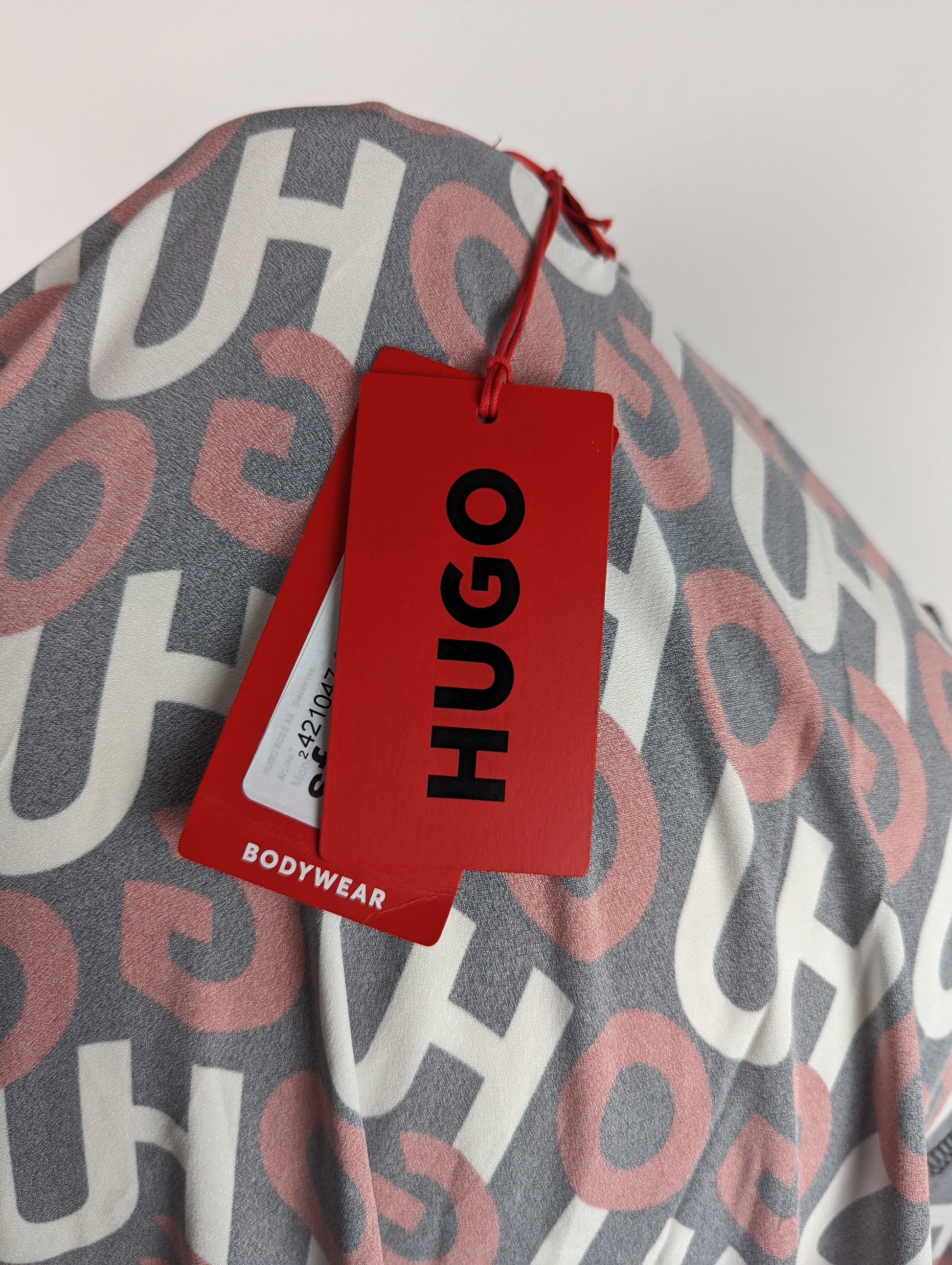 Sophisticated gentleman's robe from HUGO BOSS. With striking all over monogram logo design, this piece is the ultimate in luxury loungewear. Crafted in soft, silky 100% viscose, in contrasting shades of red, white and black. The ideal additional layer on Spring and Summer evenings.