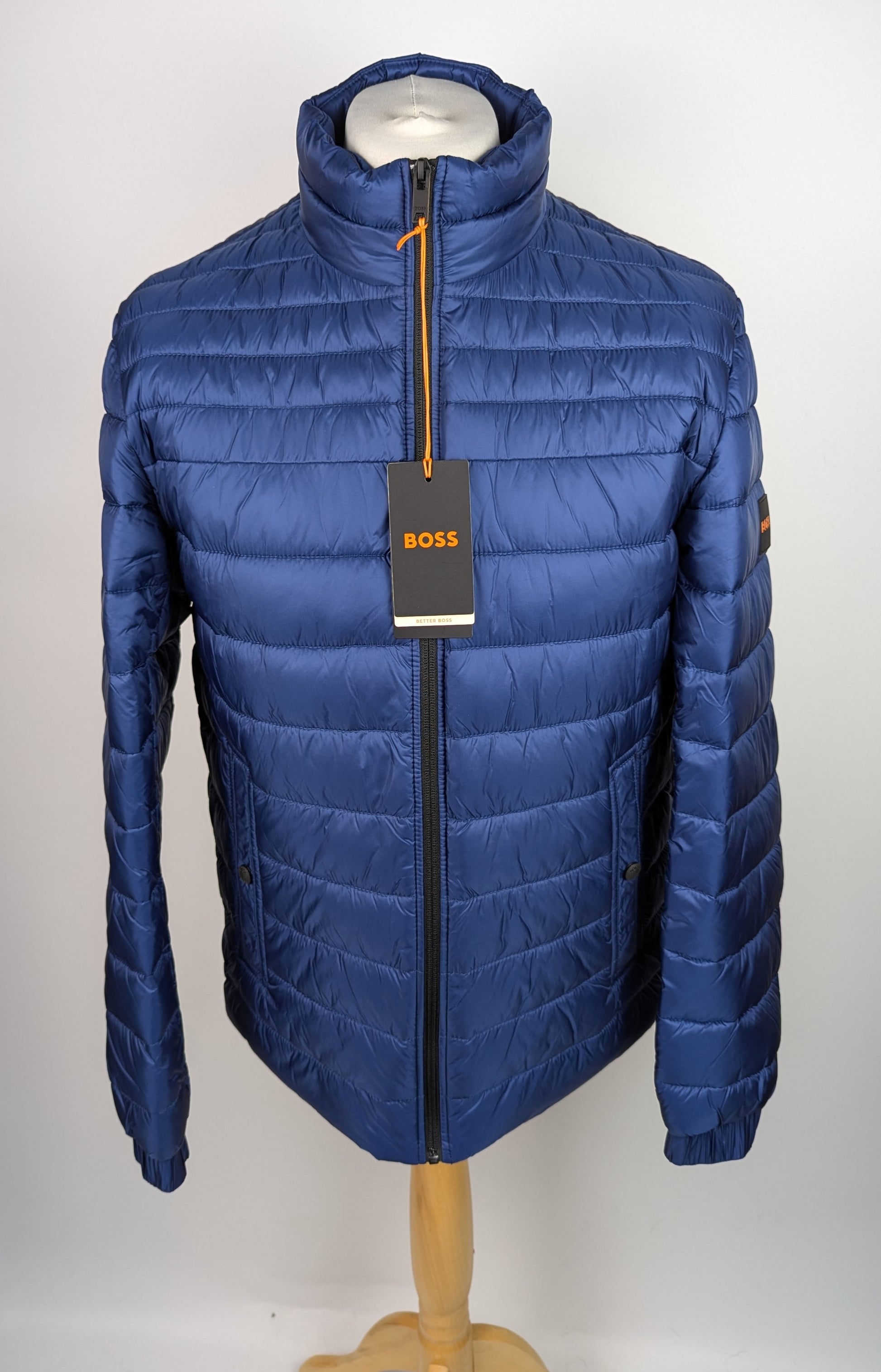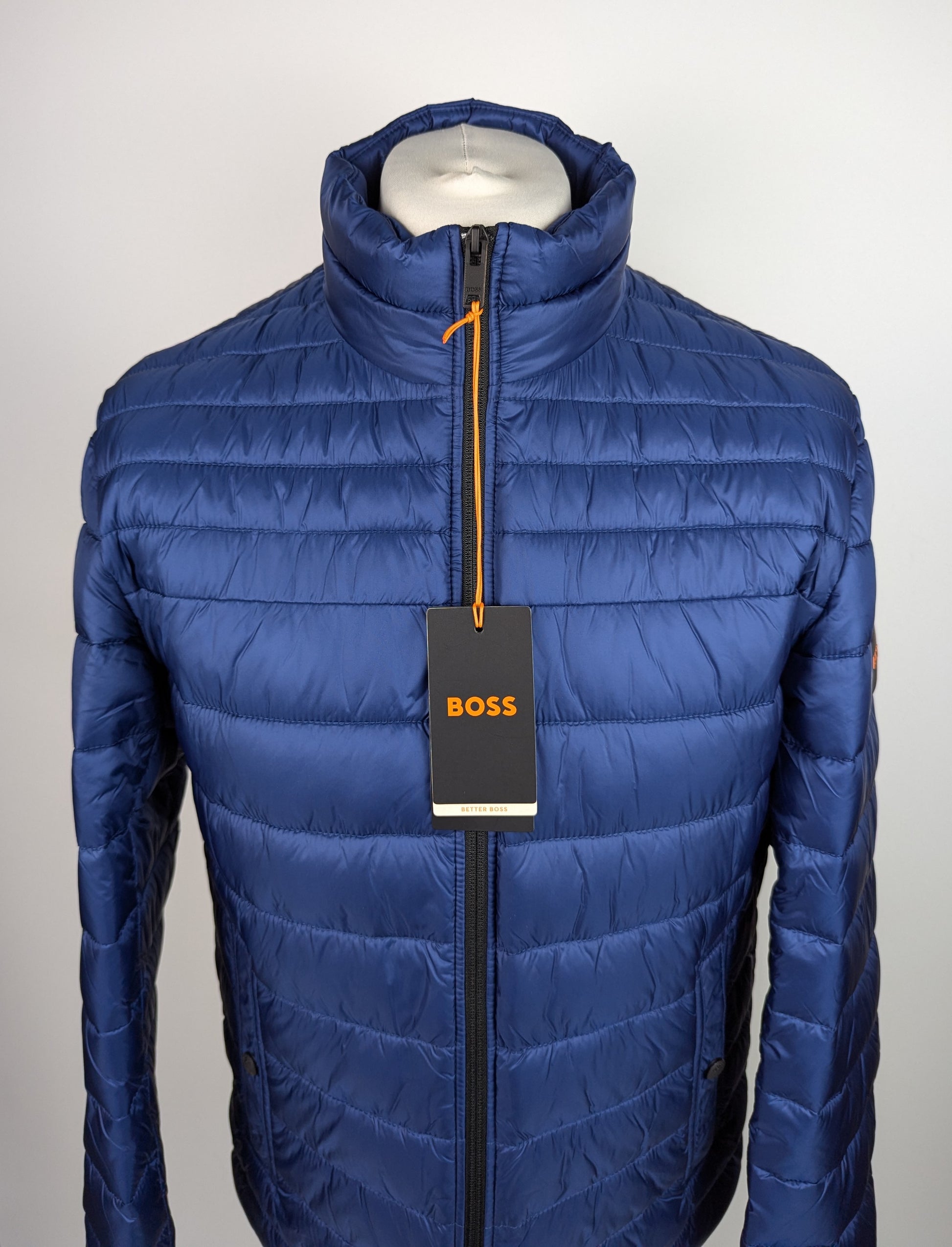 Expertly crafted by BOSS Menswear, this quilted jacket features a slim-fitting and timeless design. Made with lightweight, water-repellent material and cozy filling, it also includes a logo patch on the sleeve. Fasten with a full zip and find additional storage in the 2 press stud pockets. Slim fit.