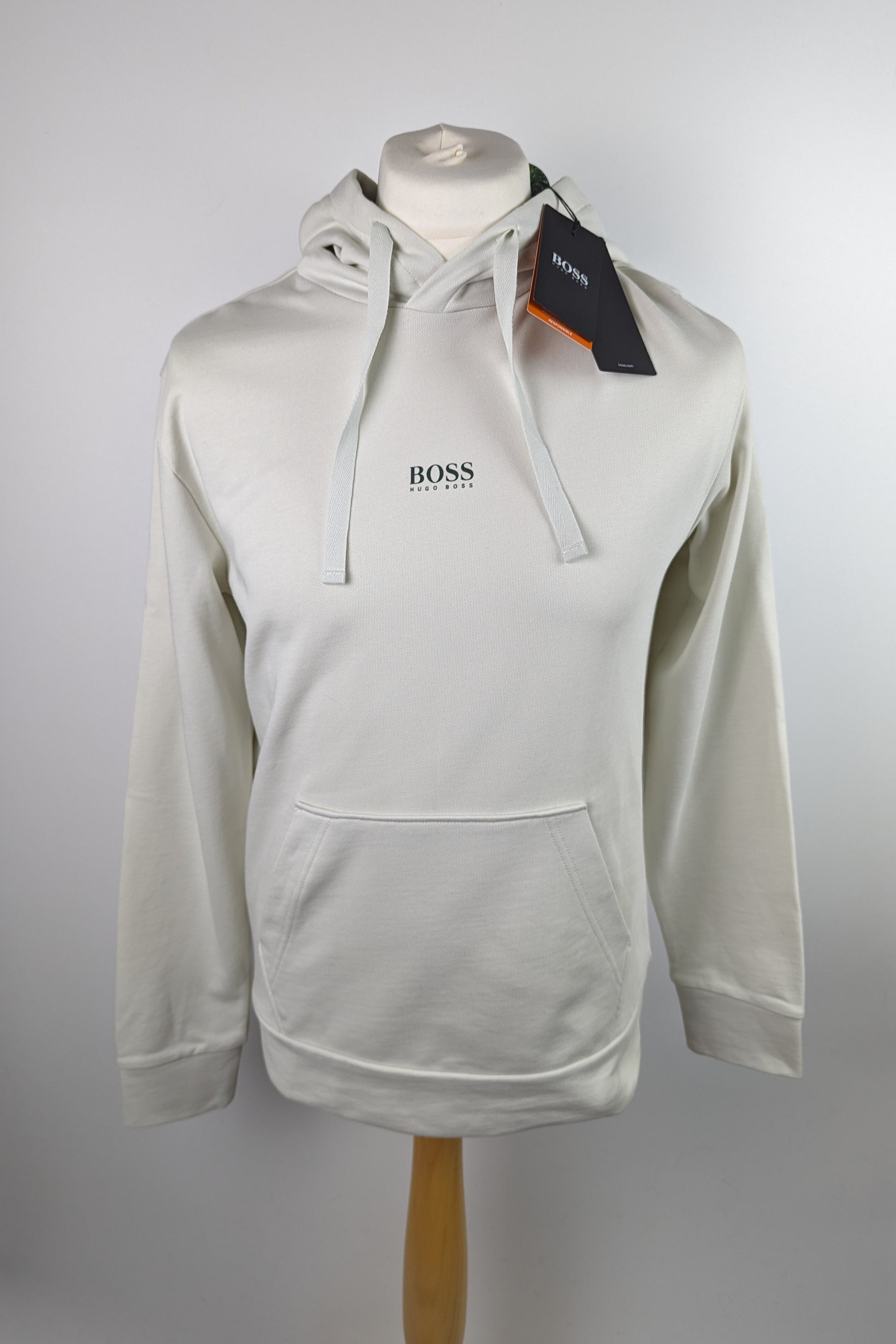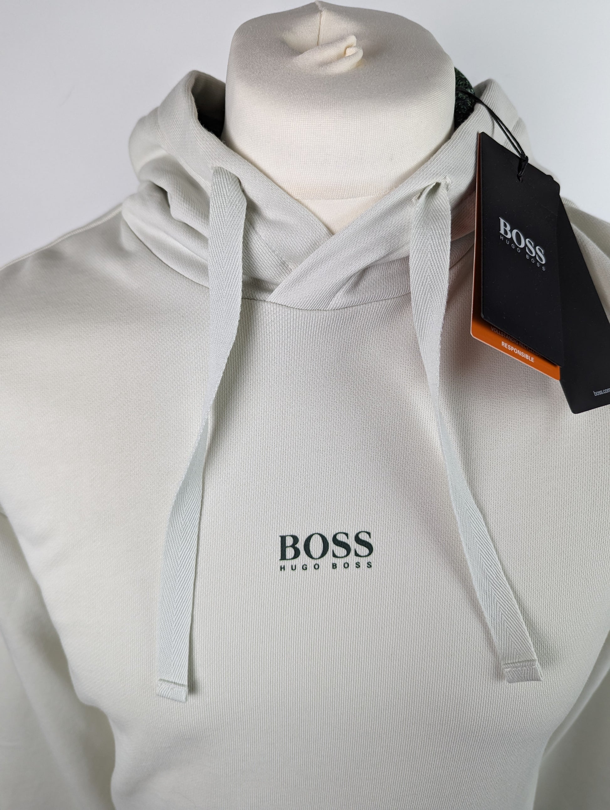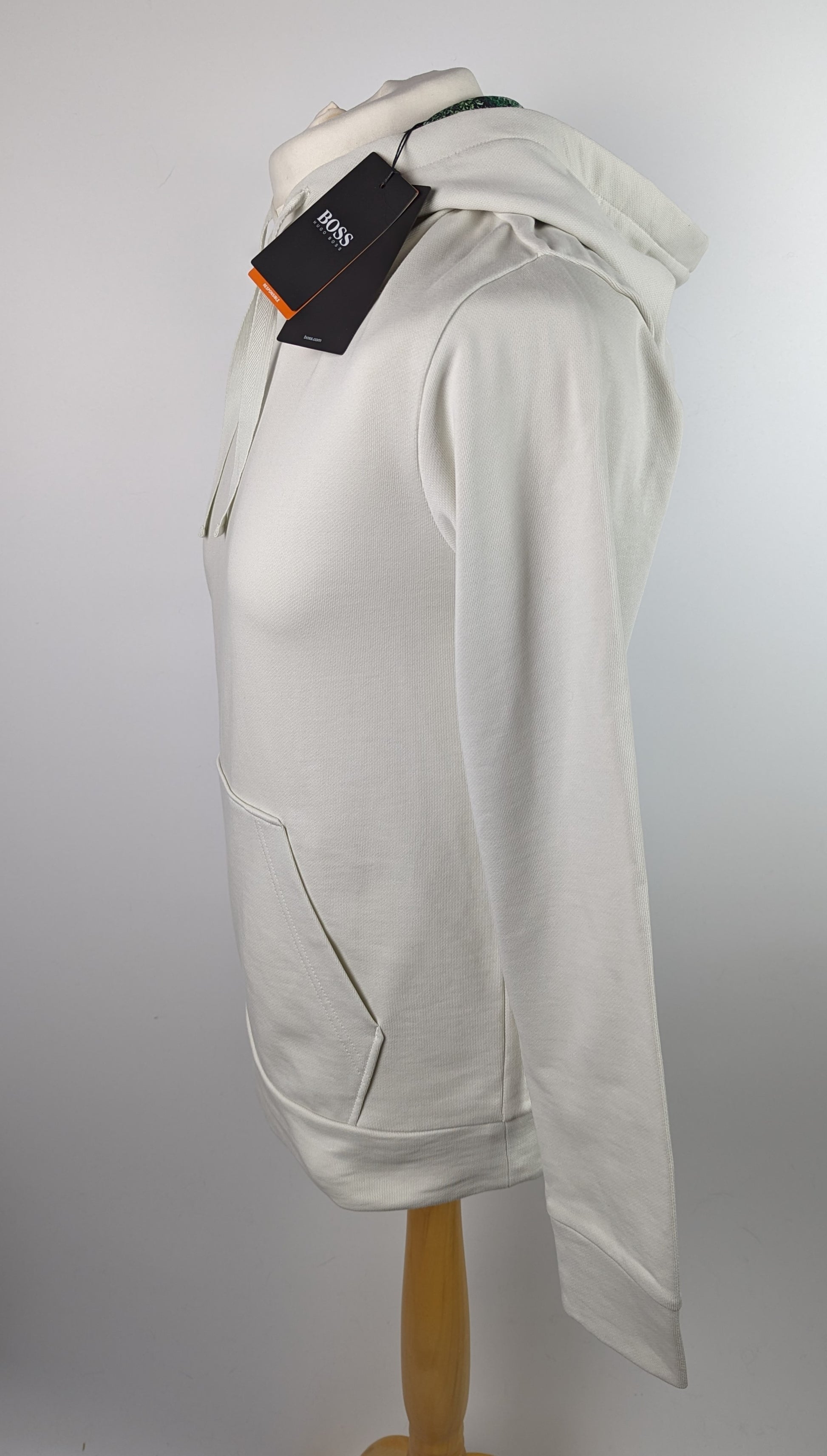 Stylish HUGO BOSS men's hooded sweater in off-white. The WFree Hoodie is crafted in quality 100% cotton, and features a small printed logo in contrasting dark green to the chest. The inside of the hood is lined with a striking forest print for that extra special added detail.