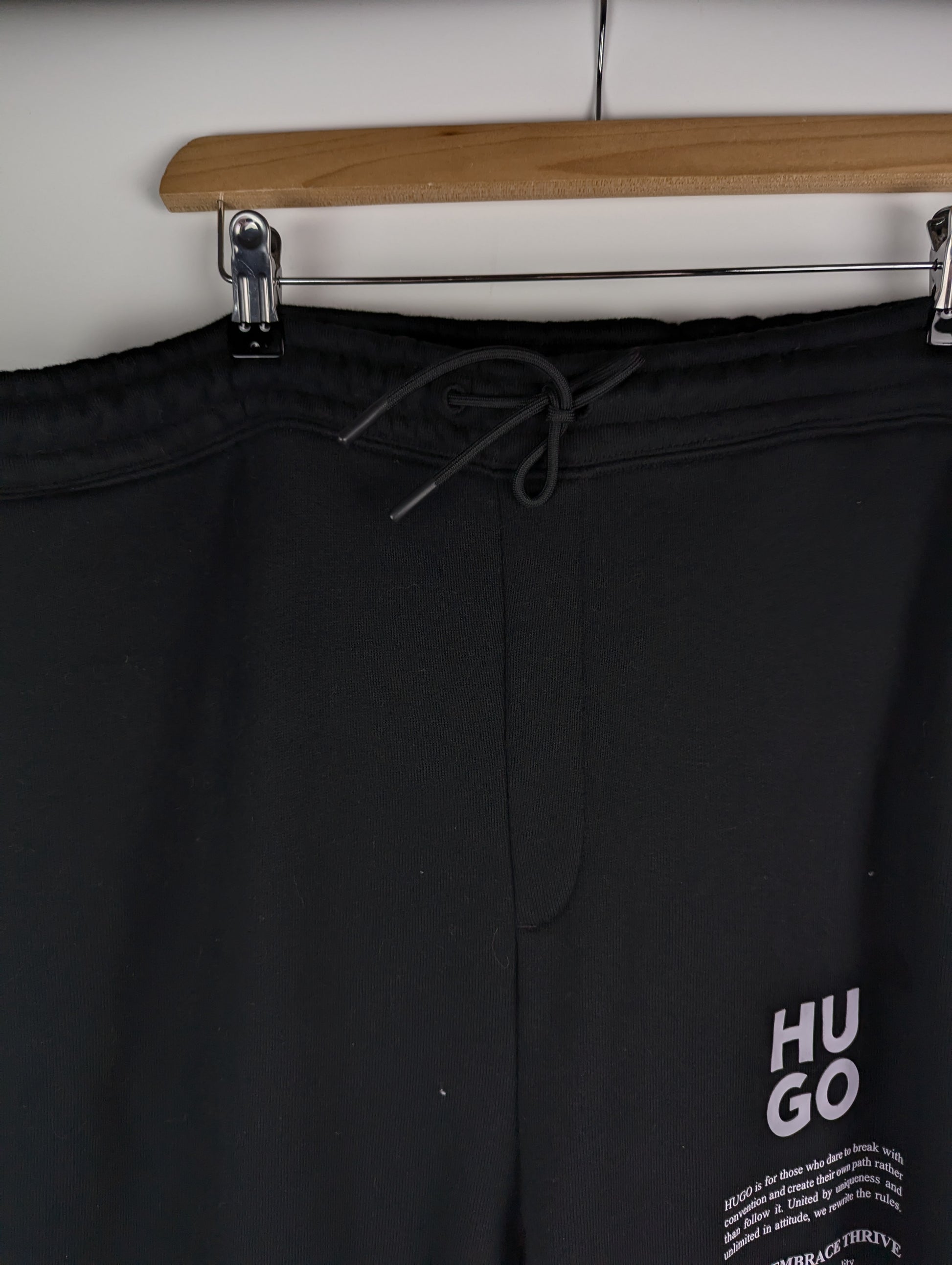 Featuring a distinctive stacked logo on the leg, these black Hugo Dapurlonga joggers combine style with functionality. The elasticated waistband with adjustable drawstring ensures a customized fit, while cuffed hems create a tailored silhouette. Practical design elements include convenient twin side pockets and a dedicated back pocket for essential storage.