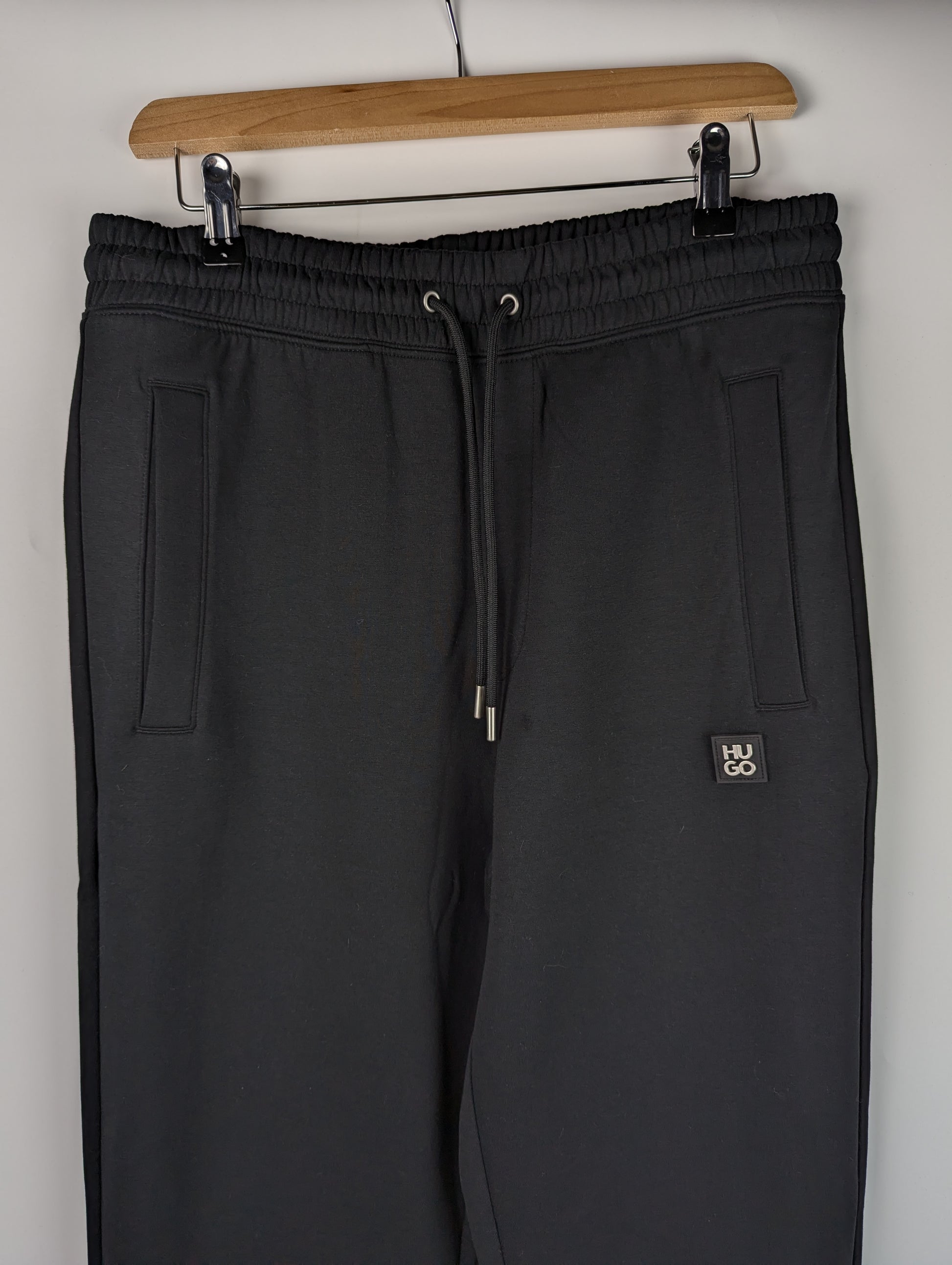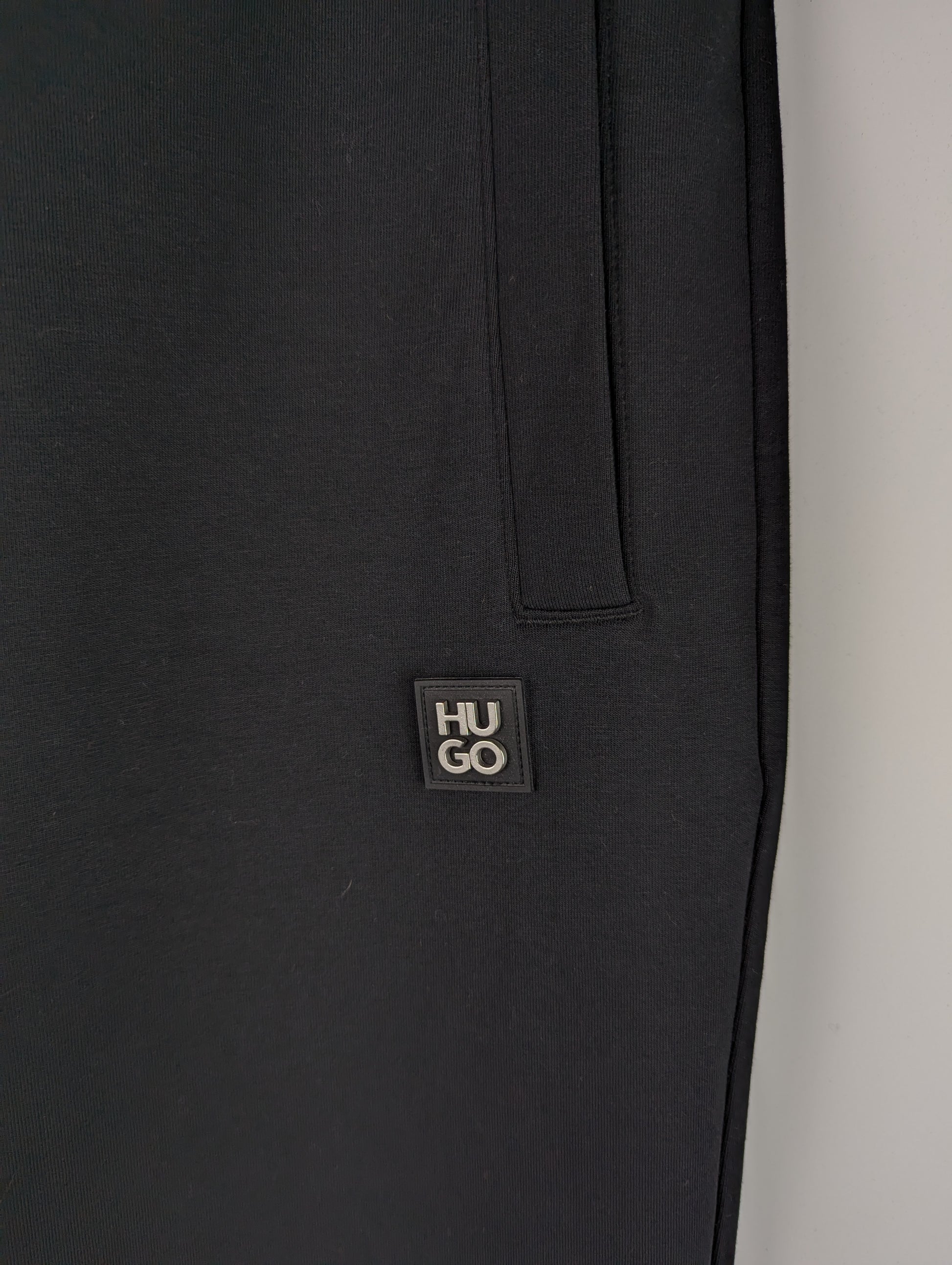 HUGO Dimacs Joggers In Black. A drawstring waistband. Two pockets at the hips with an additional pocket on the reverse right. The signature HUGO metal logo patch is featured on the left upper thigh. Ribbed ankle cuffs. 82% Cotton, 13% Polyester, 5% Elastane.