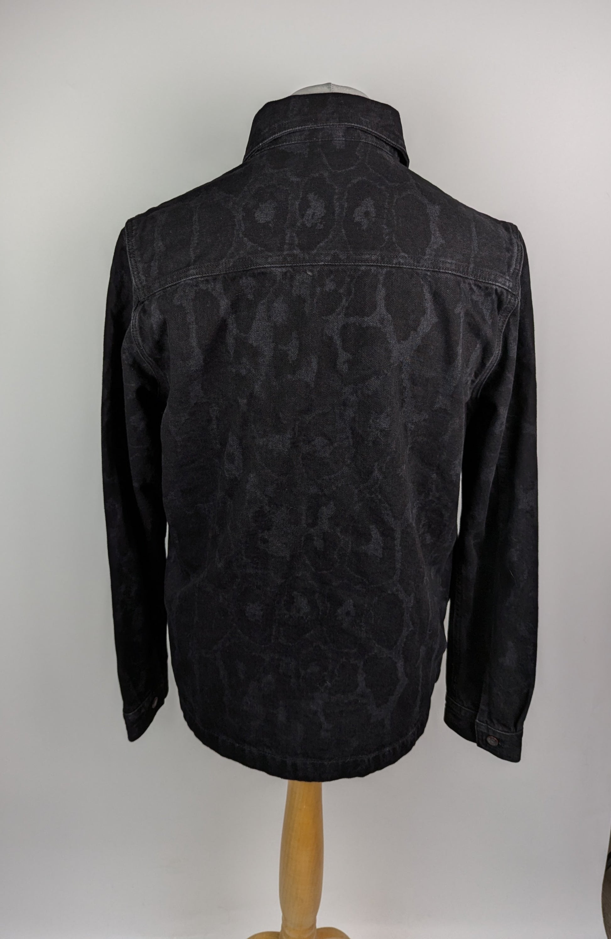This black denim overshirt features subtle marbled detailing and button closures down the front and on the cuffs. Equipped with two buttoned chest pockets, it is crafted from 100% cotton for durability and comfort. Suitable as both a jacket and an overshirt. Oversized fit.