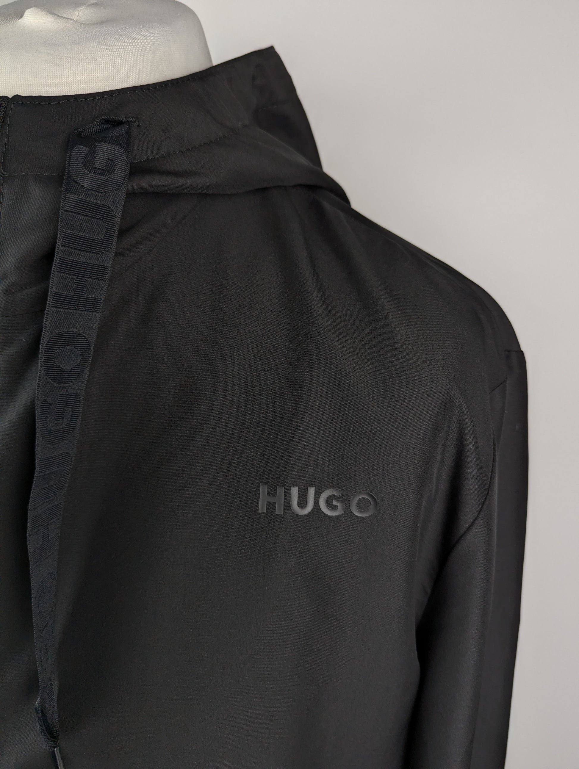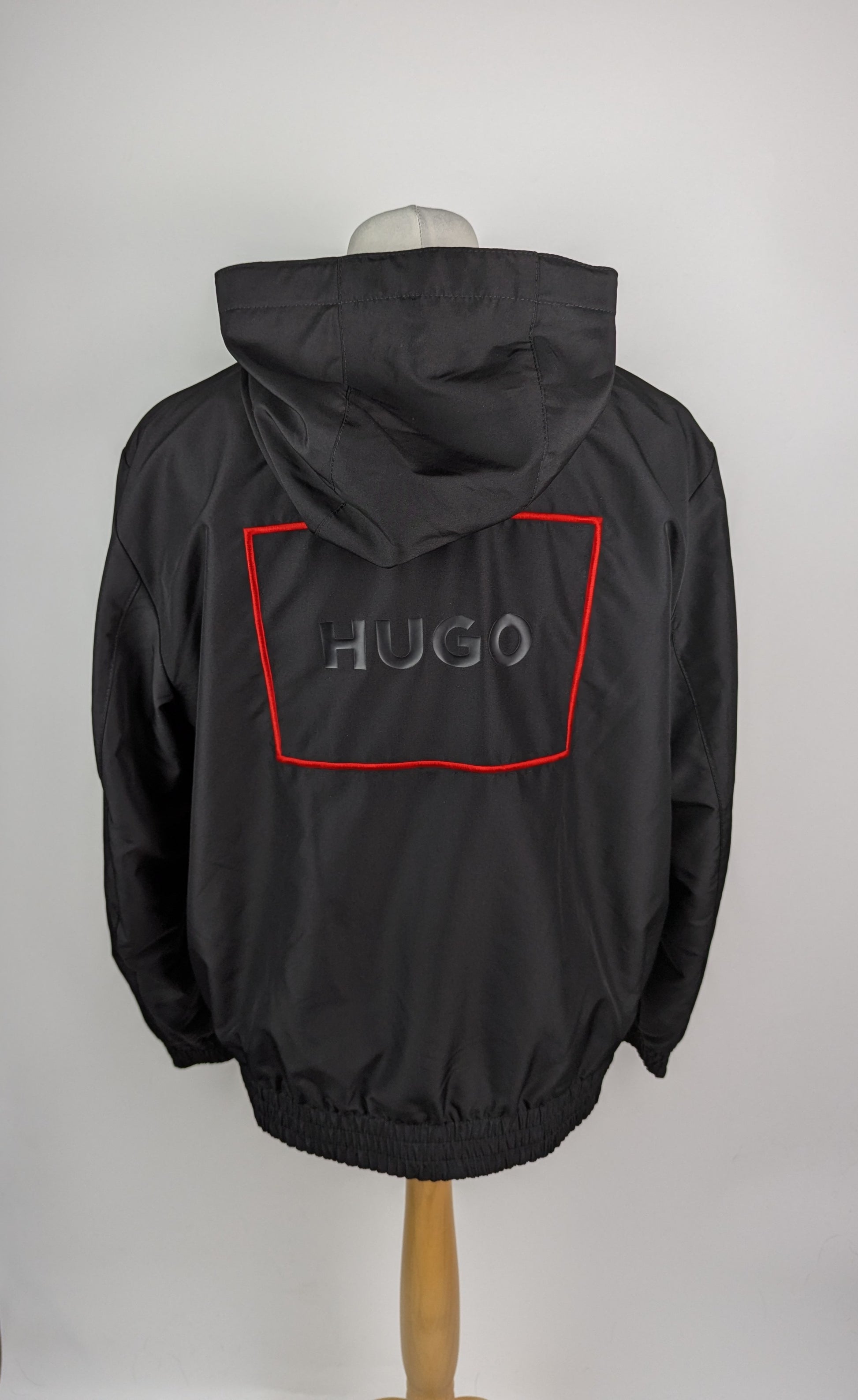 This HUGO men's jacket combines minimalist design with practical functionality. Crafted for layering, the piece features a full-zip closure, adjustable drawstring hood, and elasticated cuffs and waistband for a secure fit. Two snap-fastened pockets provide convenient storage, whilst the signature logo on the back—finished with distinctive red boxed stitching. Small logo on the chest aswell. Oversized fit.